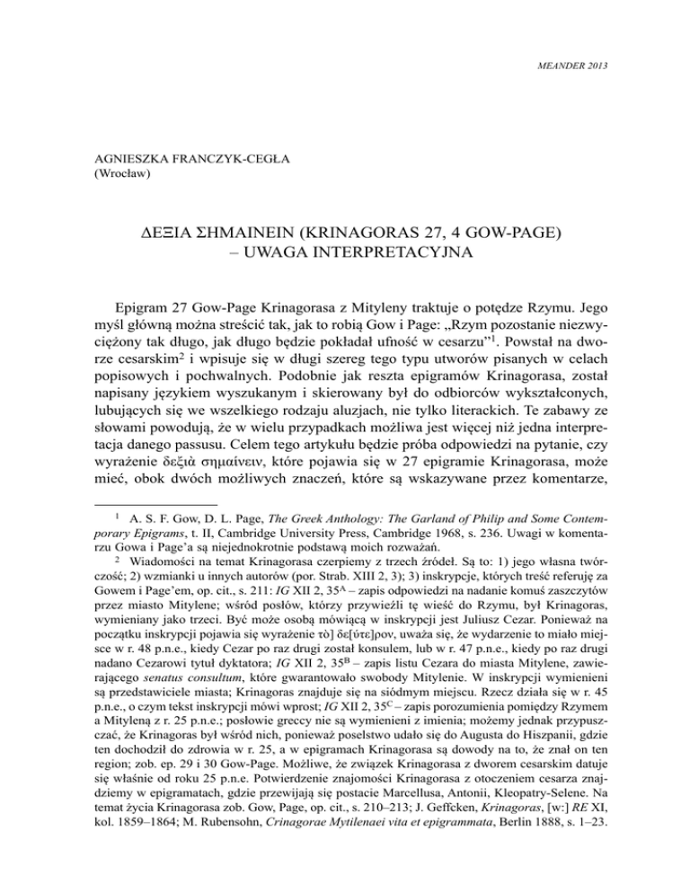 MEANDER 2013 AGNIESZKA FRANCZYK-CEGŁA (Wrocław) ΔΕΞΙΑ ΣΗΜΑΙΝΕΙΝ (KRINAGORAS 27, 4 GOW-PAGE) – UWAGA INTERPRETACYJNA Epigram 27 Gow-Page Krinagorasa z Mityleny traktuje o potędze Rzymu. Jego myśl główną można streścić tak, jak to robią Gow i Page: „Rzym pozostanie niezwyciężony tak długo, jak długo będzie pokładał ufność w cesarzu”1. Powstał na dworze cesarskim2 i wpisuje się w długi szereg tego typu utworów pisanych w celach popisowych i pochwalnych. Podobnie jak reszta epigramów Krinagorasa, został napisany językiem wyszukanym i skierowany był do odbiorców wykształconych, lubujących się we wszelkiego rodzaju aluzjach, nie tylko literackich. Te zabawy ze słowami powodują, że w wielu przypadkach możliwa jest więcej niż jedna interpretacja danego passusu. Celem tego artykułu będzie próba odpowiedzi na pytanie, czy wyrażenie δεξιὰ σημαίνειν, które pojawia się w 27 epigramie Krinagorasa, może mieć, obok dwóch możliwych znaczeń, które są wskazywane przez komentarze, 1 A. S. F. Gow, D. L. Page, The Greek Anthology: The Garland of Philip and Some Contemporary Epigrams, t. II, Cambridge University Press, Cambridge 1968, s. 236. Uwagi w komentarzu Gowa i Page’a są niejednokrotnie podstawą moich rozważań. 2 Wiadomości na temat Krinagorasa czerpiemy z trzech źródeł. Są to: 1) jego własna twórczość; 2) wzmianki u innych autorów (por. Strab. XIII 2, 3); 3) inskrypcje, których treść referuję za Gowem i Page’em, op. cit., s. 211: IG XII 2, 35A – zapis odpowiedzi na nadanie komuś zaszczytów przez miasto Mitylene; wśród posłów, którzy przywieźli tę wieść do Rzymu, był Krinagoras, wymieniany jako trzeci. Być może osobą mówiącą w inskrypcji jest Juliusz Cezar. Ponieważ na początku inskrypcji pojawia się wyrażenie τὸ] δε[ύτε]ρον, uważa się, że wydarzenie to miało miejsce w r. 48 p.n.e., kiedy Cezar po raz drugi został konsulem, lub w r. 47 p.n.e., kiedy po raz drugi nadano Cezarowi tytuł dyktatora; IG XII 2, 35B – zapis listu Cezara do miasta Mitylene, zawierającego senatus consultum, które gwarantowało swobody Mitylenie. W inskrypcji wymienieni są przedstawiciele miasta; Krinagoras znajduje się na siódmym miejscu. Rzecz działa się w r. 45 p.n.e., o czym tekst inskrypcji mówi wprost; IG XII 2, 35C – zapis porozumienia pomiędzy Rzymem a Mityleną z r. 25 p.n.e.; posłowie greccy nie są wymienieni z imienia; możemy jednak przypuszczać, że Krinagoras był wśród nich, ponieważ poselstwo udało się do Augusta do Hiszpanii, gdzie ten dochodził do zdrowia w r. 25, a w epigramach Krinagorasa są dowody na to, że znał on ten region; zob. ep. 29 i 30 Gow-Page. Możliwe, że związek Krinagorasa z dworem cesarskim datuje się właśnie od roku 25 p.n.e. Potwierdzenie znajomości Krinagorasa z otoczeniem cesarza znajdziemy w epigramatach, gdzie przewijają się postacie Marcellusa, Antonii, Kleopatry-Selene. Na temat życia Krinagorasa zob. Gow, Page, op. cit., s. 210–213; J. Geffcken, Krinagoras, [w:] RE XI, kol. 1859–1864; M. Rubensohn, Crinagorae Mytilenaei vita et epigrammata, Berlin 1888, s. 1–23. 32 Agnieszka Franczyk-Cegła znaczenie trzecie, które funkcjonuje w tym utworze jako znaczenie poboczne i nie wyklucza występowania dwóch pierwszych interpretacji. Oto cały epigram, wraz z jego polskim tłumaczeniem3: οὐδ᾿ ἢν Ὠκεανὸς πᾶσαν πλήμυραν ἐγείρῃ οὐδ᾿ ἢν Γερμανίη Ῥῆνον ἅπαντα πίῃ, Ῥώμης δ᾿ οὐδ᾿ ὅσσον βλάψει σθένος, ἄχρι κε μίμνῃ δ ε ξ ι ὰ σ η μ α ί ν ε ι ν Καίσαρι θαρσαλέη. οὕτως καὶ ἱεραὶ Ζηνὸς δρύες ἔμπεδα ῥίζαις ἑστᾶσιν, φύλλων δ᾿ αὖα χέουσ᾿ ἄνεμοι. Nawet jeśli runęłyby nawały całej wody z Oceanu, nawet jeśli Germania wypiłaby cały Ren, siła Rzymu nie zmniejszy się, tak długo jak pozostanie on ufny w opiekę Cezara. Tak i święte dęby Zeusa stoją zakorzenione niewzruszenie, gdy wiatr porywa uschnięte liście. Wyrażenie δεξιὰ σημαίνειν oznacza ‘wydawać rozkazy, których wykonanie zakończyło się sukcesem’ lub ‘pomyślnie wróżyć, dawać pomyślne znaki’. Obie te interpretacje nie wykluczają się wzajemnie; wers δεξιὰ σημαίνειν Καίσαρι θαρσαλέη możemy odczytywać jako „ufający cesarzowi, że [ten] wyda dobry rozkaz” lub „ufający cesarzowi, że [ten] będzie sprawcą pomyślnych znaków”. Brak jednoznacznej interpretacji nie zmienia myśli autora, której sens sprowadza się do twierdzenia, że Rzym pozostanie niezwyciężony, dopóki cesarz będzie miał go w swojej opiece. Δεξιὰ σημαίνειν może być również poetyckim nawiązaniem do motywu ubóstwienia, którego symbolem była gwiazda. Ku takiemu odczytaniu skłaniają nas następujące argumenty: 1) epigram został najprawdopodobniej napisany w roku 15 lub 16 n.e.; 2) prawdopodobnie Krinagoras w dwóch pierwszych wersach epigramu nawiązuje do kampanii Germanika, co mogło doprowadzić słuchaczy do odczytania wspomnianej poniżej aluzji do Aratosa, ponieważ Germanik sam przetłumaczył Phainomena; 3) fraza δεξιὰ σημαίνειν, jak zauważa Hugo Stadtmüller4, nawiązuje do poematu Aratosa Phainomena, co pociąga za sobą między innymi porównanie cesarza z Zeusem i aluzje astronomiczne; 4) porównanie ubóstwionego Juliusza Cezara oraz Augusta do gwiazdy funkcjonowało w literaturze augustowskiej jako locus communis. Biorąc pod uwagę te okoliczności, można założyć, że Krinagoras, chcąc uhonorować cesarza, ku chwale którego pisał epigramaty przez całe swoje życie, twierdzi, 3 Polskie tłumaczenie własne. Tłumaczenie Gowa i Page’a, op. cit., t. I, s. 215: „Not even though Ocean rouse all her flood, not even though Germany