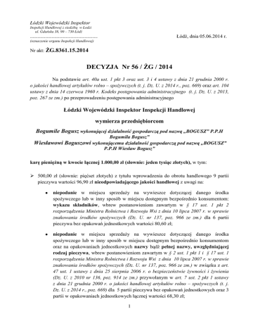 Łódzki Wojewódzki Inspektor Inspekcji Handlowej z siedzibą w Łodzi ul. Gdańska 38, 90 – 730 Łódź Łódź, dnia 05.06.2014 r. ..................................................... (oznaczenie organu Inspekcji Handlowej) Nr akt: ŻG.8361.15.2014 DECYZJA Nr 56 / ŻG / 2014 Na podstawie art. 40a ust. 1 pkt 3 oraz ust. 3 i 4 ustawy z dnia 21 grudnia 2000 r. o jakości handlowej artykułów rolno – spożywczych (t. j. Dz. U. z 2014 r., poz. 669) oraz art. 104 ustawy z dnia 14 czerwca 1960 r. Kodeks postępowania administracyjnego (t. j. Dz. U. z 2013, poz. 267 ze zm.) po przeprowadzeniu postępowania administracyjnego Łódzki Wojewódzki Inspektor Inspekcji Handlowej wymierza przedsiębiorcom Bogumile Bogusz wykonującej działalność gospodarczą pod nazwą „BOGUSZ” P.P.H Bogumiła Bogusz” Wiesławowi Boguszowi wykonującemu działalność gospodarczą pod nazwą „BOGUSZ” P.P.H Wiesław Bogusz” karę pieniężną w kwocie łącznej 1.000,00 zł (słownie: jeden tysiąc złotych), w tym: 500,00 zł (słownie: pięćset złotych) z tytułu wprowadzenia do obrotu handlowego 9 partii pieczywa wartości 96,90 zł nieodpowiadającego jakości handlowej z uwagi na: niepodanie w miejscu sprzedaży na wywieszce dotyczącej danego środka spożywczego lub w inny sposób w miejscu dostępnym bezpośrednio konsumentom: wykazu składników, wbrew postanowieniom zawartym w § 17 ust. 1 pkt 2 rozporządzenia Ministra Rolnictwa i Rozwoju Wsi z dnia 10 lipca 2007 r. w sprawie znakowania środków spożywczych (Dz. U. nr 137, poz. 966 ze zm.) dla 6 partii pieczywa bez opakowań jednostkowych wartości 80,60 zł; niepodanie w miejscu sprzedaży na wywieszce dotyczącej danego środka spożywczego lub w inny sposób w miejscu dostępnym bezpośrednio konsumentom oraz na opakowaniach jednostkowych nazwy bądź pełnej nazwy, uwzględniającej rodzaj pieczywa, wbrew postanowieniom zawartym w § 2 ust. 1 pkt 1 i § 17 ust. 1 rozporządzenia Ministra Rolnictwa i Rozwoju Wsi z dnia 10 lipca 2007 r. w sprawie znakowania środków spożywczych (Dz. U. nr 137, poz. 966 ze zm.) w związku z art. 47 ust. 1 ustawy z dnia 25 sierpnia 2006 r. o bezpieczeństwie żywności i żywienia (Dz. U. z 2010 nr 136, poz. 914 ze zm.) przywołanym w art. 7 ust. 2 pkt 1 ustawy z dnia 21 grudnia 2000 r. o jakości handlowej artykułów rolno – spożywczych (t. j. Dz. U. z 2014 r., poz. 669) dla 5 partii pieczywa bez opakowań jednostkowych oraz 3 partii w opakowaniach jednostkowych łącznej wartości 68,30 zł; 1 niedobory masy jednostkowej w stosunku do deklaracji uwidocznionej w miejscu sprzedaży, wbrew postanowieniom art. 4 ust. 1 ustawy z dnia 21 grudnia 2000 r. o jakości handlowej artykułów rolno-spożywczych (t. j. Dz. U. z 2014 r., poz. 669) dla 4 partii wartości 47,40 zł; 500,00 zł (pięćset złotych) z tytułu ponownego wprowadzeniem do obrotu pieczywa nieodpowiadającego jakości handlowej ze względu na tę samą wadę – podanie niepełnej nazwy, bez uwzględnienia rodzaju pieczywa (art. 40a ust. 3 ustawy z dnia 21 grudnia 2000r. o jakości handlowej artykułów rolno – spożywczych – t. j. Dz. U. z 2014 r., poz. 669) – decyzja Łódzkiego Wojewódzkiego Inspektora Inspekcji Handlowej numer 65/ŻG/2012 z dnia 12 października 2012 r. Uzasadnienie W dniach od 22 do 24 stycznia 2014 r. na podstawie upoważnienia Łódzkiego Wojewódzkiego Inspektora Inspekcji Handlowej numer ŻG.8361.15.2014 z dnia 22.01.2014 r. inspektorzy Wojewódzkiego Inspektoratu Inspekcji Handlowej w Łodzi przeprowadzili kontrolę w sklepie firmowym zlokalizowanym w Łodzi przy ul. Nawrot 37, należącym do Bogumiły Bogusz wykonującej działalność gospodarczą pod nazwą „BOGUSZ PPH Bogumiła Bogusz” i Wiesława Bogusza wykonującego działalność gospodarczą pod nazwą „BOGUSZ PPH Wiesław Bogusz”. Kontrolę przeprowadzono na podstawie przepisów art. 3 ust. 1 - 3 rozporządzenia Parlamentu Europejskiego i Rady (WE) Nr 882/2004 z dnia 29 kwietnia 2004 r. w sprawie kontroli urzędowych przeprowadzanych w celu sprawdzenia zgodności z prawem paszowym i żywnościowym oraz regułami dotyczącymi zdrowia zwierząt i dobrostanu zwierząt (Dz. U. L 165 z 30.4.2004 ze zm.), art. 17 ust. 3 ustawy z dnia 21 grudnia 2000 r. o jakości handlowej artykułów rolno-spożywczych (Dz. U. z 2005 r. nr 187, poz. 1577, ze zm.), art. 24 ust. 1 rozporządzenia Parlamentu Europejskiego i Rady (WE) nr 1935/2004 z dnia 27 października 2004 r. w sprawie materiałów i wyrobów przeznaczonych do kontaktu z żywnością oraz uchylającego dyrektywy 80/590/EWG (Dz. U. z 27.10.2004 s. 4 ze zm.) w związku z art. 3 ust. 1 pkt 6 oraz art. 3 ust. 1 pkt 1 i 2 ustawy z dnia 15 grudnia 2000 r. o Inspekcji Handlowej (Dz. U. z 2009 r. Nr 151, poz. 1219 ze zm.)w obecności osoby czynnej … (22.01.2014 r.) i współwłaścicielki Bogumiły Bogusz (23.01.2014 r. i 24.01.2014 r.). W toku kontroli stwierdzono, że w sprzedaży znajdowało się 9 partii pieczywa wyprodukowanego przez piekarnię zlokalizowaną w Łodzi przy ul. Laskowickiej 28/36, należącą do PPH „BOGUSZ” s.c. wartości łącznej 96,90 zł, tym: 6 partii pieczywa bez opakowań jednostkowych wartości łącznej 80,60 zł, deklarowanego w miejscu sprzedaży jako: chleb zwykły 0,55 kg w cenie 1,70 zł (9 sztuk), chleb razowy 0,45 kg w cenie 1,90 zł (2 sztuki), chleb razowy 0,70 kg w cenie 2,30 zł (2 sztuki), bułka kajzerka 0,05 kg w cenie 0,30 zł (66 sztuk), bułka poznańska 0,09 kg w cenie 0,50 zł (17 sztuk), bułka słodka w cenie 1,30 zł (22 sztuki), 2 3 partie pieczywa w opakowaniach jednostkowych o masach 450g, oznaczonego terminem przydatności do spożycia „25.01.14”, deklarowane na etykietach jako: pięć zbóż krojony w cenie 2,10 zł (3 sztuki), chleb razowy krojony w cenie 2,00 zł (2 sztuki), chleb razowy ze słonecznikiem krojony w cenie 2,00 zł (3 sztuki). Oględziny miejsca sprzedaży jak i opakowań jednostkowych wykazały, że przedmio