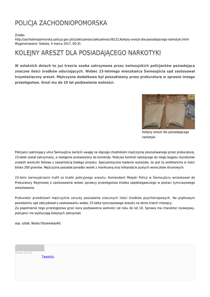 POLICJA ZACHODNIOPOMORSKA Źródło: http://zachodniopomorska.policja.gov.pl/sz/aktualnosci/aktualnosci/6122,Kolejny-areszt-dla-posiadajacego-narkotyki.html Wygenerowano: Sobota, 4 marca 2017, 00:31 KOLEJNY ARESZT DLA POSIADAJĄCEGO NARKOTYKI W ostatnich dniach to już trzecia osoba zatrzymana przez świnoujskich policjantów posiadająca znaczne ilości środków odurzających. Wobec 23-letniego mieszkańca Świnoujścia sąd zastosował trzymiesięczny areszt. Mężczyzna dodatkowo był poszukiwany przez prokuraturę w sprawie innego przestępstwa. Grozi mu do 10 lat pozbawienia wolności. Kolejny areszt dla posiadającego narkotyki Policjanci patrolujący ulice Świnoujścia zwrócili uwagę na idącego chodnikiem mężczyznę poszukiwanego przez prokuraturę. 23-latek został zatrzymany, a następnie przewieziony do komendy. Podczas kontroli należącego do niego bagażu mundurowi znaleźli woreczki foliowe z zawartością białego proszku. Specjalistyczne badanie wykazało, że jest to amfetamina w ilości blisko 200 gramów. Mężczyzna posiadał ponadto worek z marihuaną oraz kilkanaście pustych woreczków strunowych. 23-letni świnoujścianin trafił za kratki policyjnego aresztu. Komendant Miejski Policji w Świnoujściu wnioskował do Prokuratury Rejonowej o zastosowanie wobec sprawcy przestępstwa środka zapobiegawczego w postaci tymczasowego aresztowania. Prokurator przedstawił mężczyźnie zarzuty posiadania znacznych ilości środków psychotropowych. Na piątkowym posiedzeniu sąd zdecydował o zastosowaniu wobec 23-latka tymczasowego aresztu na okres trzech miesięcy. Za popełnienie tego przestępstwa grozi kara pozbawienia wolności od roku do lat 10. Sprawa ma charakter rozwojowy, policjanci nie wykluczają kolejnych zatrzymań. asp. sztab. Beata Olszewska/AG Ocena: 0/5 (0) Tweetnij