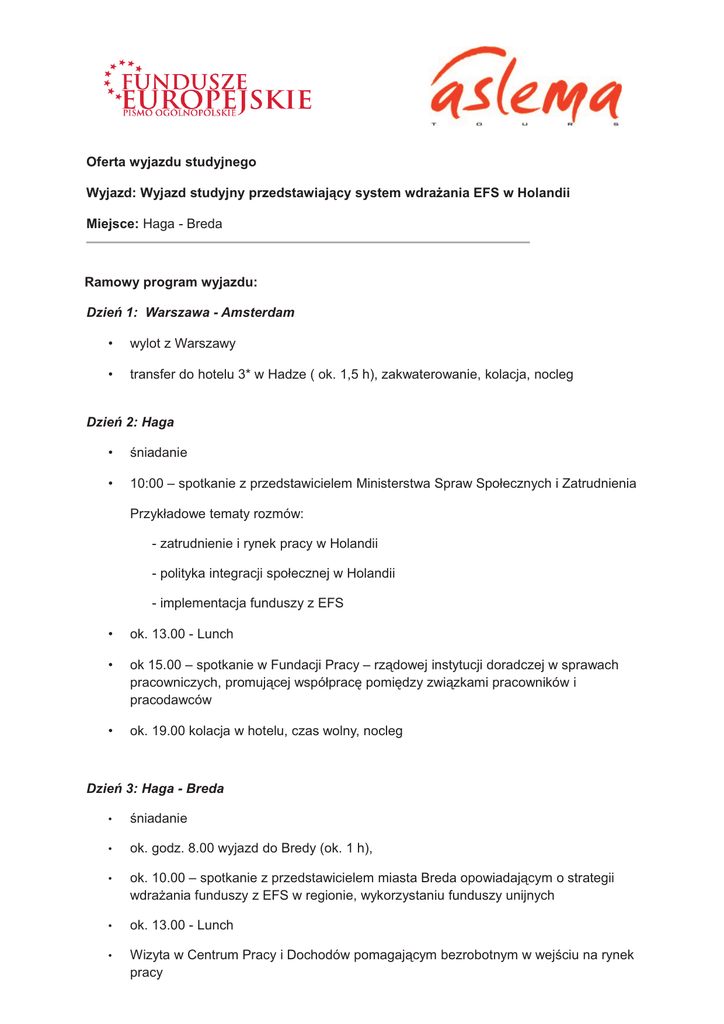 Oferta wyjazdu studyjnego Wyjazd: Wyjazd studyjny przedstawiaj¹cy system wdra¿ania EFS w Holandii Miejsce: Haga - Breda Ramowy program wyjazdu: Dzieñ 1: Warszawa - Amsterdam • wylot z Warszawy • transfer do hotelu 3* w Hadze ( ok. 1,5 h), zakwaterowanie, kolacja, nocleg Dzieñ 2: Haga • œniadanie • 10:00 – spotkanie z przedstawicielem Ministerstwa Spraw Spo³ecznych i Zatrudnienia Przyk³adowe tematy rozmów: - zatrudnienie i rynek pracy w Holandii - polityka integracji spo³ecznej w Holandii - implementacja funduszy z EFS • ok. 13.00 - Lunch • ok 15.00 – spotkanie w Fundacji Pracy – rz¹dowej instytucji doradczej w sprawach pracowniczych, promuj¹cej wspó³pracê pomiêdzy zwi¹zkami pracowników i pracodawców • ok. 19.00 kolacja w hotelu, czas wolny, nocleg Dzieñ 3: Haga - Breda • œniadanie • ok. godz. 8.00 wyjazd do Bredy (ok. 1 h), • ok. 10.00 – spotkanie z przedstawicielem miasta Breda opowiadaj¹cym o strategii wdra¿ania funduszy z EFS w regionie, wykorzystaniu funduszy unijnych • ok. 13.00 - Lunch • Wizyta w Centrum Pracy i Dochodów pomagaj¹cym bezrobotnym w wejœciu na rynek pracy • Transfer do hotelu 3*, zakwaterowanie, kolacja, nocleg Dzieñ 4: Breda - Amsterdam • œniadanie • ok. 10:00 – spotkanie w instytucji wdra¿aj¹cej programy europejskie z zakresu integracji spo³ecznej i aktywizacji zawodowej • 12:00 – Lunch • Przejazd do Amsterdamu ( ok. 1,5 h), 2 h zwiedzanie miasta • Zakwaterowanie w hotelu 3*, kolacja, nocleg. Dzieñ 5: Amsterdam – Warszawa • œniadanie , • przejazd na lotnisko, wylot do Polski