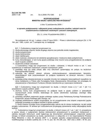 Dz.U.06.190.1406 2009.11.06 zm. Dz.U.2009.176.1365 §1 ROZPORZĄDZENIE 1) MINISTRA NAUKI I SZKOLNICTWA WYŻSZEGO z dnia 12 października 2006 r. w sprawie podejmowania i odbywania przez cudzoziemców studiów i szkoleń oraz ich uczestniczenia w badaniach naukowych i pracach rozwojowych (Dz. U. z dnia 19 października 2006 r.) Na podstawie art. 44 ust. 1 ustawy z dnia 27 lipca 2005 r. - Prawo o szkolnictwie wyższym (Dz. U. Nr 2) 164, poz. 1365, z późn. zm. ) zarządza się, co następuje: § 1. 1. Cudzoziemcy mogą być przyjmowani na: studia pierwszego stopnia, studia drugiego stopnia oraz jednolite studia magisterskie; studia podyplomowe; studia doktoranckie; staże habilitacyjne; staże naukowe, artystyczne lub szkolenia specjalizacyjne i medyczne staże podyplomowe; kursy dokształcające, w tym kursy języka polskiego oraz roczne kursy przygotowawcze do podjęcia nauki w języku polskim; 7) studenckie praktyki zawodowe. 2. Cudzoziemcy mogą być przyjmowani na studia i szkolenia, o których mowa w ust. 1, oraz uczestniczyć w badaniach naukowych i pracach rozwojowych, jeżeli: 1) posiadają wizę lub kartę pobytu albo inny dokument uprawniający do pobytu na terytorium Rzeczypospolitej Polskiej; 2) wykazują się dobrym stanem zdrowia, udokumentowanym zaświadczeniem lekarskim, stwierdzającym brak przeciwwskazań do podjęcia kształcenia na obranym kierunku i formie kształcenia; 3) posiadają polisę ubezpieczeniową na wypadek choroby lub następstw nieszczęśliwych wypadków na okres kształcenia w Polsce albo Europejską Kartę Ubezpieczenia Zdrowotnego lub przystąpią do ubezpieczenia w Narodowym Funduszu Zdrowia niezwłocznie po rozpoczęciu kształcenia. 1) 2) 3) 4) 5) 6) § 2. 1. Cudzoziemcy mogą być przyjmowani na studia, o których mowa w § 1 ust. 1 pkt 1-3, prowadzone w języku polskim, jeżeli: 1) ukończą roczny kurs przygotowawczy do podjęcia nauki w języku polskim w jednostkach wyznaczonych przez ministra właściwego do spraw szkolnictwa wyższego, zwanego dalej "ministrem", lub 2) posiadają certyfikat znajomości języka polskiego wydany przez Państwową Komisję Poświadczania Znajomości Języka Polskiego jako Obcego, lub 3) uzyskają potwierdzenie uczelni przyjmującej, że ich przygotowanie oraz stopień znajomości języka polskiego pozwalają na podjęcie studiów w języku polskim. 2. Okres trwania rocznego kursu przygotowawczego zalicza się do okresu kształcenia, na jaki został przyjęty cudzoziemiec. W okresie tym cudzoziemcowi przysługują uprawnienia osoby odbywającej studia wyższe. 3. Cudzoziemcy mogą być przyjmowani na studia, o których mowa w § 1 ust. 1 pkt 1-3, prowadzone w języku obcym, z wyłączeniem studiów doktoranckich prowadzonych w uczelniach medycznych z zakresu dyscyplin klinicznych, jeżeli legitymują się dokumentem potwierdzającym znajomość języka obcego, w którym prowadzone są studia, wymienionym w załączniku nr 2 do rozporządzenia Prezesa Rady Ministrów z dnia 24 stycznia 2007 r. w sprawie sposobu przeprowadzania postępowania kwalifikacyjnego w służbie cywilnej (Dz. U. Nr 13, poz. 82 i Nr 249, poz. 1857 oraz z 2008 r. Nr 93, poz. 587), z zastrzeżeniem ust. 4. 4. Dokumentami potwierdzającymi znajomość języka obcego są również świadectwa, dyplomy lub inne dokumenty potwierdzające ukończenie za granicą szkoły ponadpodstawowej, w której zajęcia były prowadzone w tym samym języku obcym, w jakim cudzoziemiec będzie odbywał studia w Polsce. § 3. 1. Na studia pierwszego stopnia lub jednolite studia magisterskie mogą być przyjmowani cudzoziemcy z pominięciem zasad rekrutacji obowiązujących obywateli polskich, którzy: 1) legitymują się zalegalizowanym lub opatrzonym apostille świadectwem lub innym dokumentem uzyskanym za granicą, uprawniającym do ubiegania się o przyjęcie na studia w uczelniach każdego typu w państwie, w którego systemie działała instytucja wydająca świadectwo, uznanym za równoważny odpowiedniemu polskiemu świadectwu dojrzałości, zgodnie z przepisami w sprawie nostryfikacji świadectw szkolnych i świadectw maturalnych uzyskanych za granicą, albo uznanym, na podstawie umowy międzynarodowej, za równoważny odpowiedniemu polskiemu świadectwu dojrzałości lub za uprawniający do podjęcia takich studiów w Rzeczypospolitej Polskiej; 2) wykażą wymagane w uczelni przyjmującej szczególne predyspozycje do podjęcia studiów na kierunkach wymagających takich predyspozycji. 2. Na studia drugiego stopnia mogą być przyjmowani cudzoziemcy z pominięciem zasad rekrutacji obowiązujących obywateli polskich, którzy legitymują się zalegalizowanym lub opatrzonym apostille dyplomem lub innym dokumentem ukończenia uczelni za granicą uprawniającym do podjęcia studiów drugiego stopnia w państwie, w którym został wydany, uznanym za równorzędny z odpowiednim polskim dyplomem ukończenia studiów pierwszego stopnia, zgodnie z przepisami w sprawie nostryfikacji dyplomów ukończenia studiów wyższych uzyskanych za granicą, chyba że zostali zwolnieni na podstawie tych przepisów z postępowania nostryfikacyjnego, albo uznanym, na podstawie umowy międzynarodowej, za równorzędny z odpowiednim polskim dyplomem ukończenia studiów pierwszego stopnia lub za uprawniający do podjęcia studiów drugiego stopnia w Rzeczypospolitej Polskiej. § 4. Na studia podyplomowe mogą być przyjmowani cudzoziemcy, którzy posiadają dyplom ukończenia studiów pierwszego stopnia, studiów drugiego stopnia lub jednolitych studiów magisterskich uzyskany w Polsce albo zalegalizowany lub opatrzony apostille dyplom lub inny dokument ukończenia studiów pierwszego lub drugiego stopnia albo jednolitych studiów za granicą, uznany za równorzędny z odpowiednim polskim dyplomem ukończenia studiów pierwszego lub drugiego stopnia albo jednolitych studiów magisterskich, zgodnie z przepisami w sprawie nostryfikacji dyplomów ukończenia studiów wyższych uzyska