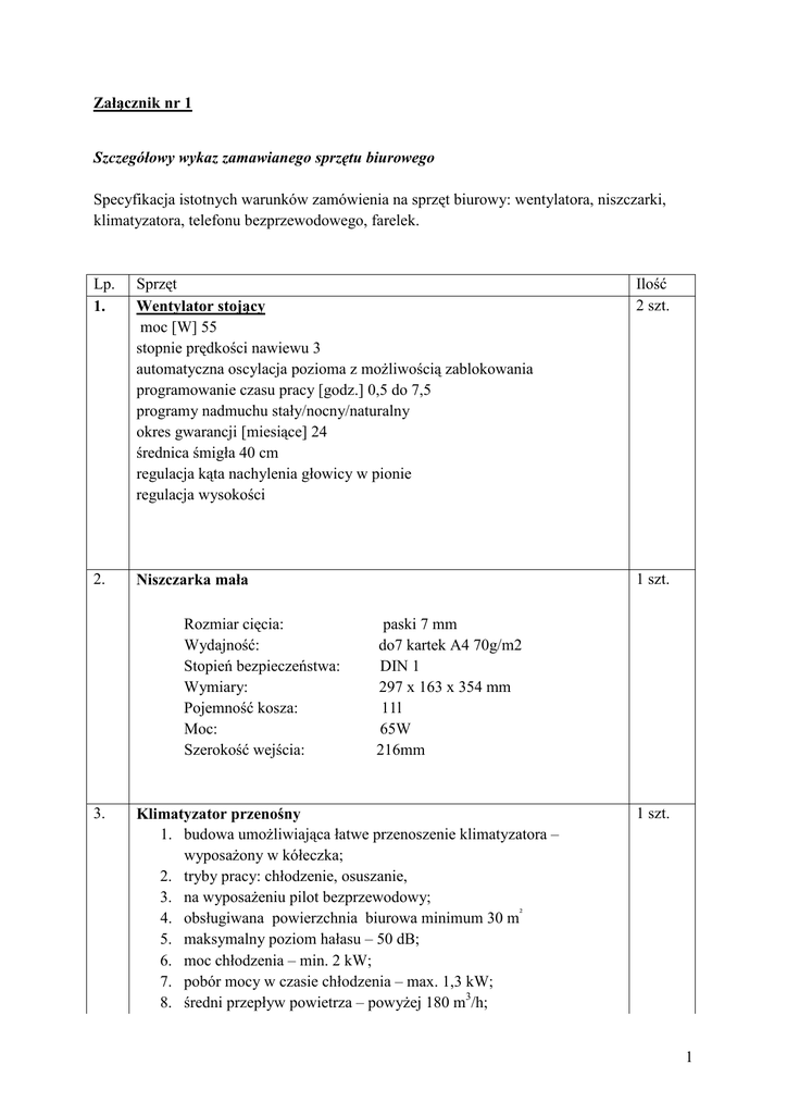 Załącznik nr 1 Szczegółowy wykaz zamawianego sprzętu biurowego Specyfikacja istotnych warunków zamówienia na sprzęt biurowy: wentylatora, niszczarki, klimatyzatora, telefonu bezprzewodowego, farelek. Lp. 1. Sprzęt Wentylator stojący moc [W] 55 stopnie prędkości nawiewu 3 automatyczna oscylacja pozioma z możliwością zablokowania programowanie czasu pracy [godz.] 0,5 do 7,5 programy nadmuchu stały/nocny/naturalny okres gwarancji [miesiące] 24 średnica śmigła 40 cm regulacja kąta nachylenia głowicy w pionie regulacja wysokości Ilość 2 szt. 2. Niszczarka mała 1 szt. Rozmiar cięcia: Wydajność: Stopień bezpieczeństwa: Wymiary: Pojemność kosza: Moc: Szerokość wejścia: 3. paski 7 mm do7 kartek A4 70g/m2 DIN 1 297 x 163 x 354 mm 11l 65W 216mm Klimatyzator przenośny 1. budowa umożliwiająca łatwe przenoszenie klimatyzatora – wyposażony w kółeczka; 2. tryby pracy: chłodzenie, osuszanie, 3. na wyposażeniu pilot bezprzewodowy; 4. obsługiwana powierzchnia biurowa minimum 30 m² 5. maksymalny poziom hałasu – 50 dB; 6. moc chłodzenia – min. 2 kW; 7. pobór mocy w czasie chłodzenia – max. 1,3 kW; 8. średni przepływ powietrza – powyżej 180 m3/h; 1 szt. 1 9. efektywność energetyczna – klasa A; 10. programator czasowy; 11. gwarancja – minimum 2 lata; 4. Telefon bezprzewodowy Ogólne 2 szt. Załączone wyposażenie Zasilacz Gwarancja 24 miesiące Wyświetlacz Wyświetlacz LCD, Podświetlany Książka telefoniczna 80 pozycji Identyfikacja rozmówcy TAK Wyświetlane informacje Czasu i daty, Stanu baterii Funkcje Funkcja głośnomówiąca TAK Inne 10 melodii dzwonka, Alarm Automatyczna sekretarka Sekretarka Cyfrowa Inne Czas nagrania do 10 minut Połączenia Rejestr połączeń 10 ostatnich wybieranych, 25 ostatnich nieodebranych Techniczne System Analogowy Czas czuwania [dni] 7 Maksymalny czas rozmów 25 [h] Zasięg wewnątrz [m] 50 300 Zasięg na zewnątrz [m] Zastosowane technologie ECO DECT Możliwość podłączenia 4 słuchawek do jednej Inne bazy 5. Farelka 3 szt. Moc grzewcza 2000 W. nastawienie temperatury od +5C do +30C klasa ochronności II i stopień ochrony IP X0 zabezpieczenie przeciw przegrzaniu sygnalizacja pracy - lampka kontrolna Moc regulowana: 1 000 W / 2 000 W 2