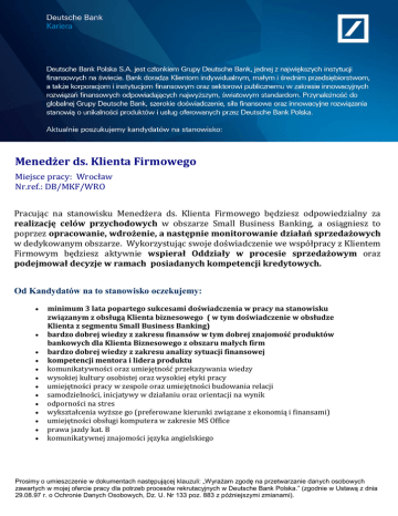 Menedżer ds. Klienta Firmowego Miejsce pracy: Wrocław Nr.ref.: DB/MKF/WRO Pracując na stanowisku Menedżera ds. Klienta Firmowego będziesz odpowiedzialny za realizację celów przychodowych w obszarze Small Business Banking, a osiągniesz to poprzez opracowanie, wdrożenie, a następnie monitorowanie działań sprzedażowych w dedykowanym obszarze. Wykorzystując swoje doświadczenie we współpracy z Klientem Firmowym będziesz aktywnie wspierał Oddziały w procesie sprzedażowym oraz podejmował decyzje w ramach posiadanych kompetencji kredytowych. Od Kandydatów na to stanowisko oczekujemy: minimum 3 lata popartego sukcesami doświadczenia w pracy na stanowisku związanym z obsługą Klienta biznesowego ( w tym doświadczenie w obsłudze Klienta z segmentu Small Business Banking) bardzo dobrej wiedzy z zakresu finansów w tym dobrej znajomość produktów bankowych dla Klienta Biznesowego z obszaru małych firm bardzo dobrej wiedzy z zakresu analizy sytuacji finansowej kompetencji mentora i lidera produktu komunikatywności oraz umiejętność przekazywania wiedzy wysokiej kultury osobistej oraz wysokiej etyki pracy umiejętności pracy w zespole oraz umiejętności budowania relacji samodzielności, inicjatywy w działaniu oraz orientacji na wynik odporności na stres wykształcenia wyższe go (preferowane kierunki związane z ekonomią i finansami) umiejętności obsługi komputera w zakresie MS Office prawa jazdy kat. B komunikatywnej znajomości języka angielskiego Prosimy o umieszczenie w dokumentach następującej klauzuli: „Wyrażam zgodę na przetwarzanie danych osobowych zawartych w mojej ofercie pracy dla potrzeb procesów rekrutacyjnych w Deutsche Bank Polska.” (zgodnie w Ustawą z dnia 29.08.97 r. o Ochronie Danych Osobowych, Dz. U. Nr 133 poz. 883 z późniejszymi zmianami). W zamian proponujemy: zatrudnienie w ramach umowy o pracę, pracę w stabilnej firmie, w jednej z największych instytucji finansowych na świecie, możliwość podnoszenia kwalifikacji zawodowych oraz rozwoju osobistego w ramach struktur Banku, przyjazną atmosferę pracy, atrakcyjny pakiet socjalny (m.in. prywatna opieka medyczna, karta sportowa). Prosimy i przesyłanie zgłoszeń (CV i list motywacyjny) na adres: [email protected] z numerem referencyjnym (DB/MKF/WRO) oferty w tytule wiadomości. Uprzejmie informujemy, że skontaktujemy się tylko z wybranymi Kandydatami, a nadesłanych dokumentów nie zwracamy. Prosimy o umieszczenie w dokumentach następującej klauzuli: „Wyrażam zgodę na przetwarzanie danych osobowych zawartych w mojej ofercie pracy dla potrzeb procesów rekrutacyjnych w Deutsche Bank Polska.” (zgodnie w Ustawą z dnia 29.08.97 r. o Ochronie Danych Osobowych, Dz. U. Nr 133 poz. 883 z późniejszymi zmianami).