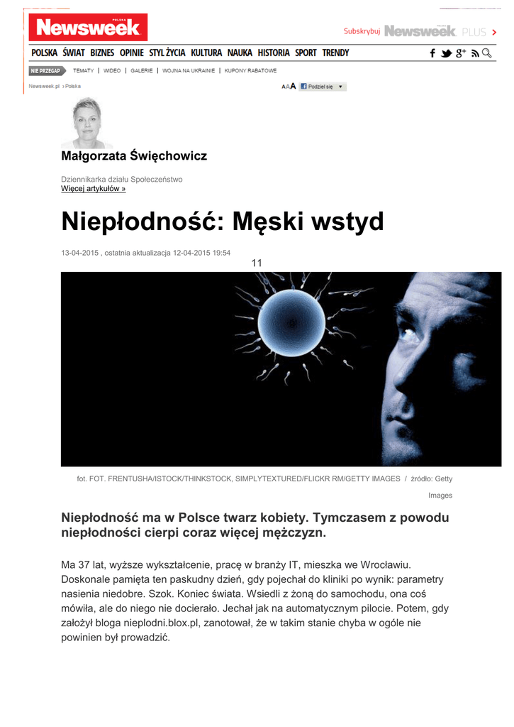 Małgorzata Święchowicz Dziennikarka działu Społeczeństwo Więcej artykułów » Niepłodność: Męski wstyd 13-04-2015 , ostatnia aktualizacja 12-04-2015 19:54 11 fot. FOT. FRENTUSHA/ISTOCK/THINKSTOCK, SIMPLYTEXTURED/FLICKR RM/GETTY IMAGES / źródło: Getty Images Niepłodność ma w Polsce twarz kobiety. Tymczasem z powodu niepłodności cierpi coraz więcej mężczyzn. Ma 37 lat, wyższe wykształcenie, pracę w branży IT, mieszka we Wrocławiu. Doskonale pamięta ten paskudny dzień, gdy pojechał do kliniki po wynik: parametry nasienia niedobre. Szok. Koniec świata. Wsiedli z żoną do samochodu, ona coś mówiła, ale do niego nie docierało. Jechał jak na automatycznym pilocie. Potem, gdy założył bloga nieplodni.blox.pl, zanotował, że w takim stanie chyba w ogóle nie powinien był prowadzić. Pierwszy wieczór przeryczał. Z butelką piwa, drugiego piwa, whisky. Długo nie mógł się oswoić się z wynikiem. Na bloga wrzucał, co czuł: Jestem gorszy! „W pracy przeglądałem głównie strony o niepłodności i o in vitro. Wychodząc z pracy - też o niczym innym nie myślałem”. Gdyby ktoś go wtedy zapytał, o czym marzy, czego chce najbardziej, powiedziałby: dawnego życia, tego sprzed diagnozy. Wiadomość o złych parametrach nasienia wywołała w nim takie uczucia, jakby mu ktoś umarł. Przechodził - niemal książkowo - kolejne fazy żałoby: od szoku, przez bunt, złość, smutek… Szacuje się, że w Polsce niepłodność dotyczy przynajmniej co piątej pary. Jeszcze niedawno przypuszczano, że w 35 przypadkach na sto przyczyna jest po stronie kobiety, w kolejnych 35 - mężczyzny. Reszta to przypadki, w których przyczyn nie udało się jednoznacznie ustalić. Teraz okazuje się, że tak zwany czynnik męski może być powodem kłopotów w więcej niż połowie przypadków. Kiepsko jest nawet u tych, którzy sądzili, że nadają się na dawców nasienia. W klinice leczenia niepłodności „Invicta" 70 proc. ochotników odpada w czasie kwalifikacji. To, co trafia pod mikroskopy specjalistów z laboratorium Gyncentrum Clinic w Katowicach, też jest w większości niedoskonałe. – Już rzadko widzimy nasienie idealne, niemal zawsze któryś z parametrów jest poniżej normy – mówi dr Wojciech Sierka. REKLAMA REKLAMA Tymczasem w Polsce wciąż ilekroć mówi się „niepłodność”, myśli się „kobieta”. – Gdy się dyskutuje o in vitro, to kobietę odmienia się przez wszystkie przypadki, ani słowem nie wspomina się o niepłodności mężczyzn - zauważa Dariusz Krawczak, mąż Anny, przewodniczącej Stowarzyszenia na Rzecz Leczenia Niepłodności i Wspierania Adopcji „Nasz Bocian." Są jedną z nielicznych par w Polsce, która ma odwagę mówić otwarcie, że u nich „wystąpił czynnik męski". Zwykle o tym się milczy. Nie ma mężczyzn na portalach i forach dla niepłodnych, nie udzielają się. Na infolinię uruchomioną przez stowarzyszenie „Nasz Bocian" też dzwonią głównie kobiety. Dariusz Krawczak jest wolontariuszem, często dyżuruje i zauważył, że jeśli już jakiś mężczyzna zdobędzie się na odwagę, aby zadzwonić, to najczęściej pyta: „Jak sobie radziłeś po odebraniu wyniku?” Odpowiedź jest prosta: – Tak jak ty. Czyli w ogóle sobie nie radziłem. – To było jak cios między oczy – wspomina moment, gdy otrzymał diagnozę. - W takim momencie traci się równowagę. Człowiek się czuje, jakby siedział z żoną przy stole, od którego ktoś właśnie odrąbał dwie nogi. Wszystko zaczyna się chwiać, także związek. W desperacji mówi się żonie: „odejdź ode mnie", „znajdź sobie kogoś lepszego". Więcej o problemie niepłodności w najnowszym numerze tygodnika "Newsweek Polska" oraz Newsweek PLUS>>> Zobacz, jakie korzyści niesie ze sobą korzystanie z Newsweek Plus>>>