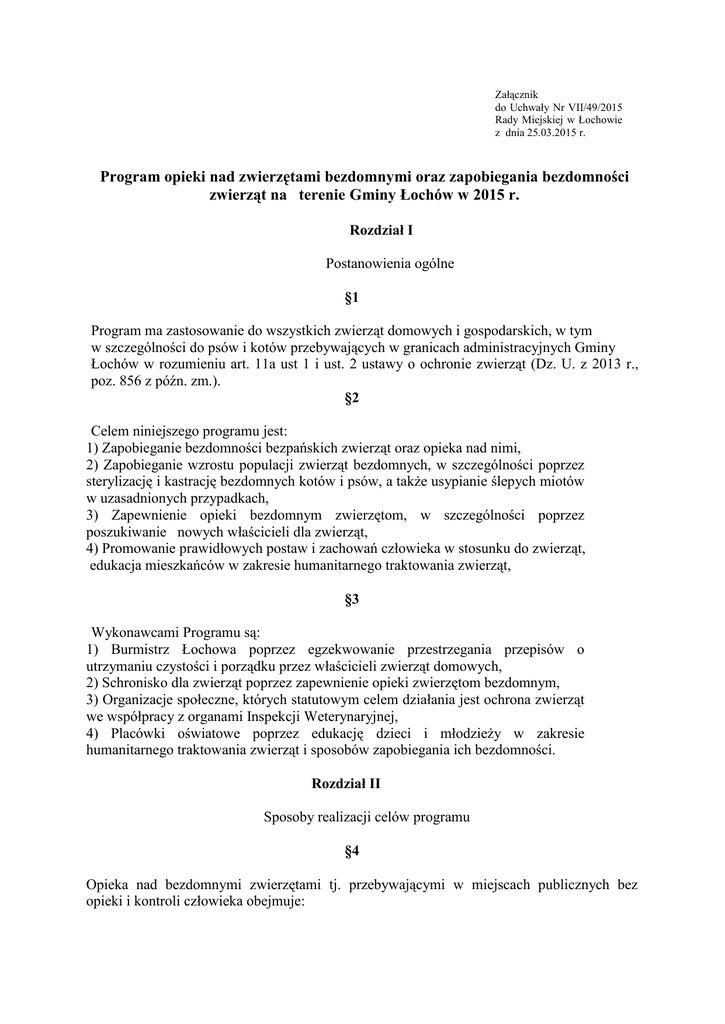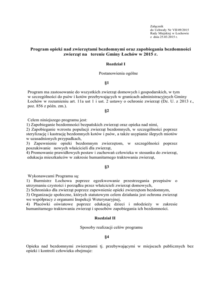 Załącznik do Uchwały Nr VII/49/2015 Rady Miejskiej w Łochowie z dnia 25.03.2015 r. Program opieki nad zwierzętami bezdomnymi oraz zapobiegania bezdomności zwierząt na terenie Gminy Łochów w 2015 r. Rozdział I Postanowienia ogólne §1 Program ma zastosowanie do wszystkich zwierząt domowych i gospodarskich, w tym w szczególności do psów i kotów przebywających w granicach administracyjnych Gminy Łochów w rozumieniu art. 11a ust 1 i ust. 2 ustawy o ochronie zwierząt (Dz. U. z 2013 r., poz. 856 z późn. zm.). §2 Celem niniejszego programu jest: 1) Zapobieganie bezdomności bezpańskich zwierząt oraz opieka nad nimi, 2) Zapobieganie wzrostu populacji zwierząt bezdomnych, w szczególności poprzez sterylizację i kastrację bezdomnych kotów i psów, a także usypianie ślepych miotów w uzasadnionych przypadkach, 3) Zapewnienie opieki bezdomnym zwierzętom, w szczególności poprzez poszukiwanie nowych właścicieli dla zwierząt, 4) Promowanie prawidłowych postaw i zachowań człowieka w stosunku do zwierząt, edukacja mieszkańców w zakresie humanitarnego traktowania zwierząt, §3 Wykonawcami Programu są: 1) Burmistrz Łochowa poprzez egzekwowanie przestrzegania przepisów o utrzymaniu czystości i porządku przez właścicieli zwierząt domowych, 2) Schronisko dla zwierząt poprzez zapewnienie opieki zwierzętom bezdomnym, 3) Organizacje społeczne, których statutowym celem działania jest ochrona zwierząt we współpracy z organami Inspekcji Weterynaryjnej, 4) Placówki oświatowe poprzez edukację dzieci i młodzieży w zakresie humanitarnego traktowania zwierząt i sposobów zapobiegania ich bezdomności. Rozdział II Sposoby realizacji celów programu §4 Opieka nad bezdomnymi zwierzętami tj. przebywającymi w miejscach publicznych bez opieki i kontroli człowieka obejmuje: 1) Na terenie Gminy Łochów odławianie bezdomnych zwierząt będzie odbywało się w sposób doraźny w odniesieniu do pojedynczych zgłoszeń dotyczących pozostawionych bez opieki zwierząt w szczególności chorych lub stwarzających zagrożenie dla bezpieczeństwa. 2) Wyłapane bezdomne zwierzęta zostaną niezwłocznie przewiezione do nadzorowanego przez Inspekcję Weterynaryjną schroniska dla zwierząt, a) wyłapywanie, przeniesienie i umieszczenie zwierząt bezdomnych w schronisku realizowane będzie w oparciu o umowę zawartą przez Burmistrza Łochowa z wyspecjalizowanym i uprawnionym przedsiębiorcą b) schronisko zapewni bezterminową opiekę wyłapywanym zwierzętom bezdomnym lub znajdzie dla nich osoby, które adoptują bezdomne zwierzęta, c) bezdomne zwierzęta umieszczone w schronisku będą poddawane zabiegowi sterylizacji albo kastracji, d) wyłapywanie, przeniesienie i umieszczenie zwierząt bezdomnych w schronisku realizowane będzie w oparciu o umowę zawartą przez Burmistrza Łochowa, z wyspecjalizowanym i uprawnionym przedsiębiorcą, „Schroniskiem dla Bezdomnych Zwierząt” Zygmunt Dworakowski Radysy 13, 12-230 Biała Piska e) zwierzę umieszczone w schronisku może być oddane jego właścicielowi, w ciągu 14 dni od dnia przyjęcia, jeżeli został on ustalony. 3) Poszukiwanie wspólnie z organizacjami opieki nad zwierzętami, wolontariuszami i innymi osobami nowych właścicieli dla bezdomnych zwierząt. 4) Sprawowanie opieki nad kotami wolno żyjącymi realizowane będzie przez: a) finansowanie leczenia zwierząt w ramach umów zawartych z zakładami leczenia zwierząt. b) zakup i wydawanie karmy społecznym opiekunom (karmicielom kotów). 5) Burmistrz Łochowa prowadził będzie rejestr zwierząt i ich karmiciel. §5 W celu zmniejszenia populacji bezdomnych zwierząt Gmina Łochów realizacje następujące zadania: 1) Gmina pokrywa koszty sterylizacji lub kastracji zwierząt bezdomnych przebywających na jej terenie. 2) Określa się następujące zasady finansowania zabiegów, o których mowa w ust.1: a) Gmina zawiera umowę z zakładem leczniczym dla zwierząt na dokonanie zabiegów sterylizacji i kastracji bezdomnych zwierząt oraz na opiekę nad nimi, b) bezdomne zwierzęta będą na zlecenie Gminy wyłapywane, przewożone do zakładu leczniczego dla zwierząt w celu wykonania zabiegu sterylizacji lub kastracji, c) po przeprowadzeniu zabiegu sterylizacji bądź kastracji zwierzęta wrócą do miejsc macierzystych (koty wolno żyjące) bądź trafią do adopcji, d) Gmina pokrywa koszty zabiegu sterylizacji lub kastracji w całości 3) Usypianie ślepych miotów w schronisku albo poprzez gabinet weterynaryjny z którym gmina ma podpisaną umowę. 4) Burmistrz Łochowa posiada podpisaną umowę z Gabinetem Weterynaryjnym Grażyną Armanowską i Januszem Armanowskim S.C. ul. Świerkowa 17, 07-130 Łochów. §6 W przypadku zwierząt gospodarskich dopuszcza się czasowe przekazanie tego typu zwierząt bezdomnych, gospodarstwu posiadającemu odpowiednie warunki do ich przetrzymywania, do czasu ustalenia dalszego postępowania z tymi zwierzętami. W tym celu Burmistrz Łochowa posiada podpisaną umowę z gospodarstwem rolnym Pana Tadeusza Matusika zam. Brzuza. §7 Zapewnienie całodobowej opieki weterynaryjnej w przypadkach zdarzeń drogowych z udziałem zwierząt realizowane będzie poprzez zawarta umowę z Gabinetem Weterynaryjnym Grażyną Armanowską i Januszem Armanowskim S.C. Rozdział III Edukacja w zakresie ochrony zwierząt §8 W celu edukacji mieszkańców Gminy w zakresie ochrony zwierząt planuje się realizację następujących zadań: 1) Włączenie nauczycieli w szkołach i przedszkolach z terenu gminy do działań edukacyjnych mających na celu podniesienia świadomości dzieci i młodzieży w zakresie kształtowania prawidłowych postaw i zachowań człowieka w stosunku do zwierząt, 2) Promowanie na stronie internetowej Urzędu Gminy Programu opieki nad zwierzętami bezdomnymi oraz zapobiegania bezdomności zwierząt. Rozdział IV Środki finansowe przeznaczone na realizację programu §9 1) Program będzie realizowany ze środków finan