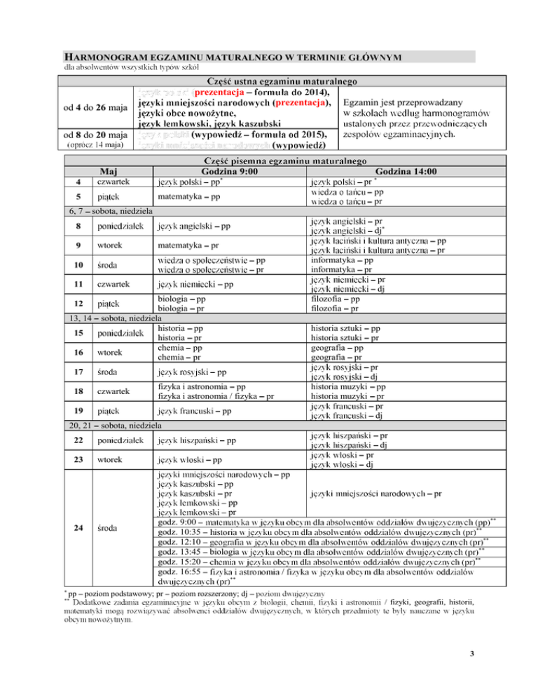 HARMONOGRAM EGZAMINU MATURALNEGO W TERM prezentacja ), prezentacja), od 4 do 26 maja ( od 8 do 20 maja Maj Godzina 9:00 matematyka 5 6, 7 pr * pp pr pp sobota, niedziela pr dj* pp 8 wtorek 9 matematyka pp pr pr pp pr 10 czwartek 11 informatyka informatyka biologia biologia 13, 14 sobota, niedziela historia 15 historia chemia wtorek 16 chemia pr dj pp pr filozofia filozofia pp pr pp pr czwartek fizyka i astronomia pp fizyka i astronomia / fizyka pr pp 19 20, 21 pp pr historia sztuki pp historia sztuki pr geografia pp geografia pr pr dj historia muzyki pp historia muzyki pr pr dj pp 17 18 pp pr pp 12 sobota, niedziela pr dj pp 22 23 Godzina 14:00 pp* czwartek 4 . ), ) ( maja) Egzamin jest przeprowadzany w wtorek pr dj pp pp pp pr pp pr 24 pr ** godz. 9:00 godz. 10:35 godz. 12:10 godz. 13:45 biologia godz. 15:20 godz. 16:55 ** ** ** ** ** * pp ** poziom podstawowy; pr poziom rozszerzony; dj / fizyki, geografii, historii, 3 HARMONOGRAM EGZAMINU MATURALNEGO W TERMINIE DODATKOWYM* prezentacja ), prezentacja), od 1 do 20 czerwca Egzamin jest przeprowadzany w kaszubski od 5 do 7 czerwca ), ) egzaminu maturalnego Godzina 9:00 Godzina 14:00 Czerwiec 1 2 3, 4 czwartek . pp** matematyka pp pr** matematyka pr sobota, niedziela 6 wtorek pp czwartek biologia pp, pr geografia pp, pr pp, pr pr dj fizyka i astronomia / fizyka pr dj chemia pp, pr wtorek pp pp pp, pr czwartek pr dj pp 16 17, 18 historia sztuki pp, pr sobota, niedziela 14 15 pp, pr pp, pr 12 13 filozofia pp, pr historia muzyki pp, pr informatyka pp, pr pr dj historia pp, pr 7 8 9 10, 11 pr dj** pp 5 sobota, niedziela pr dj pp 19 pr 20 wtorek pp, pr pp, pr pp *** * w ostatnim tygodniu maja 2017 r. ** pp poziom podstawowy; pr poziom rozszerzony; dj *** Termin / fizyki, geografii, historii, maturalnego: : : 30 czerwca 2017 r. 30 czerwca 2017 r. 30 czerwca 2017 r. 4 HARMONOGRAM EGZAMINU MATURALNEGO W TERMINIE POPRAWKOWYM* ci pisemnej 22 sierpnia 2017 r. (wtorek), godz. 9:00 prezentacja i ) 23 25 sierpnia 2017 r. * minacyjnej w terminie do 11 sierpnia 2017 r. maturalnego: : : CZAS TRWANIA POSZCZEG 2017 NU 12 12 12 r. 2017 r. r. PISEMNEJ* lat 2016 2017.) Przedmioty Arkusze poziom podstawowy matematyka biologia chemia filozofia fizyka geografia historia historia muzyki historia sztuki informatyka Czas trwania (min) 170 poziom rozszerzony poziom podstawowy poziom rozszerzony 180 120 150 180 poziom rozszerzony 180 poziom rozszerzony** 60 150 *** biologia (pr), chemia (pr), fizyka (pr), geografia (pr), historia (pr), matematyka (pp)**** 80 * ** *** **** pp poziom podstawowy; pr poziom rozszerzony. 5 * CZAS TRWANIA POSZCZEG (Dotyczy egzaminu maturalnego w 7 wszystkich 2015.) Przedmioty Arkusze poziom podstawowy matematyka poziom rozszerzony poziom podstawowy narodowych 180 120 120 70 180 75 120 90 150 poziom rozszerzony** poziom podstawowy** informatyka poziom rozszerzony** filozofia historia historia muzyki historia sztuki biologia chemia fizyka i astronomia geografia *** poziom podstawowy 120 poziom rozszerzony 180 poziom podstawowy 120 poziom rozszerzony 150 biologia, chemia, fizyka i astronomia, geografia, historia, matematyka * 80 yrektora CKE. ** oraz z Czas trwania (min) 170 na poziomie podstawowym i rozszerzonym pozio *** dr Marcin Smolik dyrektor Centralnej Komisji Egzaminacyjnej 6