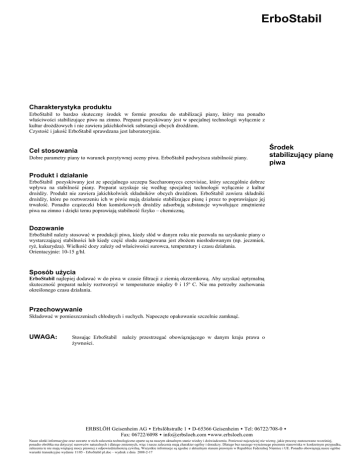 ErboStabil Charakterystyka produktu ErboStabil to bardzo skuteczny środek w formie proszku do stabilizacji piany, który ma ponadto właściwości stabilizujące piwo na zimno. Preparat pozyskiwany jest w specjalnej technologii wyłącznie z kultur drożdżowych i nie zawiera jakichkolwiek substancji obcych drożdżom. Czystość i jakość ErboStabil sprawdzana jest laboratoryjnie. Cel stosowania Dobre parametry piany to warunek pozytywnej oceny piwa. ErboStabil podwyższa stabilność piany. Środek stabilizujący pianę piwa Produkt i działanie ErboStabil pozyskiwany jest ze specjalnego szczepu Saccharomyces cerevisiae, który szczególnie dobrze wpływa na stabilność piany. Preparat uzyskuje się według specjalnej technologii wyłącznie z kultur drożdży. Produkt nie zawiera jakichkolwiek składników obcych drożdżom. ErboStabil zawiera składniki drożdży, które po roztworzeniu ich w piwie mają działanie stabilizujące pianę i przez to poprawiające jej trwałość. Ponadto cząsteczki błon komórkowych drożdży adsorbują substancje wywołujące zmętnienie piwa na zimno i dzięki temu poprawiają stabilność fizyko – chemiczną. Dozowanie ErboStabil należy stosować w produkcji piwa, kiedy słód w danym roku nie pozwala na uzyskanie piany o wystarczającej stabilności lub kiedy część słodu zastępowana jest zbożem niesłodowanym (np. jeczmień, ryż, kukurydza). Wielkość dozy zależy od właściwości surowca, temperatury i czasu działania. Orientacyjnie: 10-15 g/hl. Sposób użycia ErboStabil najlepiej dodawać w do piwa w czasie filtracji z ziemią okrzemkową. Aby uzyskać optymalną skuteczność preparat należy roztworzyć w temperaturze między 0 i 15º C. Nie ma potrzeby zachowania określonego czasu działania. Przechowywanie Składować w pomieszczeniach chłodnych i suchych. Napoczęte opakowanie szczelnie zamknąć. UWAGA: Stosując ErboStabil żywności. należy przestrzegać obowiązującego w danym kraju prawa o ERBSLÖH Geisenheim AG Erbslöhstraße 1 D-65366 Geisenheim Tel: 06722/708-0 Fax: 06722/6098 [email protected] www.erbsloeh.com Nasze ulotki informacyjne oraz zawarte w nich zalecenia technologiczne oparte są na naszym aktualnym stanie wiedzy i doświadczeniu. Ponieważ najczęściej nie wiemy, jakie procesy zastosowano wcześniej, ponadto obróbka ma dotyczyć surowców naturalnych i dlatego zmiennych, więc i nasze zalecenia mają charakter ogólny i doradczy. Dlatego bez naszego wyrażonego pisemnie stanowiska w konkretnym przypadku, zalecenia te nie mają wiążącej mocy prawnej z odpowiedzialnością cywilną. Wszystkie informacje są zgodne z aktualnym stanem prawnym w Republice Federalnej Niemiec i UE. Ponadto obowiązują nasze ogólne warunki transakcyjne wydanie 11/05 - ErboStabil pl.doc – wydruk z dnia 2008-2-17