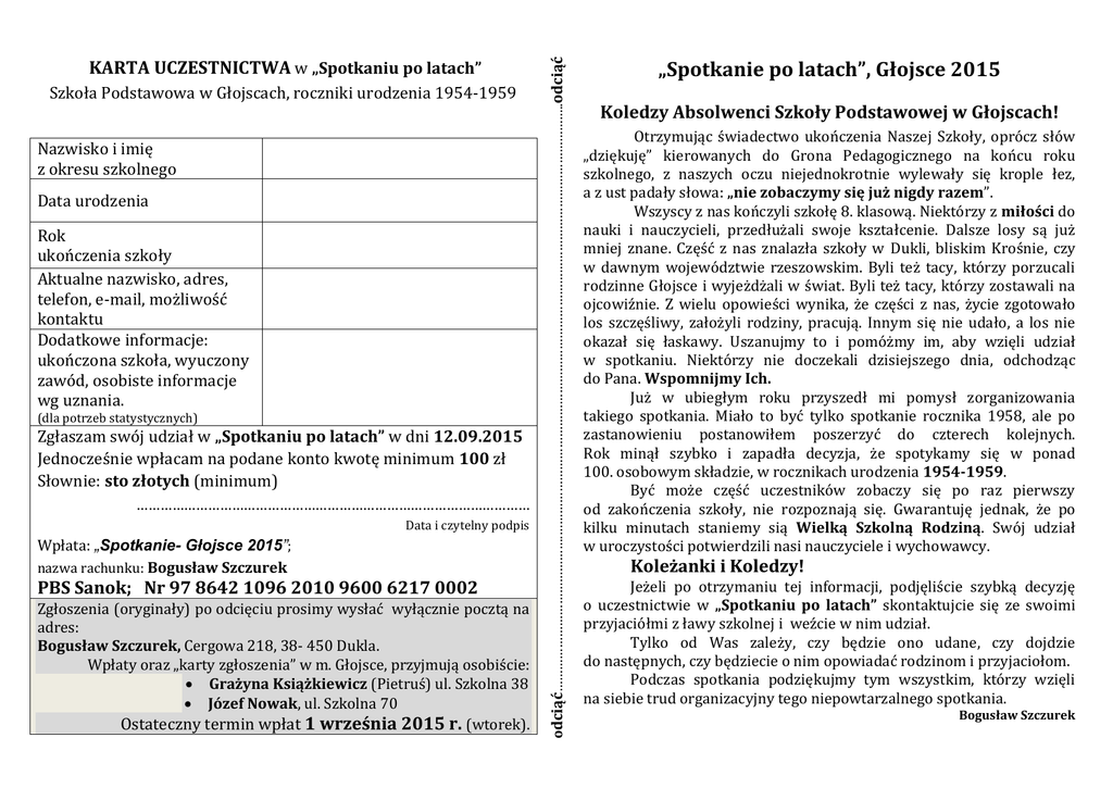 Szkoła Podstawowa w Głojscach, roczniki urodzenia 1954-1959 Nazwisko i imię z okresu szkolnego Data urodzenia Rok ukończenia szkoły Aktualne nazwisko, adres, telefon, e-mail, możliwość kontaktu Dodatkowe informacje: ukończona szkoła, wyuczony zawód, osobiste informacje wg uznania. (dla potrzeb statystycznych) Zgłaszam swój udział w „Spotkaniu po latach” w dni 12.09.2015 Jednocześnie wpłacam na podane konto kwotę minimum 100 zł Słownie: sto złotych (minimum) ……………………………………………………………………………………… Data i czytelny podpis Wpłata: „Spotkanie- Głojsce 2015”; nazwa rachunku: Bogusław Szczurek PBS Sanok; Nr 97 8642 1096 2010 9600 6217 0002 Zgłoszenia (oryginały) po odcięciu prosimy wysłać wyłącznie pocztą na adres: Bogusław Szczurek, Cergowa 218, 38- 450 Dukla. Wpłaty oraz „karty zgłoszenia” w m. Głojsce, przyjmują osobiście: Grażyna Książkiewicz (Pietruś) ul. Szkolna 38 Józef Nowak, ul. Szkolna 70 Ostateczny termin wpłat 1 września 2015 r. (wtorek). odciąć…………………………………….………………………………………………………………………………………………………..odciąć KARTA UCZESTNICTWA w „Spotkaniu po latach” „Spotkanie po latach”, Głojsce 2015 Koledzy Absolwenci Szkoły Podstawowej w Głojscach! Otrzymując świadectwo ukończenia Naszej Szkoły, oprócz słów „dziękuję” kierowanych do Grona Pedagogicznego na końcu roku szkolnego, z naszych oczu niejednokrotnie wylewały się krople łez, a z ust padały słowa: „nie zobaczymy się już nigdy razem”. Wszyscy z nas kończyli szkołę 8. klasową. Niektórzy z miłości do nauki i nauczycieli, przedłużali swoje kształcenie. Dalsze losy są już mniej znane. Część z nas znalazła szkoły w Dukli, bliskim Krośnie, czy w dawnym województwie rzeszowskim. Byli też tacy, którzy porzucali rodzinne Głojsce i wyjeżdżali w świat. Byli też tacy, którzy zostawali na ojcowiźnie. Z wielu opowieści wynika, że części z nas, życie zgotowało los szczęśliwy, założyli rodziny, pracują. Innym się nie udało, a los nie okazał się łaskawy. Uszanujmy to i pomóżmy im, aby wzięli udział w spotkaniu. Niektórzy nie doczekali dzisiejszego dnia, odchodząc do Pana. Wspomnijmy Ich. Już w ubiegłym roku przyszedł mi pomysł zorganizowania takiego spotkania. Miało to być tylko spotkanie rocznika 1958, ale po zastanowieniu postanowiłem poszerzyć do czterech kolejnych. Rok minął szybko i zapadła decyzja, że spotykamy się w ponad 100. osobowym składzie, w rocznikach urodzenia 1954-1959. Być może część uczestników zobaczy się po raz pierwszy od zakończenia szkoły, nie rozpoznają się. Gwarantuję jednak, że po kilku minutach staniemy sią Wielką Szkolną Rodziną. Swój udział w uroczystości potwierdzili nasi nauczyciele i wychowawcy. Koleżanki i Koledzy! Jeżeli po otrzymaniu tej informacji, podjęliście szybką decyzję o uczestnictwie w „Spotkaniu po latach” skontaktujcie się ze swoimi przyjaciółmi z ławy szkolnej i weźcie w nim udział. Tylko od Was zależy, czy będzie ono udane, czy dojdzie do następnych, czy będziecie o nim opowiadać rodzinom i przyjaciołom. Podczas spotkania podziękujmy tym wszystkim, którzy wzięli na siebie trud organizacyjny tego niepowtarzalnego spotkania. Bogusław Szczurek Informacje dodatkowe **************************************************************************************** 1. Koszty uczestnictwa, ustalono jako kwotę minimalna 100 zł. W dniu podjęcia tej decyzji nie znana była ilość uczestników i kosztów. Dlaczego minimum? Jeżeli kogoś stać wpłacić więcej, to jego pozytywna nadpłata pozwoli pokryć koszty uczestnictwa uboższych absolwentów. Dziękujemy. 2. Zgłoszenie zostanie przyjęte w momencie rejestracji wpłaty. Ostateczny termin zgłoszeń 1 września 2015 r., (poniedziałek). Najlepiej wcześniej. 3. Niestety, planowany występ zespołu PERUWIANIE nie dojdzie do skutku, ze względu na zagraniczne wojaże muzyków. 4. W trakcie uroczystości będzie wystawiona pamiątkowa księga, gdzie zostawimy pisemny ślad po swoim pobycie w rodzinnej wiosce. 5. Całość spotkania będzie prowadzona przez spikera oraz rejestrowana: foto & video. 6. Stronę muzyczną zapewni zespół Quatro. Orientacyjny program: 14.15- 14.30- Spotkanie uczestników na ul. Szkolnej nr 67; 14.35- Przemarsz ul. Szkolną do Szkoły Podstawowej w Głojscach im. Jana Pawła II; 14.45- Spotkanie z dyrektorem szkoły, młodzieżą. Zwiedzanie szkoły; 15.30- Msza św. w kościele pw. Św. Maksymiliana Kolbe w Głojscach; 17.00- Rozpoczęcie uroczystości w Starej Szkole (Dom Ludowy); 17.15- Obiad; 18.30- 02.00- Bal Absolwentów: - sprawdzenie szkolnej listy obecności; - toast; - uroczyste otwarcia spotkania i wystąpienia gości; - występ młodzieży ze spektaklem pantomimy poświęconym Patronowi szkoły; - 30 minut z zespołem śpiewaczym KGW w Głojscach; - „potańcówka” nie do białego rana z atrakcjami. Udział w spotkaniu i wejście na salę Domu Ludowego tylko za okazaniem potwierdzenia wpłaty. Dziękujemy. Spotkanie po latach absolwentów Szkoły Podstawowej w Głojscach urodzonych w latach 1954- 1959 ****************************************************************************************