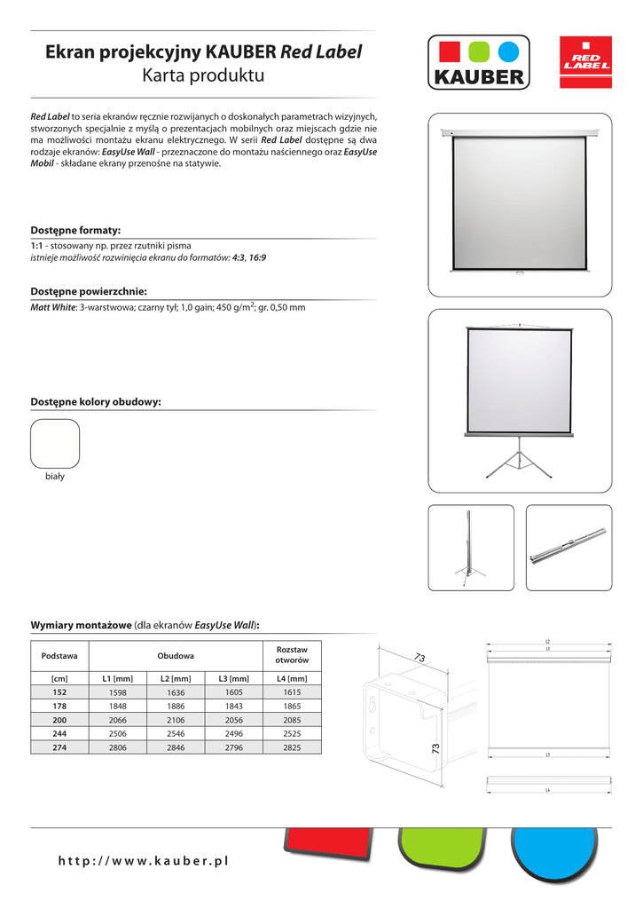 Ekran projekcyjny KAUBER Red Label Karta produktu Red Label to seria ekranów ręcznie rozwijanych o doskonałych parametrach wizyjnych, stworzonych specjalnie z myślą o prezentacjach mobilnych oraz miejscach gdzie nie ma możliwości montażu ekranu elektrycznego. W serii Red Label dostępne są dwa rodzaje ekranów: EasyUse Wall - przeznaczone do montażu naściennego oraz EasyUse Mobil - składane ekrany przenośne na statywie. Dostępne formaty: 1:1 - stosowany np. przez rzutniki pisma istnieje możliwość rozwinięcia ekranu do formatów: 4:3, 16:9 Dostępne powierzchnie: Matt White: 3-warstwowa; czarny tył; 1,0 gain; 450 g/m2; gr. 0,50 mm Dostępne kolory obudowy: biały Wymiary montażowe (dla ekranów EasyUse Wall): Podstawa Rozstaw otworów Obudowa [cm] L1 [mm] L2 [mm] L3 [mm] L4 [mm] 152 1598 1636 1605 1615 178 1848 1886 1843 1865 200 2066 2106 2056 2085 244 2506 2546 2496 2525 274 2806 2846 2796 2825 h t t p : / / w w w. k a u b e r. p l