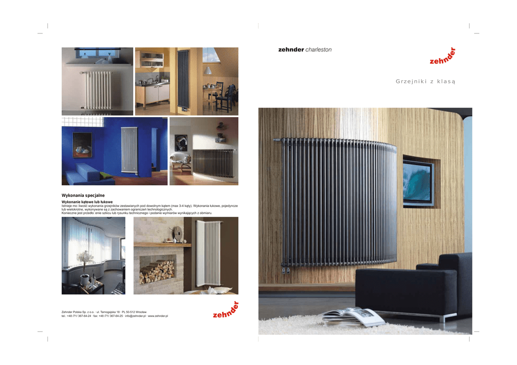 z e h n d e r c h a r l e s t o n Grzejniki z klasą Wykonania specjalne Wykonanie kątowe lub łukowe Istnieje możliwość wykonania grzejników zestawianych pod dowolnym kątem (max 3-4 kąty). Wykonania łukowe, pojedyncze lub wielokrotne, wykonywane są z zachowaniem ograniczeń technologicznych. Konieczne jest przedłożenie szkicu lub rysunku technicznego i podanie wymiarów wynikających z obmiaru. Zehnder Polska Sp. z o.o. . ul. Tarnogajska 18 . PL 50-512 Wrocław tel.: +48 /71/ 367-64-24 . fax: +48 /71/ 367-64-25 . [email protected] . www.zehnder.pl z e h n d e r c h a r l e s t o n z e h n d e r c h a r l e s t o n 2-kolumnowy 3-kolumnowy 140 210 55 5-kolumnowy UWAGA! Podane wymiary montażowe przy użyciu zestawu SMB. Odległość grzejnika od podłogi minimum 100 mm. Długość pojedynczego elementu wynosi 46 mm. 46 173 55 4-kolumnowy H-66* H-66* H-66* 122 136 55 46 100 55 46 62 46 103 238 46 85 201 46 66 164 H-66* 128 H-58* 90 oddawanej przez promieniowanie. W ofercie dostępny także grzejnik „na wymianę” o rozstawie w osiach równym 500 mm, co odpowiada standardowym grzejnikom żeliwnym. Występują wersje zaokrąglone, zestawiane pod kątem, różne warianty przyłączy, także dolne i z zaworem zintegrowanym. Montaż naścienny lub wolnostojący. 6-kolumnowy H Grzejnik ten zbudowany jest z rur stalowych gładkich, poszczególne człony mają od 2 do 6 kolumn i są ze sobą połączone na stałe. Zehnder Charleston nie ma żadnych ostrych krawędzi, charakteryzuje się wysoką wytrzymało-ścią ciśnieniową, nadaje się także do systemów niskotemperaturowych. Ze względu na swoją konstrukcję grzejnik spełnia wysokie wymagania higieniczne, odznacza się dużym udziałem energii Długości grzejników* Zakres dostawy 1 1 Grzejnik w kolorze białym (RAL 9016), złącza na członach bocznych, 4 x /2” (gwint wewn.), 1 x zaślepka /2”, ciśnienie robocze maks. 10 bar, temperatura pracy maks. 120°C. Za dopłatą: kolory Classic, Trendy i Metalic z palety barw Zehnder, kolor Technoline (kolor naturalny, stal powlekana lakierem bezbarwnym), opcjonalnie specjalny lakier antybakteryjny (TopCare), możliwe cynkowanie, niestandardowe złącza (także z zaworem termostatycznym zintegrowanym), kształty specjalne (łuki, także wielokrotne, zestawienia kątowe), wykonania wolnostojące (także jako ścianki działowe), wersja wysokociśnieniowa do 18 bar, grzejniki renowacyjne o rozstawie złącz bocznych 500 mm (inne rozstawy na zapytanie). Ilość elementów [szt.] Długość L [mm] 1 46 2 92 3 138 4 184 5 230 6 276 7 322 8 368 9 414 Zestawy montażowe 10 460 11 506 12 552 W celu zapewnienia bezpieczeństwa użytkowania, do montażu grzejników zaleca się stosowanie fabrycznych konsoli 13 598 14 644 montażowych, w odpowiedniej ilości, zgodnej z zaleceniami do danej długości grzejnika. 15 690 16 736 17 782 Zestaw SMB Zestaw BKE Wspornik podłogowy HFK Wspornik podłogowy spawany 18 828 (wyposażenie standardowe) (uchwyt BH + wieszak BKE) (ilość wsporników taka wysokość regulowana 19 874 jak ilość pionów montażowych) (ilość wsporników taka 20 920 21 966 jak ilość pionów montażowych) 22 1012 1058 23 1104 24 1150 25 1196 26 1242 27 1288 28 1334 29 1380 30 1426 31 1472 32 1518 33 1564 34 1610 35 1656 36 1702 37 1748 38 1794 39 1840 40 1886 41 1932 42 1978 43 2024 44 Złącza standardowe (bez dopłat). 2070 45 2116 46 Przy zamówieniu złożonym bez określenia kodu przyłączy, dostarczony zostanie grzejnik 2162 47 1 2208 48 z poł. standardowym 4 X /2”. Warianty przyłączy standardowych określone zostały poniżej: 2254 49 2300 50 Z O O Z 2346 51 2392 52 2438 53 2484 54 2530 55 K 2567 56 P K P 2622 57 2668 58 2714 59 Z O O Z 2760 60 * bez korków na członach skrajnych Położenie złącz K P P Przyłącza do grzejników Zehnder Charleston Completto (zintegrowany zawór termostatyczny) K Przyłącza niestandardowe (za dopłatą) Zehnder Charleston O P O Z K Z Z O Naprzemiennie P P Z Z P P Z O O O P P O K K Z P Z O O Z Z P 50 mm K K O P Z P O P Z K Z P O Z Dolne O O P Z Z P O P O 50 mm Dolne, środkowe K “ * Modele na wymianę” (2056, 3057, 4057, 5057, 6057) mają rozstaw złącz w osiach równy 500 mm. Z P 50 mm Z = zasilanie, P = powrót, O = odpowietrznik, K = korek. P Z 50 mm K P Z P Z