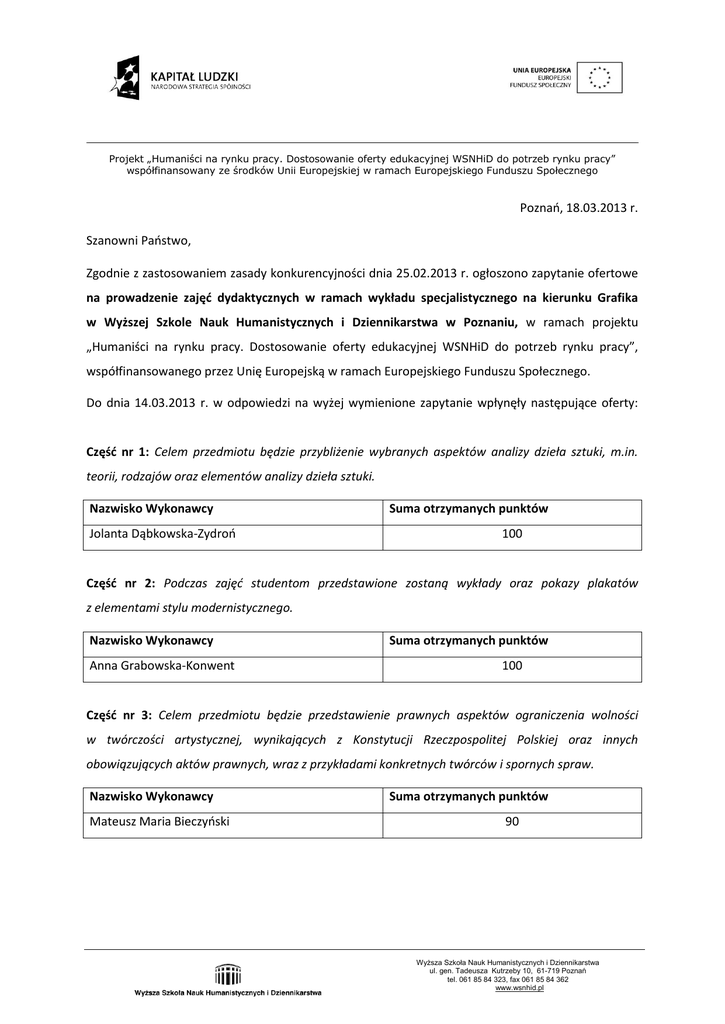 Projekt „Humaniści na rynku pracy. Dostosowanie oferty edukacyjnej WSNHiD do potrzeb rynku pracy” współfinansowany ze środków Unii Europejskiej w ramach Europejskiego Funduszu Społecznego Poznao, 18.03.2013 r. Szanowni Paostwo, Zgodnie z zastosowaniem zasady konkurencyjności dnia 25.02.2013 r. ogłoszono zapytanie ofertowe na prowadzenie zajęć dydaktycznych w ramach wykładu specjalistycznego na kierunku Grafika w Wyższej Szkole Nauk Humanistycznych i Dziennikarstwa w Poznaniu, w ramach projektu „Humaniści na rynku pracy. Dostosowanie oferty edukacyjnej WSNHiD do potrzeb rynku pracy”, współfinansowanego przez Unię Europejską w ramach Europejskiego Funduszu Społecznego. Do dnia 14.03.2013 r. w odpowiedzi na wyżej wymienione zapytanie wpłynęły następujące oferty: Część nr 1: Celem przedmiotu będzie przybliżenie wybranych aspektów analizy dzieła sztuki, m.in. teorii, rodzajów oraz elementów analizy dzieła sztuki. Nazwisko Wykonawcy Jolanta Dąbkowska-Zydroo Suma otrzymanych punktów 100 Część nr 2: Podczas zajęd studentom przedstawione zostaną wykłady oraz pokazy plakatów z elementami stylu modernistycznego. Nazwisko Wykonawcy Anna Grabowska-Konwent Suma otrzymanych punktów 100 Część nr 3: Celem przedmiotu będzie przedstawienie prawnych aspektów ograniczenia wolności w twórczości artystycznej, wynikających z Konstytucji Rzeczpospolitej Polskiej oraz innych obowiązujących aktów prawnych, wraz z przykładami konkretnych twórców i spornych spraw. Nazwisko Wykonawcy Mateusz Maria Bieczyoski Suma otrzymanych punktów 90 Wyższa Szkoła Nauk Humanistycznych i Dziennikarstwa ul. gen. Tadeusza Kutrzeby 10, 61-719 Poznań tel. 061 85 84 323, fax 061 85 84 362 www.wsnhid.pl Projekt „Humaniści na rynku pracy. Dostosowanie oferty edukacyjnej WSNHiD do potrzeb rynku pracy” współfinansowany ze środków Unii Europejskiej w ramach Europejskiego Funduszu Społecznego Część nr 4: Celem zajęd będzie przybliżenie historii powstania, rozkwitu oraz fenomenu Polskiej szkoły plakatu oraz jej twórców. Nazwisko Wykonawcy Suma otrzymanych punktów Irena Przymus 100 Część nr 5: Tematyka wykładu obejmie typografię, ze szczególnym uwzględnieniem typografii książki oraz podstaw edytorstwa. Nazwisko Wykonawcy Suma otrzymanych punktów Ryszard Bienert 80 Dnia 18.03.2013 r. dokonany został wybór najkorzystniejszych ofert. Jako Wykonawców usług na poszczególne części zamówienia wybrano: Lp./ Ilość godzin Nazwisko Wykonawcy Ilość punktów 1 15 Jolanta Dąbkowska-Zydroo 100 2 15 Anna Grabowska-Konwent 100 3 10 Mateusz Maria Bieczyoski 90 4 10 Irena Przymus 100 5 10 Ryszard Bienert 80 nr części Wybrane oferty są najkorzystniejsze i spełniają wszystkie wymogi formalne zapytania ofertowego. Wszystkim Oferentom dziękujemy za złożenie ofert. Wyższa Szkoła Nauk Humanistycznych i Dziennikarstwa ul. gen. Tadeusza Kutrzeby 10, 61-719 Poznań tel. 061 85 84 323, fax 061 85 84 362 www.wsnhid.pl