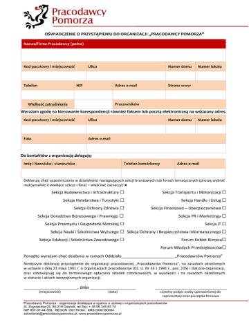 OŚWIADCZENIE O PRZYSTĄPIENIU DO ORGANIZACJI „PRACODAWCY POMORZA” Nazwa/Firma Pracodawcy (pełna) Kod pocztowy i miejscowość Telefon Ulica Numer domu NIP Adres e-mail Wielkość zatrudnienia Numer lokalu Strona www Pracowników Wyrażam zgodę na kierowanie korespondencji również faksem lub pocztą elektroniczną na wskazany adres: Kod pocztowy i miejscowość Ulica Numer domu Faks Adres e-mail Numer lokalu Do kontaktów z organizacją deleguję: Imię i Nazwisko / stanowisko Telefon komórkowy Adres e-mail Deklaruję chęć uczestniczenia w działalności następujących sekcji branżowych lub forach tematycznych (proszę wybrać maksymalnie 2 wiodące sekcje i fora) – właściwe zaznaczyć X □ Sekcja Hotelarstwa i Turystyki □ Sekcja Ochrony Zdrowia □ Sekcja Doradztwa Biznesowego i Prawnego □ Sekcja Przemysłu i Gospodarki Morskiej □ Sekcja Nauki i Szkolnictwa Wyższego □ Sekcja Edukacji i Szkolnictwa Zawodowego □ Sekcja Budownictwa i Infrastruktury □ Sekcja Handlu i Usług □ Sekcja Finansowo – Ubezpieczeniowa □ Sekcja PR i Marketingu □ Sekcja IT □ Sekcja Ochrony i Bezpieczeństwa Informatycznego □ Forum Kobiet Biznesu□ Forum Młodych Przedsiębiorców□ Sekcja Transportu i Motoryzacji Ponadto wyrażam chęć działania w ramach Oddziału____________________________ „Pracodawców Pomorza” Niniejszym deklaruję przystąpienie do organizacji pracodawczej „Pracodawców Pomorza”, na zasadach określonych w ustawie z dnia 23 maja 1991 r. o organizacjach pracodawców (Dz. U. Nr 55 z 1991 r., poz. 235) i statucie organizacji, oraz zobowiązuję się do terminowego opłacania składek członkowskich, w wysokości i na zasadach określonych w statucie i aktach wewnętrznych organizacji. _____________________, dnia __________________ (miejscowość) (data) ____________________________ czytelny podpis osoby upoważnionej do reprezentacji oraz pieczątka firmowa Pracodawcy Pomorza - organizacja działająca w oparciu o ustawę o organizacjach pracodawców Al. Zwycięstwa 24, 80-219 Gdańsk, tel./fax: + 48 58 345 83 74 NIP 957-07-44-558, REGON 190179164, KRS 0000160084 [email protected], www.pracodawcypomorza.pl Wysokość składek członkowskich z tytułu przynależności do organizacji „Pracodawcy Pomorza” Wysokość składki miesięcznej: Lp. 1. 2. 3. 4. 5. 6. 7. 8. 9. 10. 11. 12. 13. 14. 15. Przedziały zatrudnienia do 5 pracowników od 6 do 10 pracowników od 11 do 20 pracowników od 21 do 50 pracowników od 51 do 100 pracowników od 101 do 150 pracowników od 151 do 200 pracowników od 201 do 300 pracowników od 301 do 400 pracowników od 401 do 500 pracowników od 501 do 750 pracowników od 751 do 1000 pracowników od 1001 do 1500 pracowników od 1501 do 2000 pracowników > 2000 pracowników Składka obowiązująca od 01.01.2008r. 40 zł 60 zł 80 zł 100 zł 140 zł 230 zł 275 zł 350 zł 370 zł 390 zł 440 zł 540 zł 700 zł 800 zł 950 zł Składka członkowska zaliczana jest w poczet kosztów uzyskania przychodu do wysokości 0,15% funduszu płac z roku ubiegłego zgodnie z rozporządzeniem Rady Ministrów z dnia 12 marca 2002 roku w sprawie wysokości, do jakiej składka na rzecz związku pracodawców jest zaliczana w koszt uzyskania przychodu. (Dz.U. z 2002 roku, Nr 34, poz. 310 ze zm.). Dokumenty niezbędne do przystąpienia do organizacji „Pracodawcy Pomorza” : Deklaracja członkowska prawidłowo wypełniona, podpisana czytelnie przez osobę upoważnioną Wyciąg z Krajowego Rejestru Sądowego przystępującej jednostki organizacyjnej (kserokopia) lub Zaświadczenie o wpisie do ewidencji działalności gospodarczej lub Uchwała właściwych statutowych organów w sprawie przystąpienia do „Pracodawców Pomorza” (jeśli wymagana statutem przystępującej jednostki organizacyjnej). Pracodawcy Pomorza - organizacja działająca w oparciu o ustawę o organizacjach pracodawców Al. Zwycięstwa 24, 80-219 Gdańsk, tel./fax: + 48 58 345 83 74 NIP 957-07-44-558, REGON 190179164, KRS 0000160084 [email protected], www.pracodawcypomorza.pl