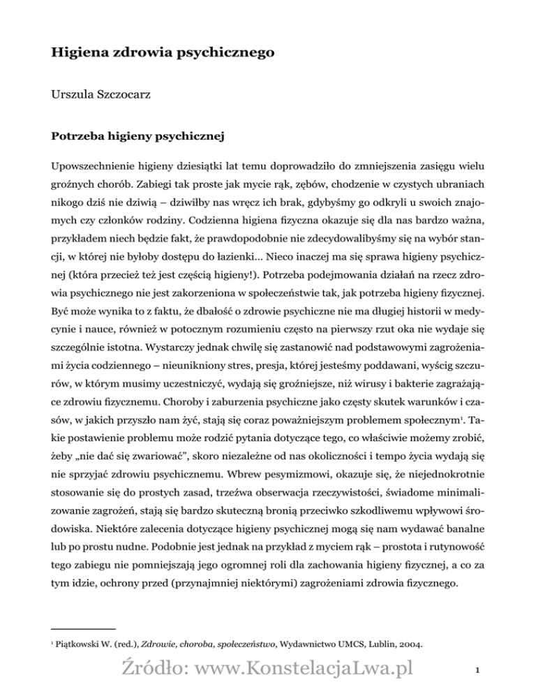 Higiena zdrowia psychicznego Urszula Szczocarz Potrzeba higieny psychicznej Upowszechnienie higieny dziesiątki lat temu doprowadziło do zmniejszenia zasięgu wielu groźnych chorób. Zabiegi tak proste jak mycie rąk, zębów, chodzenie w czystych ubraniach nikogo dziś nie dziwią – dziwiłby nas wręcz ich brak, gdybyśmy go odkryli u swoich znajomych czy członków rodziny. Codzienna higiena fizyczna okazuje się dla nas bardzo ważna, przykładem niech będzie fakt, że prawdopodobnie nie zdecydowalibyśmy się na wybór stancji, w której nie byłoby dostępu do łazienki… Nieco inaczej ma się sprawa higieny psychicznej (która przecież też jest częścią higieny!). Potrzeba podejmowania działań na rzecz zdrowia psychicznego nie jest zakorzeniona w społeczeństwie tak, jak potrzeba higieny fizycznej. Być może wynika to z faktu, że dbałość o zdrowie psychiczne nie ma długiej historii w medycynie i nauce, również w potocznym rozumieniu często na pierwszy rzut oka nie wydaje się szczególnie istotna. Wystarczy jednak chwilę się zastanowić nad podstawowymi zagrożeniami życia codziennego – nieunikniony stres, presja, której jesteśmy poddawani, wyścig szczurów, w którym musimy uczestniczyć, wydają się groźniejsze, niż wirusy i bakterie zagrażające zdrowiu fizycznemu. Choroby i zaburzenia psychiczne jako częsty skutek warunków i czasów, w jakich przyszło nam żyć, stają się coraz poważniejszym problemem społecznym1. Takie postawienie problemu może rodzić pytania dotyczące tego, co właściwie możemy zrobić, żeby „nie dać się zwariować”, skoro niezależne od nas okoliczności i tempo życia wydają się nie sprzyjać zdrowiu psychicznemu. Wbrew pesymizmowi, okazuje się, że niejednokrotnie stosowanie się do prostych zasad, trzeźwa obserwacja rzeczywistości, świadome minimalizowanie zagrożeń, stają się bardzo skuteczną bronią przeciwko szkodliwemu wpływowi środowiska. Niektóre zalecenia dotyczące higieny psychicznej mogą się nam wydawać banalne lub po prostu nudne. Podobnie jest jednak na przykład z myciem rąk – prostota i rutynowość tego zabiegu nie pomniejszają jego ogromnej roli dla zachowania higieny fizycznej, a co za tym idzie, ochrony przed (przynajmniej niektórymi) zagrożeniami zdrowia fizycznego. 1 Piątkowski W. (red.), Zdrowie, choroba, społeczeństwo, Wydawnictwo UMCS, Lublin, 2004. Źródło: www.KonstelacjaLwa.pl 1 Złe nawyki związane z higieną zdrowia fizycznego stosunkowo łatwo zweryfikować i naprawić. Ponieważ przestrzeganie higieny zdrowia psychicznego nie jest tak oczywiste, tutaj dostrzeżenie błędów i szkodliwych nawyków, wymaga często refleksji nad sobą i swoim życiem, a zmiana przyzwyczajeń pociąga za sobą pewien wysiłek. Praktyka wskazuje jednak, że warto go podjąć, a raczej – warto go podejmować wciąż na nowo. Niniejszy artykuł zawiera kilka prostych wskazówek, jak zacząć. Zdrowie psychiczne „Nie szukaj zdrowia psychicznego, szukaj rozwoju, a znajdziesz jedno i drugie” – pisał Kazimierz Dąbrowski2. Zgodnie z zapoczątkowaną przez niego koncepcją, zdrowie psychiczne ujmuje się dziś w sposób dynamiczny – jako wciąż trwający proces autorozwoju osobistego i duchowego. Osoba zdrowa psychicznie nie tylko nie ma żadnych chorób i zaburzeń. Co więcej – osoba zdrowa psychicznie nie zadowala się raz osiągniętym dobrostanem psychicznym. Osoba zdrowa psychicznie nieustannie dąży do tego, by z dnia na dzień stawać się coraz lepszym człowiekiem, odpowiedzialnym za siebie i za innych, żyjącym zgodnie z pozytywnymi wartościami, poprawiającym jakość bytowania świata3. Zdrowie psychiczne wiąże się z realistyczną samooceną, kształtowaniem odporności na codzienne stresy, radzeniem sobie w życiowych sytuacjach, włączaniem trudnych doświadczeń w swój światopogląd. Jednocześnie osobę zdrową psychicznie cechuje zdolność empatii, miłości, przyjaźni i gotowość niesienia pomocy innym ludziom. Ważnym wyznacznikiem zdrowia psychicznego jest także posiadanie krytycyzmu w ocenie własnej osoby oraz wartości i postaw prezentowanych przez innych. Ponadto świadomość, że nie da się określić szczytu zdrowia psychicznego powinna napawać nas nadzieją. Oznacza to bowiem, że w tej dziedzinie nigdy nie zagrozi nam rutyna, nuda, stagnacja. Zawsze stoją przed nami nowe wyzwania, zawsze pozostaje coś do osiągnięcia w sferze duchowej, psychicznej i moralnej4. Dąbrowski K., Dezintegracja pozytywna, Państwowy Instytut Wydawniczy, Warszawa, 1979. Kobierzycki T., (red.), Higiena psychiczna dla studentów medycyny, Dział Wydawnictw Akademii Medycznej, Warszawa, 1993. 4 Dąbrowski K., Dezintegracja pozytywna, Państwowy Instytut Wydawniczy, Warszawa, 1979; Kobierzycki T. (red.), Higiena psychiczna dla studentów medycyny. Dział Wydawnictw Akademii Medycznej, Warszawa, 1993. 2 3 2 Źródło: www.KonstelacjaLwa.pl Zagrożenia dla zdrowia psychicznego Coraz częściej można spotkać się z opinią, że czasy w których żyjemy, sprzyjają powstawaniu najróżniejszych zaburzeń psychicznych. Czyhające na współczesnego człowieka zagrożenia otaczają go ze wszech stron, w tym także w rodzinie, na studiach, w pracy… W światopoglądzie wielu osób na dalszy plan odchodzą relacje, wartości społeczne, ogólnoludzkie dobro, rozwijanie sfery duchowej. Wśród priorytetów jawią się natomiast wartości materialistyczne i egoistyczne. Wyznacznikiem szczęścia jest sukces – mierzony w gotówce lub liczbie osiągnięć. Takie nastawienie nie sprzyja rozwijaniu zdrowia psychicznego, uruchamia bowiem mechanizmy hamujące rozwój człowieka5. Psychologowie alarmują, że szczególnie narażone są tutaj dzieci i młodzież. Dzieci jednak podlegają jeszcze rodzicom i nauczycielom, są adresatami rozmaitych programów profilaktycznych i związanych z promocją zdrowia psychicznego6. Dopiero idąc na studia wyzwala