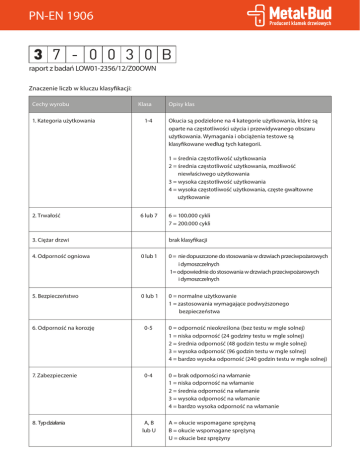 PN-EN 1906 3 7 - 0 0 3 0 B raport z badań LOW01-2356/12/Z00OWN Znaczenie liczb w kluczu klasyfikacji: Cechy wyrobu 1. Kategoria użytkowania Klasa 1-4 Opisy klas Okucia są podzielone na 4 kategorie użytkowania, które są oparte na częstotliwości użycia i przewidywanego obszaru użytkowania. Wymagania i obciążenia testowe są klasyfikowane według tych kategorii. 1 = średnia częstotliwość użytkowania 2 = średnia częstotliwość użytkowania, możliwość niewłaściwego użytkowania 3 = wysoka częstotliwość użytkowania 4 = wysoka częstotliwość użytkowania, częste gwałtowne użytkowanie 2. Trwałość 6 lub 7 3. Ciężar drzwi 6 = 100.000 cykli 7 = 200.000 cykli brak klasyfikacji 4. Odporność ogniowa 0 lub 1 0 = nie dopuszczone do stosowania w drzwiach przeciwpożarowych i dymoszczelnych 1= odpowiednie do stosowania w drzwiach przeciwpożarowych i dymoszczelnych 5. Bezpieczeństwo 0 lub 1 0 = normalne użytkowanie 1 = zastosowania wymagające podwyższonego bezpieczeństwa 6. Odporność na korozję 0-5 0 = odporność nieokreślona (bez testu w mgle solnej) 1 = niska odporność (24 godziny testu w mgle solnej) 2 = średnia odporność (48 godzin testu w mgle solnej) 3 = wysoka odporność (96 godzin testu w mgle solnej) 4 = bardzo wysoka odporność (240 godzin testu w mgle solnej) 7. Zabezpieczenie 0-4 0 = brak odporności na włamanie 1 = niska odporność na włamanie 2 = średnia odporność na włamanie 3 = wysoka odporność na włamanie 4 = bardzo wysoka odporność na włamanie 8. Typ działania A, B lub U A = okucie wspomagane sprężyną B = okucie wspomagane sprężyną U = okucie bez sprężyny