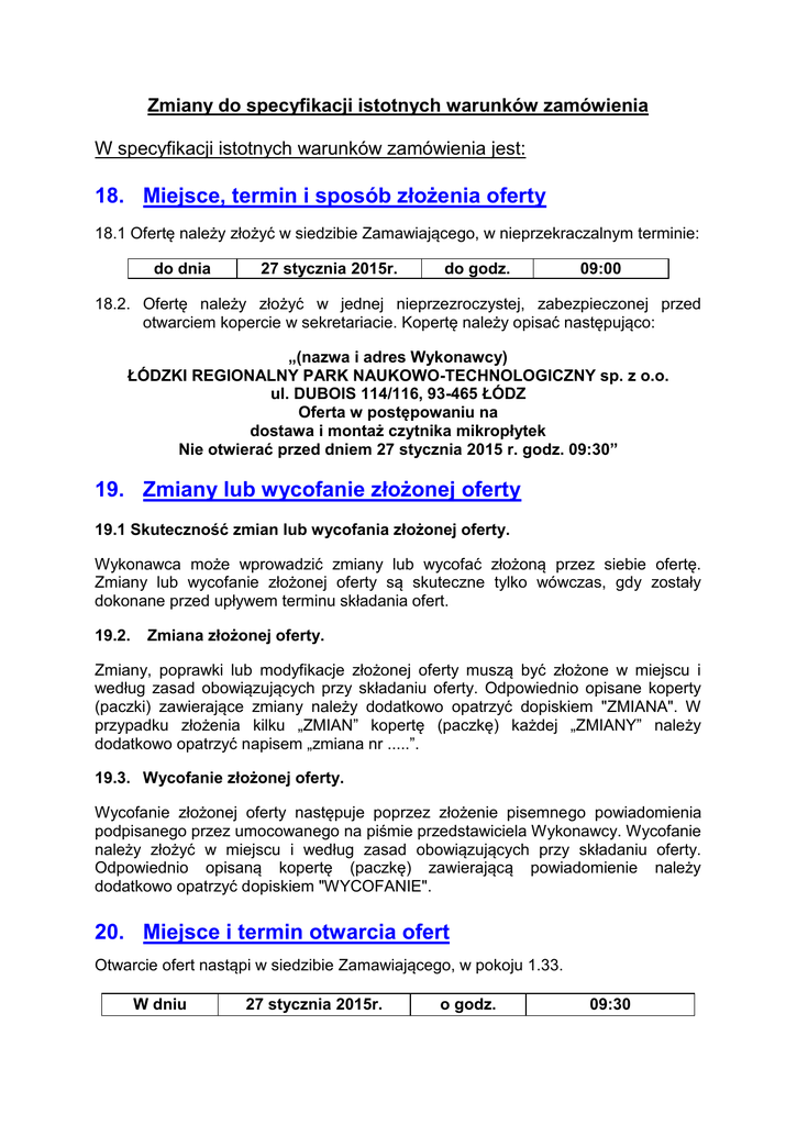 Zmiany do specyfikacji istotnych warunków zamówienia W specyfikacji istotnych warunków zamówienia jest: 18. Miejsce, termin i sposób złożenia oferty 18.1 Ofertę należy złożyć w siedzibie Zamawiającego, w nieprzekraczalnym terminie: do dnia 27 stycznia 2015r. do godz. 09:00 18.2. Ofertę należy złożyć w jednej nieprzezroczystej, zabezpieczonej przed otwarciem kopercie w sekretariacie. Kopertę należy opisać następująco: „(nazwa i adres Wykonawcy) ŁÓDZKI REGIONALNY PARK NAUKOWO-TECHNOLOGICZNY sp. z o.o. ul. DUBOIS 114/116, 93-465 ŁÓDZ Oferta w postępowaniu na dostawa i montaż czytnika mikropłytek Nie otwierać przed dniem 27 stycznia 2015 r. godz. 09:30” 19. Zmiany lub wycofanie złożonej oferty 19.1 Skuteczność zmian lub wycofania złożonej oferty. Wykonawca może wprowadzić zmiany lub wycofać złożoną przez siebie ofertę. Zmiany lub wycofanie złożonej oferty są skuteczne tylko wówczas, gdy zostały dokonane przed upływem terminu składania ofert. 19.2. Zmiana złożonej oferty. Zmiany, poprawki lub modyfikacje złożonej oferty muszą być złożone w miejscu i według zasad obowiązujących przy składaniu oferty. Odpowiednio opisane koperty (paczki) zawierające zmiany należy dodatkowo opatrzyć dopiskiem "ZMIANA". W przypadku złożenia kilku „ZMIAN” kopertę (paczkę) każdej „ZMIANY” należy dodatkowo opatrzyć napisem „zmiana nr .....”. 19.3. Wycofanie złożonej oferty. Wycofanie złożonej oferty następuje poprzez złożenie pisemnego powiadomienia podpisanego przez umocowanego na piśmie przedstawiciela Wykonawcy. Wycofanie należy złożyć w miejscu i według zasad obowiązujących przy składaniu oferty. Odpowiednio opisaną kopertę (paczkę) zawierającą powiadomienie należy dodatkowo opatrzyć dopiskiem "WYCOFANIE". 20. Miejsce i termin otwarcia ofert Otwarcie ofert nastąpi w siedzibie Zamawiającego, w pokoju 1.33. W dniu 27 stycznia 2015r. o godz. 09:30 W specyfikacji istotnych warunków zamówienia być powinno: 18. Miejsce, termin i sposób złożenia oferty 18.1 Ofertę należy złożyć w siedzibie Zamawiającego, w nieprzekraczalnym terminie: do dnia 30 stycznia 2015r. do godz. 09:00 18.2. Ofertę należy złożyć w jednej nieprzezroczystej, zabezpieczonej przed otwarciem kopercie w sekretariacie. Kopertę należy opisać następująco: „(nazwa i adres Wykonawcy) ŁÓDZKI REGIONALNY PARK NAUKOWO-TECHNOLOGICZNY sp. z o.o. ul. DUBOIS 114/116, 93-465 ŁÓDZ Oferta w postępowaniu na dostawa i montaż czytnika mikropłytek Nie otwierać przed dniem 30 stycznia 2015 r. godz. 09:30” 19. Zmiany lub wycofanie złożonej oferty 19.1 Skuteczność zmian lub wycofania złożonej oferty. Wykonawca może wprowadzić zmiany lub wycofać złożoną przez siebie ofertę. Zmiany lub wycofanie złożonej oferty są skuteczne tylko wówczas, gdy zostały dokonane przed upływem terminu składania ofert. 19.2. Zmiana złożonej oferty. Zmiany, poprawki lub modyfikacje złożonej oferty muszą być złożone w miejscu i według zasad obowiązujących przy składaniu oferty. Odpowiednio opisane koperty (paczki) zawierające zmiany należy dodatkowo opatrzyć dopiskiem "ZMIANA". W przypadku złożenia kilku „ZMIAN” kopertę (paczkę) każdej „ZMIANY” należy dodatkowo opatrzyć napisem „zmiana nr .....”. 19.3. Wycofanie złożonej oferty. Wycofanie złożonej oferty następuje poprzez złożenie pisemnego powiadomienia podpisanego przez umocowanego na piśmie przedstawiciela Wykonawcy. Wycofanie należy złożyć w miejscu i według zasad obowiązujących przy składaniu oferty. Odpowiednio opisaną kopertę (paczkę) zawierającą powiadomienie należy dodatkowo opatrzyć dopiskiem "WYCOFANIE". 20. Miejsce i termin otwarcia ofert Otwarcie ofert nastąpi w siedzibie Zamawiającego, w pokoju 1.33. W dniu 30 stycznia 2015r. o godz. 09:30