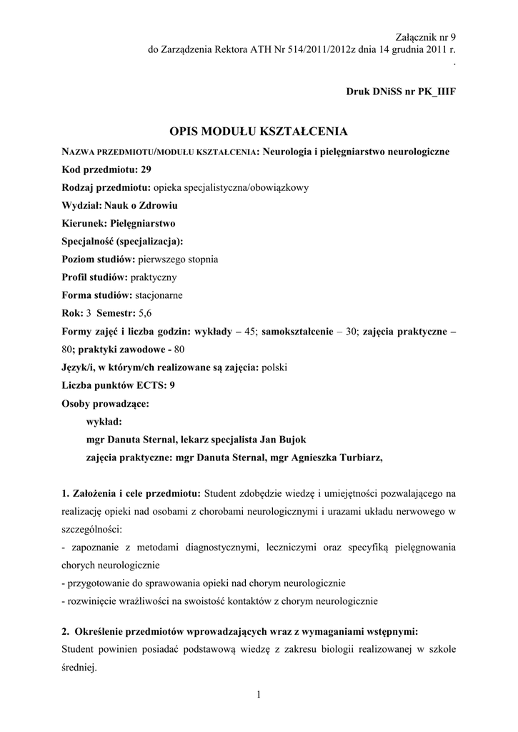 Załącznik nr 9 do Zarządzenia Rektora ATH Nr 514/2011/2012z dnia 14 grudnia 2011 r. . Druk DNiSS nr PK_IIIF OPIS MODUŁU KSZTAŁCENIA NAZWA PRZEDMIOTU/MODUŁU KSZTAŁCENIA: Neurologia i pielęgniarstwo neurologiczne Kod przedmiotu: 29 Rodzaj przedmiotu: opieka specjalistyczna/obowiązkowy Wydział: Nauk o Zdrowiu Kierunek: Pielęgniarstwo Specjalność (specjalizacja): Poziom studiów: pierwszego stopnia Profil studiów: praktyczny Forma studiów: stacjonarne Rok: 3 Semestr: 5,6 Formy zajęć i liczba godzin: wykłady – 45; samokształcenie – 30; zajęcia praktyczne – 80; praktyki zawodowe - 80 Język/i, w którym/ch realizowane są zajęcia: polski Liczba punktów ECTS: 9 Osoby prowadzące: wykład: mgr Danuta Sternal, lekarz specjalista Jan Bujok zajęcia praktyczne: mgr Danuta Sternal, mgr Agnieszka Turbiarz, 1. Założenia i cele przedmiotu: Student zdobędzie wiedzę i umiejętności pozwalającego na realizację opieki nad osobami z chorobami neurologicznymi i urazami układu nerwowego w szczególności: - zapoznanie z metodami diagnostycznymi, leczniczymi oraz specyfiką pielęgnowania chorych neurologicznie - przygotowanie do sprawowania opieki nad chorym neurologicznie - rozwinięcie wrażliwości na swoistość kontaktów z chorym neurologicznie 2. Określenie przedmiotów wprowadzających wraz z wymaganiami wstępnymi: Student powinien posiadać podstawową wiedzę z zakresu biologii realizowanej w szkole średniej. 1 3. Opis form zajęć 1a) Wykłady(mgr Danuta Sternal) Treści programowe (tematyka zajęć): 1. Nowoczesne metody diagnostyczne stosowane w neurologii – zadania pielęgniarki: przed badaniem, w trakcie badania, po badaniu 2. Zespoły i objawy w neurologii – zaburzenia przytomności, zaburzenia świadomości, inne zaburzenia neurologiczne, skale oceny 3. Udział pielęgniarki w diagnozowaniu i leczeniu chorych; wstępna ocena stanu ogólnego chorego, wywiad – swoistość zbierania informacji od pacjenta i jego rodziny, znaczenie badania przedmiotowego, rozpoznanie stanów zagrożenia życia, udział w planowanym leczeniu i interwencjach leczniczych 4. Pielęgnowanie chorych po udarach mózgu – przyczyny udarów, Narodowy Program Profilaktyki i Leczenia Udaru Mózgu, rozpoznanie wczesnych objawów i I pomoc, postępowanie pielęgniarskie w powikłaniach ostrych i przewlekłych, znaczenie metody Bobath w pielęgnacji i rehabilitacji, postępowanie w zaburzeniach porozumiewania się, edukacja, postępowanie w przypadku krwotoku podpajęczynówkowego 5. Model opieki pielęgniarskiej nad pacjentami z chorobą Parkinsona, miastenią, stwardnieniem rozsianym, dyskopatią 6. Specyfika opieki nad chorym z padaczką – postępowanie podczas napadu drgawkowego, styl życia chorego na padaczkę 7. Udział pielęgniarki w diagnozowaniu i leczeniu chorych z nowotworami OUN 8. Zabiegi operacyjne w obrębie czaszki – znaczenie opieki pielęgnacyjnej przed i po zabiegu 2a) Wykłady(lek.specj. Jan Bujok) Treści programowe (tematyka zajęć): Etiopatogeneza, postacie, przebieg oraz postępowanie diagnostyczno-terapeutyczne i pielęgnacyjne w schorzeniach neurologicznych; neuropatie obwodowe; stwardnienie zanikowe boczne; choroba Parkinsona; stwardnienie rozsiane; udar mózgu. 1.Badanie neurologiczne. Zaburzenia czucia ,ruchu i napięcia mięśniowego .Zespoły neurologiczne. 2.Zaburzenia przytomności .Zaburzenia podstawowych funkcji życiowych i ich wpływ na funkcje układu nerwowego. 3.metody diagnostyczne stosowane w neurologii (badanie płynu mózgowo –rdzeniowego ,zdjęcie przeglądowe ,tomografia komputerowa, rezonans magnetyczny ,EEG, EMG ,potencjały wywołane , przezczaszkowa ultrasonografia dopplerowska . 4. Wrodzone i rozwojowe uszkodzenia ośrodkowego układu nerwowego ( zaburzenia indukcji grzbietowej ,zaburzenia indukcji brzusznej, zaburzenia podziału i różnicowania komórek, zaburzenia migracji komórkowej, zaburzenia mielinizacji) , 2 5.choroby naczyniowe mózgu (udar mózgu ,przemijające napady niedokrwienne mózgu ,krwotoczny udar mózgu ,krwotok podpajęczynówkowy i tętniaki ośrodkowego układu nerwowego ,zakrzep żylny wewnątrzczaszkowy ) 6.Urazy czaszkowo- mózgowe. 7.Urazy kręgosłupa i rdzenia kręgowego. 8.Guzy mózgu (guzy pierwotne ,guzy przerzutowe) 9.Guzy kanału kręgowego (guzy zewnątrzrdzeniowe ,guzy wewnątrzdzeniowe ) 10.Zakażenia ośrodkowego układu nerwowego (bakteryjne zapalenie opon mózgowordzeniowych ,wirusowe zapalenie opon mózgowo –rdzeniowych ,ropień mózgu ) 11.Choroby demielinizacyjne (stwardnienie rozsiane ) 12.Choroba neuronu ruchowego (stwardnienie zanikowe boczne) 13.Zespoły tunelowe kończyny górnej (zespół cieśni nadgarstka- etiologia ,diagnostyka ,leczenie ) 14.Wodogłowie (etiologia ,diagnostyka ,leczenie ) 15.Choroby otępienne (choroba Alzheimera, otępienie naczyniopochodne, otępienie z ciałkami Levy’ego, otępienie czołowo –skroniowe ) 16.Choroby układu pozapiramidowego (choroba Parkinsona ) 17.Choroba krążków międzykręgowych (dyskopatia szyjna ,dyskopatia lędźwiowa) 18.Padaczka (etiologia ,diagnostyka ,leczenie ) 19.Miastenia i zespoły miasteniczne (miestenia rzekomopraźna , zespół Lamberta –Eatona) 20.Bóle i neuralgie głowy i twarzy (migrena, trigeminalgia –etiologia ,diagnostyka ,leczenie) 21.Neuropatie obwodowe (Zespół Guillaina –Barryego-etiologia ,diagnostyka ,leczenie) 22.Zawroty głowy (choroba Meniere’a- etiologia ,diagnostyka ,leczenie ) b) samokształcenie Student zapoznaje się z treściami w zakresie niżej wymienionych tematów, następnie samodzielnie lub przy pomocy nauczyciela wybiera temat z przygotowanego zestawu . Zadanie ma charakter pisemny: esej. Przykładowe tezy programowe do samokształcenia: 1.Znaczenie form wsparcia chorego ze schorzeniem neurologicznym na przykładzie wybranej jednostki chorobowej. 2. Znaczenie psychoterapii elementarnej w zaburzeniach emocjonalnych. 3. Formy opieki nad ludźmi przewlekle chorymi neurologicz