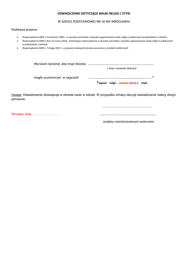 OŚWIADCZENIE DOTYCZĄCE NAUKI RELIGII / ETYKI W SZKOLE PODSTAWOWEJ NR 16 WE WROCŁAWIU Podstawa prawna: Rozporządzenie MEN z 14 kwietnia 1992 r. w sprawie warunków i sposobu organizowania nauki religii w publicznych przedszkolach i szkołach Rozporządzenie MEN z dnia 15 marca 2014r. zmieniające rozporządzenie w sprawie warunków i sposobu organizowania nauki religii w publicznych przedszkolach i szkołach Rozporządzenie MEN z 7 lutego 2012 r. w sprawie ramowych planów nauczania w szkołach publicznych Wyrażam życzenie, aby moje dziecko ………………………………………………………………………. ( imię i nazwisko dziecka) mogło uczestniczyć w zajęciach ……………………………………………………………………..* *wpisać: religii ... (wpisać jakiej) / etyki Uwaga: Oświadczenie obowiązuje w okresie nauki w szkole. W przypadku zmiany decyzji oświadczenie należy złożyć ponownie. ......................................................... Wrocław, dnia……………………… …………………………………………………………… (podpisy rodziców/prawnych opiekunów)