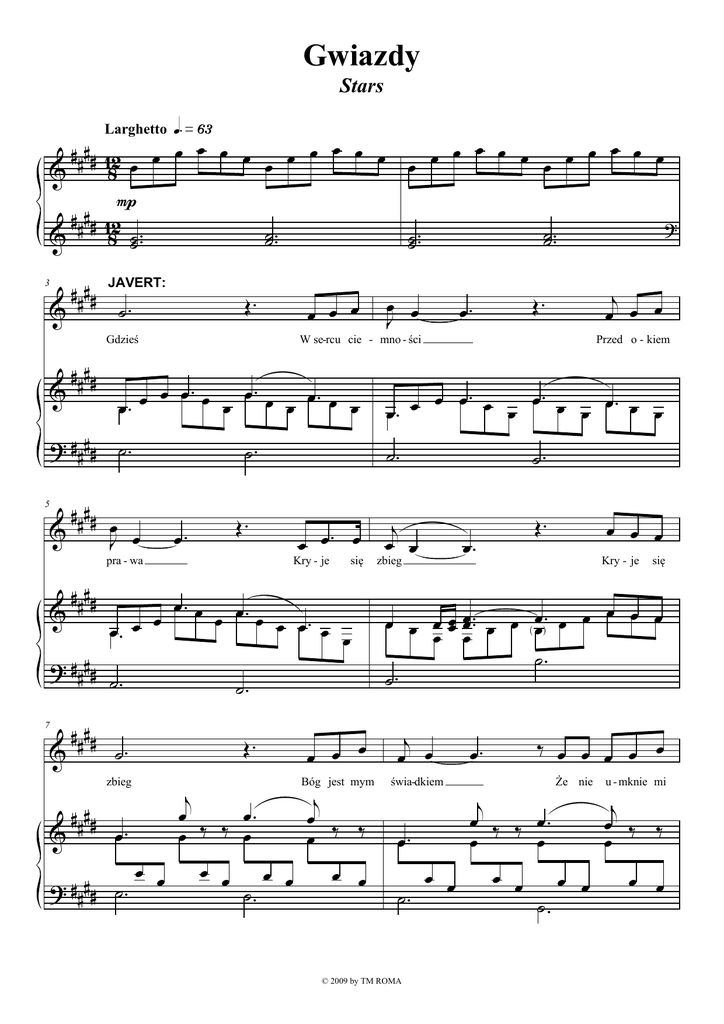 Gwiazdy Stars »§£ Larghetto qk # # # # 12 œ œ œ œ œ œ œ œ œ œ œ œ œ œ œ œ œ œ œ œ œ œ œ œ & 8 P # # # # 12 ? ˙˙ .. ˙˙ .. & 8 ˙˙ .. ˙˙ .. 3 & #### JAVERT: Œ. ˙. œ œ œ Gdzieś & #### œ œ. œ œ. œ œ. œ œ œ. œ œ œ ˙. #### œ & J œ pra - wa & #### ? #### 7 & #### œ. œ œ ˙. & #### Œ. œ. Kry - je ? #### ˙ . się œ. œ œ. œ œ œ œ. œ œ Œ. ˙. œ. œ œ. œ ˙. zbieg œ œ j œ œ œ Œ. œ. W se-rcu cie - mno - ści ? #### ˙ . 5 œ œ J j œ œ. ‰ ‰ œ œ œ œ ˙. œ œ œ œ. œ œ. œ œ. œ œ œ œ. œ œ ˙. ˙. j œ œ Œ. œ œ œ œ ˙. j œ œ Bóg jest mym świa-dkiem œ œ œ. zbieg œ œ œ j œ ‰ ‰ œ Przed o - kiem œ. Kry - je się œœ œœ .. œ œ ( œœ). œ œ œ œ œ œ ˙. œ œ ˙. © 2009 by TM ROMA œ œ œ ‰ œ œ œ œ œ œ. j œ ‰ ‰ œ. œ œ œ œ ˙. Że nie œ œ u - mknie mi j œ ‰ ‰ œ œ œ Gwiazdy - str. 2 9 & #### ‰ œ œ œ œ œ ˙. Sta - nę z nim twa - rzą ślad & #### ? #### 11 & œ. ˙. #### œ j‰ ‰ œ œ œ. œ œ œ œ. œ ‰ ≈ ˙. w twarz & #### œœ œ ? #### 13 & #### œ. & pochiss. accel. ˙. ? #### 15 & #### œ œ œ œ. ˙. mu #### œ œ œ œ œ. œœ .. œ. Bóg na -gro - dę œœ .. œ. mrok Mnie za nim wie - dzie sam œ œ œ œ. œ œ œ ‰≈ œ œ œ œ œ œ ˙. œœœœ .... œ œ œœ œ œ œ œ. œ œ œ Œ. ma œœ .. œ. œ œ œ œ œ œ A dla tych dla œ œ œ. j ‰ ‰ œ œ œ œ. œ œ. œ œ œ œ Bóg #### œ œ œ œ œ œ œœ Sta - nę z nim twa - rzą œ. œ œ œ œ œœ œœ . œ œ œŒ . œ . œ œ œ Œ. ˙. œ. On się prze-my - ka przez œœ .. œ. w twarz œ œ ˙. ‰ œ œ œ œ. œ ˙. œ œ œœœ ... œ. œ nœ co œ œ Co chcą słu - żyć ˙œ œ œ œ œ œ œ ˙. œ œ œ œ œ. J ‰ ‰ œj 68 Słu - ga - mi są zła & œ œ œ œ nœ œœ œ œ œ œ œ n œœœ .. œ œ nœ œ œ œ œ F n˙. ? #### ˙. œ. ˙. œ. œ. œ j ‰ ‰ œ œ œ. œ spra-wie - dli - wych œœ œ œ .. œœœ .. . Ma Œ. 68 œœ œ œ œœ . œ œ œ . œ. nœ œ œ nœ. œ. 68 Gwiazdy - str. 3 #### 6 œ œ nœ & 8 17 poco rall. œ œ 12 8 ˙. œ miecz Ma Ó. ból >> #### 6 œ 8 a œœœ œ œœ œ & 8 n n œœ œ œ œ œ œ œ œ 12 œ œ œ œ f œ. ? # # # # 68 n ˙ . 12 8 nœ. Œ. 19 & #### A tempo Œ ˙. Noc & #### & #### & ? #### 23 & #### & gwiazd Œ. œ. œ. œ œ œ. œ œ œ. œ œ œ. œ œ ˙. ˙. Œ. œ. ? #### ˙ . œ œ j œ œ. ‰ ‰ œ œ œ œ ˙. œ- . œ. œ œ œ Nie - po - li - œ œ œ œ ˙. œ œ œ œ ‰ ‰ ˙. j œ œ œ œ Po - rzą - dek i œœ œœ .. œ œ ( œœ). œ œ œ œ œ œ ˙. Œ. œ œ œ j œ ‰ ‰ œ. œ œ Trzy - ma - ją œ œ œ œ. œ. œœ . œ œ ˙. œ. To wa - rto - wni - cy j œ œ ‰ ‰ œ œ œ œ œ. œ œ. œ œ. œ œ sfe - rom œœœœ œ. œ. Œ. j œ œ. œ œ œ Na - da - ją ˙. œ. œœœœ ˙. œ œ J blask #### Tak be-zkre-sna od ˙. cza - lne #### ˙. 4 œ œ. œ œ. œ œ œ. œ œ œ. œ œ P ? #### ˙ . 21 j œ œ œ œ œ >˙˙ . ˙˙ ... są œ œ œ œ ˙. œ œ j œ ‰ ‰ œ œ œ Gwiazdy - str. 4 25 & #### ‰ œ œ œ œ œ ˙. straż & #### ? #### 27 & #### œ. ˙. Sto - ję œ j‰ ‰ œ œ œ. œ œ œ œ. œ ‰ ≈ ˙. & ? #### 29 & #### œ œ œ œ. œœ .. œ. œ œ œ œ. Œ. sens & #### ? #### 31 & #### œ œ œœ .. œ œ. œ. ˙. cel o - dwie-cznym œ œ œœ .. œ œ. œ. œ œ œ Œ œ œ œ j œ œ œ œ A kto zgu - bi w o - czach Zna ra -cję by - tu œ œ œ œ. œ œ œ œ œ œ œ œ. W cy - klu zna œœ .. œ. œ tu ‰ ≈œ œ œ œ œ œ ˙. œ œ œ œ œ œ œ œ Sto - ję œ. œ œ . œ œ œ œœœ œ œ œŒ . œ . œ œ œ Œ. ˙. œ. Ka - żdy niech gwia - zdy swe pochiss. accel. œ. gwiazd œ œ ˙. gwiazd #### tu w o-czach ‰ œ œ œ œ. œ ˙. œœœœ .... œ œ œ. œ œ œ. pór œœ œ œ œ. œ œœœ .. . œ œ Mu - si zna - leźć œœ œ œ œœ . œ .. œ .. œ˙ œ œ œ œ œ nœ œ œ swój œ ˙. (non accel.) trop œ ‰ œ œ œ œ. œ ro - ku i sfer œ. i œ œ œ œ œ. J Ten spa -dnie na dno ‰ ‰ œj 68 Na Œ. 68 n œœ .. œ œ œ œœ . œ œ œ œ œ & œ œ œ œ nœ œ œ œ œ . œ œ nœ œ. nœ œ œ œ œ œ œ œ œ œ cresc. F n˙. # ? ## # 68 ˙. œ. nœ. œ. ˙ . œ. œ. #### Gwiazdy - str. 5 #### 6 œ œ nœ & 8 33 pie - #### 6 & 8 n n œœœ œ œ œ ? # # # # 68 n ˙ . Œ. - œ - œ œ - œ nœ. # # # # Aœtempoœ œ & J 35 rzecz œ œ 12 8 ˙. œ - i jak œ œ œ J J Œ świat sta - ra kła #### œ œ œ œ & j œ œ. pra -wy, kto zgu - bił sens >> œ ˙˙˙˙ ... œ . œ œ nœ œ œ J œ œ œ J no u Na-pi - sa Œ & # - Za œ. nœ. nœ. - 6 8 68 ‰ ‰ œ œ œ œ J œ. œ. œ. œ œ œ Wia - do - ma œ- . œ. 4 œ œ œ. œ œ œ œ œ œœ œ J J Kto nie był œ ∑ œ # œ˙ .. œ œ œ œ œ œ . œ œ œœ . œ œœ œ œ œ & ˙ f œ. œ. œ. ? # œ. - j 12 œ œ 8 ˙. cić j œ œ. nnn# Ó. j j‰ ‰ j œ œ . œ œ œœ 12 œœœ œ œ œœ œ œ œœ . œ œ œœœœ ... # œœ œ œ œ 8 . J œ œ. œ. 12 œ. 8 œ. œ J œ. pła to œ. œ. ra - jskich bram: n ˙˙ .. œ œ n œ œ œ œ œ œœ j 6 œ 8 œ. nœ. œ. # # # # œœ .n œ œ œœ . œ œœœ .. œ œ œœ . œ & œœ nœ. œ. ? #### n œ . œ. 40 dno > œ œ 12 8 a œœœ œ œœ œ œ. 12 8 œ # # # # œœœœ . œ œ œœ œ œœ ˙œ . œ œ œ œ œ & œ. œ. # ? ## # œ . œ. œ. 37 rall. molto ma Ó. Œ. nnn# nnn# œ œ œ Pro - szę cię, ˙. œ œ œ œ œ œ Ó. œ œ œ œ œ œ œ. œ. œ. œ. Gwiazdy - str. 6 # œ & J œ 42 j œ œ. œ œ œ Œ. œ. Pa - nie & # Daj mi go œ œ œ œ œ œ œ œ œ œ œ œ ? # ˙. ˙. # ˙. & ‰ œ œ j‰ ‰ œ œ œ œ . œ œ œ œ . œ œ œ œ œœ œ # & œ daj ? # œ. œ. 46 & Ja nie œ. ˙. # ˙. œ. œ œ œ Skła-dam j ‰ œ œ œ œœ œ œ œ œ œ # œ œœ œ œ . œ œ œ œœ & nie ? # ˙. 48 & # & ?# œ œ œ ˙. œ ˙. ˙. œ. O ,œ œ œ œ œ ‰ ˙. rall. Sto - jąc ślub tu w o-czach ‰ œ œ œ œ œ ˙œ . œ œ œ 
