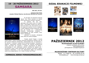 19 - 26 PAŹDZIERNIKA 2012 SAMSARA DZIAŁ EDUKACJI FILMOWEJ USA 2011, 99 min. reżyseria: Ron Fricke muzyka: Michael Stearns, Lisa Gerrard, Marcello De Francisci Po 20 latach od nakręcenia kultowej "Baraki" Ron Fricke powraca na srebrny ekran fenomenalnym obrazem "Samsara". To poetycki film bez słów, zapierająca dech podróż przez 25 krajów i kultur z porywającą muzyką Lisy Gerrard i Dead Can Dance w tle. Film kręcono przez 5 lat, wyłącznie na taśmie 70 mm, co wpłynęło na jego wyjątkową wartość estetyczną. Sam tytuł zaś wywodzi się z sanskryckiego określenia nieustannego przepływu i powtarzającego się cyklu narodzin, życia, śmierci i odrodzenia. „Samsara” to wizualna i dźwiękowa uczta, której nie można przegapić. Trylogia „Quatsi” Reggio z muzyką Philipa Glassa i rwącym potokiem intuicyjnie powiązanych obrazów, jawi się jako pomnik społecznie świadomego, wizjonerskiego kina. W porównaniu z nią „Baraka” i „Samsara” wydają się być bardziej przystępne i łatwiejsze w odbiorze. Jednocześnie stanowią wyzwanie dla nawyków percepcyjnych widza, wyrywając nas chwilowo z naszego przywiązania do fabuły i wprowadzając w stan refleksyjnej zadumy, potrafią być łagodne jak i prowokować. Świat, w który wprowadza nas „Samsara” jest dziwny i piękny, miejscami niepokojący, a przy tym jednocześnie dający się przeniknąć, nawet mimo swego ogromu. /A. O. Scott, The New York Times/ GIMNAZJA, SZKOŁY PONADGIMNAZJALNE PAŹDZIERNIK 2012 MŁODZIEŻOWY KLUB FILMOWY program edukacyjny dla uczniów szkół podstawowych, gimnazjalnych i ponadgimnazjalnych MŁODZIEŻOWE CENTRUM KULTURY Słupsk, al. 3 Maja 22, tel. 0-59 843 54 34 [email protected] www.kinorejs.emcek.pl 12 - 19 PAŹDZIERNIKA 2012 12 – 25 PAŹDZIERNIKA 2012 FELIX, NET I NIKA BITWA POD WIEDNIEM ORAZ TEORETYCZNIE MOŻLIWA KATASTROFA Polska 2012, 99 min. reżyseria: Wiktor Skrzynecki scenariusz: Rafał Kosik, Wiktor Skrzynecki muzyka: Cezary Skubiszewski zdjęcia: Grzegorz Kędzierski obsada: Kamil Klier, Maciej Stolarczyk, Klaudia Łepkowska, Jakub Bohosiewicz, Adam Woronowicz Gimnazjaliści Felix, Net i Nika przeżywają podczas wakacji niezwykłą podróż w czasie. Felix jest młodym wynalazcą, Net znakomicie zna się na komputerach, a Nika ma zdolności paranormalne. Towarzyszy im Manfred, program sztucznej inteligencji stworzony przez Neta i jego tatę. Podczas swoich przygód młodzi bohaterowie napotykają wiele trudności i niebezpieczeństw, ale siła ich przyjaźni i nadzwyczajne umiejętności pomagają im wyjść cało z największych opresji. Powieściowy cykl Rafała Kosika o Feliksie, Necie i Nice to jeden z największych komercyjnych sukcesów ostatnich lat na polskim rynku wydawniczym. (…) Kosik stara się kreślić przekonujące wizje przyszłości, choć zdaje sobie sprawę, jak zawodne bywają prognozy. Największą popularność osiągnął podpisany przez niego cykl powieści science fiction dla młodzieży „Felix, Net i Nika”. Autor postawił na dynamiczną, intrygującą fabułę i wyraziste postaci bohaterów. Jak wielokrotnie podkreślał w wywiadach, pisze z wielkiej potrzeby opowiadania. Nie ucieka przed treściami edukacyjnymi, przedstawionymi w atrakcyjnej formie. Za swych mistrzów uważa Lema, Dicka i Kinga. Jak jego wielcy poprzednicy, pragnie łączyć gatunkowe reguły science fiction i horroru z obserwacjami na temat współczesnego świata. Swe książki kieruje do młodych ludzi, „bo oni jeszcze nie zatracili zdolności dziwienia się”. Odwoływał się więc w swych utworach do odkryć fizyki kwantowej, genetyki, kosmologii, informatyki czy socjologii. SZKOŁY PODSTAWOWE September Eleven 1683 Polska, Turcja, Włochy 2012, 140 min. reżyseria: Renzo Martinelli scenariusz: Renzo Martinelli, Valerio Massimo Manfredi zdjęcia: Fabio Cianchetti obsada: Jerzy Skolimowski, F. Murray Abraham, Alicja Bachleda-Curuś, Daniel Olbrychski, Piotr Adamczyk Międzynarodowa superprodukcja z plejadą polskich gwiazd. Polskie zwycięstwo, które zmieniło losy świata. Przyjaźń poddana próbie podczas wielkiej bitwy. Miłość, która daje siłę do walki do ostatniej kropli krwi. Wiara tak silna, że nie zachwieje nią nawet wszechpotężny wróg. Latem 1683 roku trzysta tysięcy wojowników Imperium Osmańskiego pod wodzą Wielkiego Wezyra Kary Mustafy rozpoczyna oblężenie Wiednia. Po ucieczce Cesarza Leopolda los miasta staje się coraz bardziej niepewny. Jeśli Wiedeń upadnie, armia Wielkiego Wezyra bez trudu dotrze aż do Morza Północnego, a potem także do Rzymu. Po wielu tygodniach oblężenia, 11 września 1683 roku, dochodzi do decydującej bitwy. Szale zwycięstwa przechylają się wielokrotnie. W chwili, gdy wszystko zapowiada bliski tryumf armii Wielkiego Wezyra, do boju włączają się polskie wojska. Pod wodzą króla Jana III Sobieskiego husaria stacza morderczą walkę, w której ważą się nie tylko losy miasta, ale i całej Europy. GIMNAZJA, SZKOŁY PONADGIMNAZJALNE 9 – 12 PAŹDZIERNIKA 2012 23 – 26 PAŹDZIERNIKA 2012 TopDocFilm * OKRUCHY NASZEJ HISTORII * TopDocFilm * ŻOŁNIERSKIE DROGI * z cyklu POLSKA KRONIKA FILMOWA PKF 16/93 10 min. MIEJSCE URODZENIA Polska 1992, 47 min. reż.: Paweł Łoziński zdjęcia: Artur Reinhart Bohaterem filmu jest Henryk Grynberg, żydowskiego pochodzenia prozaik, dramaturg i poeta, który mimo upływu kilkudziesięciu lat wciąż nie może zapomnieć o traumatycznych przeżyciach z dzieciństwa. Często powraca myślami do momentu, jak wraz z matką cudownie ocaleli z zagłady. Próbuje odtworzyć w pamięci obrazy jego rodzinnych stron. Niestety przeszłość jest mglista i nasuwa wiele pytań, które wciąż pozostają bez odpowiedzi... Grynberg opuszcza Amerykę, przyjeżdża do Radoszyny, gdzie rozpoczyna swoje prywatne śledztwo. Ku jego zaskoczeniu nie wszyscy chętnie sięgają pamięcią do tamtych wydarzeń. Mataczą. Widz do ostatniej chwili trzymany jest w napięci