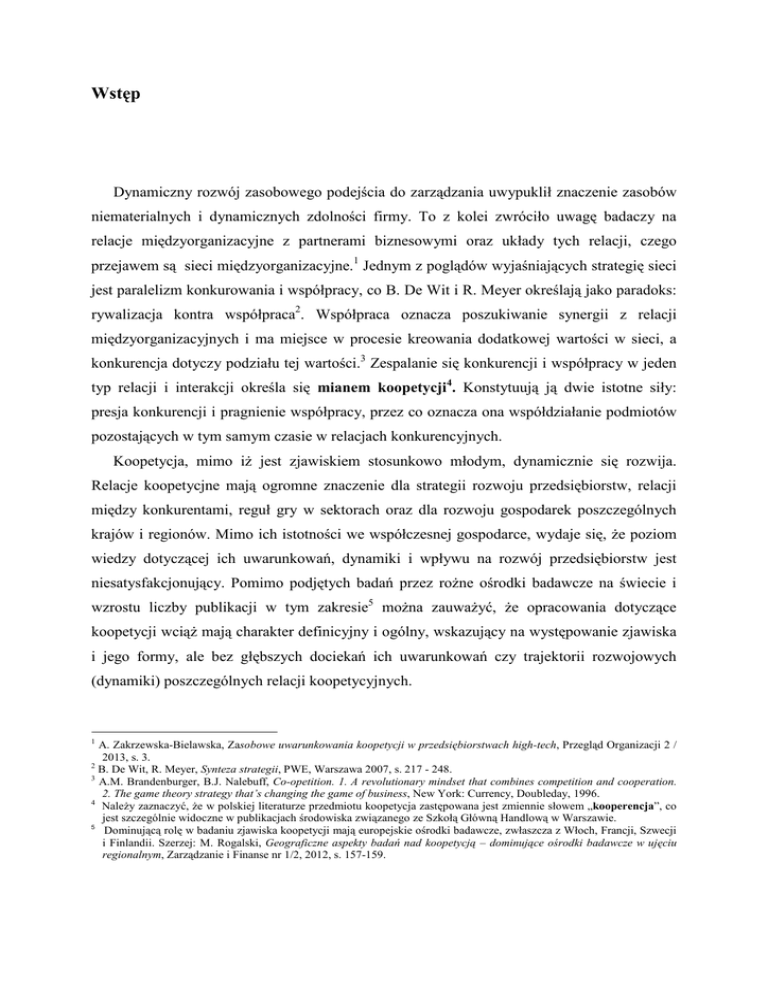 Wstęp Dynamiczny rozwój zasobowego podejścia do zarządzania uwypuklił znaczenie zasobów niematerialnych i dynamicznych zdolności firmy. To z kolei zwróciło uwagę badaczy na relacje międzyorganizacyjne z partnerami biznesowymi oraz układy tych relacji, czego przejawem są sieci międzyorganizacyjne.1 Jednym z poglądów wyjaśniających strategię sieci jest paralelizm konkurowania i współpracy, co B. De Wit i R. Meyer określają jako paradoks: rywalizacja kontra współpraca2. Współpraca oznacza poszukiwanie synergii z relacji międzyorganizacyjnych i ma miejsce w procesie kreowania dodatkowej wartości w sieci, a konkurencja dotyczy podziału tej wartości.3 Zespalanie się konkurencji i współpracy w jeden typ relacji i interakcji określa się mianem koopetycji4. Konstytuują ją dwie istotne siły: presja konkurencji i pragnienie współpracy, przez co oznacza ona współdziałanie podmiotów pozostających w tym samym czasie w relacjach konkurencyjnych. Koopetycja, mimo iż jest zjawiskiem stosunkowo młodym, dynamicznie się rozwija. Relacje koopetycjne mają ogromne znaczenie dla strategii rozwoju przedsiębiorstw, relacji między konkurentami, reguł gry w sektorach oraz dla rozwoju gospodarek poszczególnych krajów i regionów. Mimo ich istotności we współczesnej gospodarce, wydaje się, że poziom wiedzy dotyczącej ich uwarunkowań, dynamiki i wpływu na rozwój przedsiębiorstw jest niesatysfakcjonujący. Pomimo podjętych badań przez rożne ośrodki badawcze na świecie i wzrostu liczby publikacji w tym zakresie5 można zauważyć, że opracowania dotyczące koopetycji wciąż mają charakter definicyjny i ogólny, wskazujący na występowanie zjawiska i jego formy, ale bez głębszych dociekań ich uwarunkowań czy trajektorii rozwojowych (dynamiki) poszczególnych relacji koopetycyjnych. 1 A. Zakrzewska-Bielawska, Zasobowe uwarunkowania koopetycji w przedsiębiorstwach high-tech, Przegląd Organizacji 2 / 2013, s. 3. 2 B. De Wit, R. Meyer, Synteza strategii, PWE, Warszawa 2007, s. 217 - 248. 3 A.M. Brandenburger, B.J. Nalebuff, Co-opetition. 1. A revolutionary mindset that combines competition and cooperation. 2. The game theory strategy that’s changing the game of business, New York: Currency, Doubleday, 1996. 4 Należy zaznaczyć, że w polskiej literaturze przedmiotu koopetycja zastępowana jest zmiennie słowem „kooperencja”, co jest szczególnie widoczne w publikacjach środowiska związanego ze Szkołą Główną Handlową w Warszawie. 5 Dominującą rolę w badaniu zjawiska koopetycji mają europejskie ośrodki badawcze, zwłaszcza z Włoch, Francji, Szwecji i Finlandii. Szerzej: M. Rogalski, Geograficzne aspekty badań nad koopetycją – dominujące ośrodki badawcze w ujęciu regionalnym, Zarządzanie i Finanse nr 1/2, 2012, s. 157-159. Badania nad koopetycją prowadzone były w różnych sektorach gospodarczych.6 Jednak szczególnego znaczenia relacje koopetycyjne nabierają w sektorze wysokich technologii (high-tech), z uwagi na jego heterogeniczność i zaawansowanie technologiczne. Coraz krótszy cykl życia produktów, szybka dyfuzja innowacji technologicznych, wzrastające zapotrzebowanie na wykwalifikowany personel, wysoka specjalizacja zasobów, a także duże koszty prac badawczo-rozwojowych zmuszają tego typu przedsiębiorstwa do współpracy międzyorganizacyjnej, w tym również do tworzenia relacji koopetycjnych. Koopetycja może przyczynić się do rozwoju firm high-tech i być źródłem ich sukcesu, ale z drugiej strony niesie ona ze sobą pewne niebezpieczeństwa, a niewłaściwe ukształtowane relacje współpracy z konkurentami mogą zahamować rozwój firmy, bądź znacznie go ograniczyć. Powstaje więc pytanie: Jak koopetycja wpływa na rozwój przedsiębiorstw wysokich technologii? i odwrotnie, Jak faza rozwoju przedsiębiorstwa high-tech wpływa na typ relacji koopeteycyjnych? Poszukiwanie na nie odpowiedzi uczyniono celem niniejszej monografii. Wynikiem prowadzonych badań jest fazowy model kształtowania skutecznych relacji koopetycyjnych, by przedsiebiortsw high-tech mogły się dalej rozwijać i wzrastać. Opracowanie ma charakter teoretyczno-empiryczny i składa się z ośmiu rozdziałów. W rozdziale pierwszym przybliżono specyfikę firm sektora wysokich technologii, koncentrując się na jego cechach ilościowych i jakościowych. Podjęto także problem rozwoju przedsiębiorstwa, wyjaśniając jego istotę, formy i etapy w odniesieniu do firm high-tech. Pogłębiając charakterystykę sektora wysokich technologii zaprezentowano tu również jego stan, strukturę i tendencje rozwojowe w Polsce w oparciu o uzyskane dane statystyczne. Rozdział drugi poświęcono zjawisku koopetycji. Wyjaśniono tu pojęcie koopetycji, jej podłoże teoretyczne oraz wskazano na jej charakterystyczne cechy, odróżniające ją od innych relacji współpracy międzyorganizacyjnej. Na tym tle omówiono wybrane typologie relacji koopetycyjnych, wskazując jednocześnie na motywy ich podjęcia i uzyskiwane efekty. W rozdziale trzecim przedstawiono metodykę badań empirycznych, wskazując na cele i zakres prowadzonych badań oraz wykorzystane metody, techniki i narzędzia badawcze. Zawarto w nim również charakterystykę firm high-tech stanowiących podmiot badań w badaniach ilościowych, których wyniki prezentowane są w dalszych częściach opracowania. 6 Największą eksploracją charakteryzuje się sektor usług, zwłaszcza z podsektorów informacji i komunikacji oraz opieki zdrowotnej i pomocy społecznej, a także przetwórstwo przemysłowe. Szerzej: M. Rogalski, Strategia koopetycji- światowe trendy eksploracji, Przegląd Organizacji 9 /2011, s. 19. W rozdziale czwartym omówiono determinanty koopetycji, dzieląc je na uwarunkowania zewnętrzne i wewnętrzne. Pierwsze odniesiono do uwarunkowań prowadzenia działalności badawczo-rozwojowej, globalnych powiązań gospodarczych w ujęciu handlowym i finansowym, techn