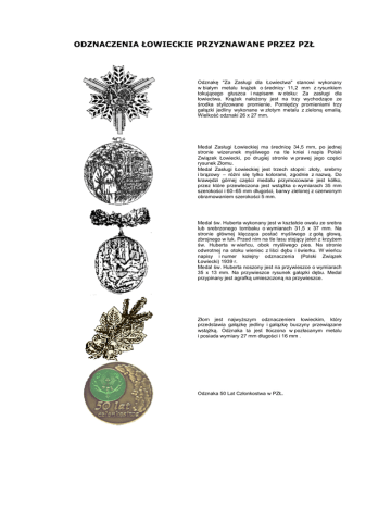 ODZNACZENIA ŁOWIECKIE PRZYZNAWANE PRZEZ PZŁ Odznakę "Za Zasługi dla Łowiectwa" stanowi wykonany w białym metalu krążek o średnicy 11,2 mm z rysunkiem tokującego głuszca i napisem w otoku: Za zasługi dla łowiectwa. Krążek nałożony jest na trzy wychodzące ze środka stylizowane promienie. Pomiędzy promieniami trzy gałązki jedliny wykonane w złotym metalu z zieloną emalią. Wielkość odznaki 26 x 27 mm. Medal Zasługi Łowieckiej ma średnicę 34,5 mm, po jednej stronie wizerunek myśliwego na tle kniei i napis Polski Związek Łowiecki, po drugiej stronie w prawej jego części rysunek Złomu. Medal Zasługi Łowieckiej jest trzech stopni: złoty, srebrny i brązowy – różni się tylko kolorami, zgodnie z nazwą. Do krawędzi górnej części medalu przymocowane jest kółko, przez które przewleczona jest wstążka o wymiarach 35 mm szerokości i 60–65 mm długości, barwy zielonej z czerwonym obramowaniem szerokości 5 mm. Medal św. Huberta wykonany jest w kształcie owalu ze srebra lub srebrzonego tombaku o wymiarach 31,5 x 37 mm. Na stronie głównej klęcząca postać myśliwego z gołą głową, zbrojnego w łuk. Przed nim na tle lasu stojący jeleń z krzyżem św. Huberta w wieńcu, obok myśliwego pies. Na stronie odwrotnej na otoku wieniec z liści dębu i świerku. W wieńcu napisy i numer kolejny odznaczenia (Polski Związek Łowiecki) 1939 r. Medal św. Huberta noszony jest na przywieszce o wymiarach 35 x 13 mm. Na przywieszce rysunek gałązki dębu. Medal przypinany jest agrafką umieszczoną na przywieszce. Złom jest najwyższym odznaczeniem łowieckim, który przedstawia gałązkę jedliny i gałązkę buczyny przewiązane wstążką. Odznaka ta jest tłoczona w pozłacanym metalu i posiada wymiary 27 mm długości i 16 mm . Odznaka 50 Lat Członkostwa w PZŁ.