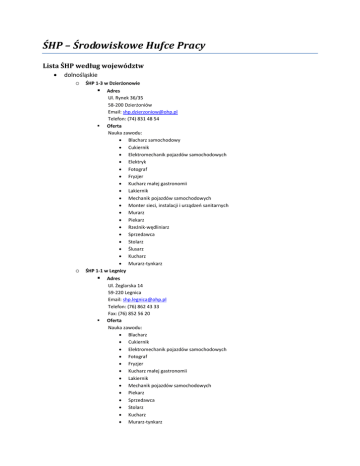 ŚHP – Środowiskowe Hufce Pracy Lista ŚHP według województw dolnośląskie o ŚHP 1-3 w Dzierżonowie Adres o Ul. Rynek 36/35 58-200 Dzierżoniów Email: [email protected] Telefon: (74) 831 48 54 Oferta Nauka zawodu: Blacharz samochodowy Cukiernik Elektromechanik pojazdów samochodowych Elektryk Fotograf Fryzjer Kucharz małej gastronomii Lakiernik Mechanik pojazdów samochodowych Monter sieci, instalacji i urządzeń sanitarnych Murarz Piekarz Rzeźnik-wędliniarz Sprzedawca Stolarz Ślusarz Kucharz Murarz-tynkarz ŚHP 1-1 w Legnicy Adres Ul. Żeglarska 14 59-220 Legnica Email: [email protected] Telefon: (76) 862 43 33 Fax: (76) 852 56 20 Oferta Nauka zawodu: Blacharz Cukiernik Elektromechanik pojazdów samochodowych Fotograf Fryzjer Kucharz małej gastronomii Lakiernik Mechanik pojazdów samochodowych Piekarz Sprzedawca Stolarz Kucharz Murarz-tynkarz o ŚHP 1-2 w Górze Adres o Ul. Piastów 6 56-200 Góra Email: [email protected] Telefon: (65) 544 11 77 Oferta Nauka zawodu: Blacharz samochodowy Elektromechanik Fryzjer Kucharz małej gastronomii Mechanik pojazdów samochodowych Mechanik-operator pojazdów i maszyn rolniczych Monter sieci, instalacji i urządzeń sanitarnych Murarz Piekarz Rzeźnik-wędliniarz Sprzedawca Stolarz Ślusarz Kucharz ŚHP 1-6 w Jeleniej Górze o Adres Ul. Wiejska 29 58-506 Jelenia Góra Email: [email protected] Telefon: (75) 753 42 37 Oferta Przyuczenie do zawodu: Blacharz samochodowy Cukiernik Elektromechanik Elektromechanik pojazdów samochodowych Fryzjer Kamieniarz Lakiernik Mechanik pojazdów samochodowych Monter sieci, instalacji i urządzeń sanitarnych Murarz Ogrodnik Piekarz Sprzedawca Stolarz Ślusarz Kucharz Nauka zawodu: Cukiernik Fryzjer Mechanik pojazdów samochodowych Piekarz ŚHP 1-4 w Wołowie Adres o Ul. Kościuszki 27 56-100 Wołów Email: [email protected] Telefon: (71) 389 42 66 Telefon: 534 617 771 Oferta Przyuczenie do zawodu: Betoniarz-zbrojarz Sprzedawca Stolarz Ślusarz Kucharz Nauka zawodu: Elektryk Fryzjer Kucharz małej gastronomii Mechanik pojazdów samochodowych Piekarz Sprzedawca Stolarz Ślusarz ŚHP 1-5 w Środzie Śląskiej Adres Ul. Ogrody Zamkowe 5 55-300 Środa Śląska Email: [email protected] Telefon: (71) 317 62 75 Oferta Przyuczenie do zawodu: Blacharz samochodowy Cieśla Cukiernik Fryzjer Kucharz małej gastronomii Mechanik pojazdów samochodowych Mechanik-operator pojazdów i maszyn rolniczych Murarz Piekarz Sprzedawca Ślusarz Kucharz Nauka zawodu: Blacharz samochodowy Cukiernik Elektromechanik Fryzjer Kucharz małej gastronomii Mechanik pojazdów samochodowych Monter sieci, instalacji i urządzeń sanitarnych Murarz Sprzedawca Stolarz Ślusarz kujawsko-pomorskie o ŚHP 2-4 w Toruniu Adres o Ul. Poznańska 11/13 87-100 Toruń Email: [email protected] Telefon: 56 654-70-68 wew.49, 28, Telefon: 56 654-70-69 wew. 49, 28 Fax: 56 652-96-19 Oferta Przyuczenie do zawodu: Blacharz Cieśla Cukiernik Elektromechanik Fryzjer Kucharz małej gastronomii Lakiernik Malarz-tapeciarz Mechanik pojazdów samochodowych Murarz Piekarz Sprzedawca Stolarz Ślusarz Kucharz Monter zabudowy i robót wykończeniowych w budownictwie Nauka zawodu: Blacharz Fryzjer Kucharz małej gastronomii Lakiernik Malarz-tapeciarz Mechanik pojazdów samochodowych Sprzedawca Ślusarz Kucharz Murarz-tynkarz Technolog robót wykończeniowych w budownictwie Monter zabudowy robót wykończeniowych w budownictwie ŚHP 2-1 w Brodnicy Adres Ul. Przykop 57/2 87-300 Brodnica Email: [email protected] Telefon: 56/494-01-63 Fax: 56/494-01-63 Oferta Przyuczenie do zawodu: Cukiernik Elektryk Fryzjer Kucharz małej gastronomii o Mechanik pojazdów samochodowych Mechanik-operator pojazdów i maszyn rolniczych Monter sieci, instalacji i urządzeń sanitarnych Murarz Piekarz Sprzedawca Stolarz Ślusarz Tapicer Kucharz Murarz-tynkarz Nauka zawodu: Cukiernik Elektryk Fryzjer Mechanik pojazdów samochodowych Mechanik-operator pojazdów i maszyn rolniczych Monter sieci, instalacji i urządzeń sanitarnych Sprzedawca Stolarz Kucharz Technolog robót wykończeniowych w budownictwie ŚHP 2-5 we Włocławku o Adres Ul. Promienna 5b/4 87-800 Włocławek Email: [email protected] Telefon: 54/231-45-42 Fax: 54/231-45-42 Oferta Przyuczenie do zawodu: Betoniarz-zbrojarz Cukiernik Elektromechanik pojazdów samochodowych Fryzjer Mechanik pojazdów samochodowych Piekarz Sprzedawca Ślusarz Kucharz Murarz-tynkarz Nauka zawodu: Mechanik pojazdów samochodowych Sprzedawca Ślusarz Kucharz Murarz-tynkarz ŚHP 2-2 w Bydgoszczy Adres Ul. Glinki 140 85-861 Bydgoszcz Email: [email protected] Telefon: 52/ 345-05-33 o Telefon: 52/ 363-04-64 Fax: 52/ 345-05-3354 Oferta Przyuczenie do zawodu: Blacharz samochodowy Cukiernik Elektromechanik Elektryk Fryzjer Kucharz małej gastronomii Lakiernik Malarz-tapeciarz Mechanik pojazdów samochodowych Monter sieci, instalacji i urządzeń sanitarnych Operator urządzeń przemysłu szklarskiego Piekarz Sprzedawca Stolarz Szwacz Ślusarz Tapicer Zdun Murarz-tynkarz Nauka zawodu: Betoniarz-zbrojarz Blacharz samochodowy Cukiernik Dekarz Elektromechanik Elektryk Fryzjer Kucharz małej gastronomii Lakiernik Mechanik pojazdów samochodowych Monter sieci, instalacji i urządzeń sanitarnych Monter sieci komunalnych Murarz Piekarz Sprzedawca Stolarz Ślusarz Kucharz Murarz-tynkarz Technolog robót wykończeniowych w budownictwie Monter zabudowy robót wykończeniowych w budownictwie ŚHP 2-3 w Inowrocławiu Adres Ul. Solankowa 23 88-100 Inowrocław Email: [email protected] Telefon: 52/ 355-28-63 Fax: 52/ 355-28-63 Oferta Przyuczenie do zawodu: Blacharz samochodowy Cukiernik Elektromechanik Elektryk Fryzjer Introligator Kucharz małej gastronomii Lakiernik Mechanik pojazdów samochodowych Mechanik-operator pojazdów i maszyn rolniczych Monter sieci, instalacji i urządzeń sanitarnych Murarz Piekarz Sprzedawca Stolarz Ślusarz Tapicer Kucharz Murarz-tynkarz Nauka zawodu: Betoniarz-zbrojarz Cukiernik Elektromechanik Elektryk Fryzjer Kucharz małej gastronomii Mechanik po
