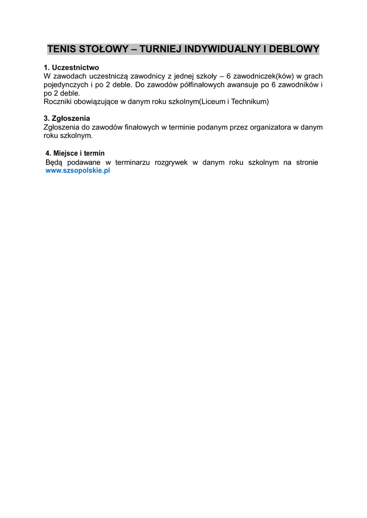 TENIS STOŁOWY – TURNIEJ INDYWIDUALNY I DEBLOWY 1. Uczestnictwo W zawodach uczestniczą zawodnicy z jednej szkoły – 6 zawodniczek(ków) w grach pojedynczych i po 2 deble. Do zawodów półfinałowych awansuje po 6 zawodników i po 2 deble. Roczniki obowiązujące w danym roku szkolnym(Liceum i Technikum) 3. Zgłoszenia Zgłoszenia do zawodów finałowych w terminie podanym przez organizatora w danym roku szkolnym. 4. Miejsce i termin Będą podawane w terminarzu rozgrywek w danym roku szkolnym na stronie www.szsopolskie.pl