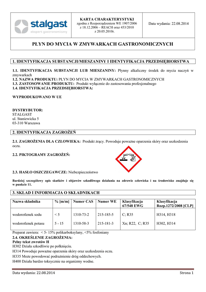 KARTA CHARAKTERYSTYKI zgodna z Rozporządzeniem WE 1907/2006 z 18.12.2006 – REACH oraz 453/2010 z 20.05.2010r. Data wydania: 22.08.2014 PŁYN DO MYCIA W ZMYWARKACH GASTRONOMICZNYCH 1. IDENTYFIKACJA SUBSTANCJI/MIESZANINY I IDENTYFIKACJA PRZEDSIĘBIORSTWA 1.1. IDENTYFIKACJA SUBSTANCJI LUB MIESZANINY: Płynny alkaliczny środek do mycia naczyń w zmywarkach 1.2. NAZWA PRODUKTU: PŁYN DO MYCIA W ZMYWARKACH GASTRONOMICZNYCH 1.3. ZASTOSOWANIE PRODUKTU: Produkt wyłącznie do zastosowania profesjonalnego 1.4. IDENTYFIKACJA PRZEDSIĘBIORSTWA: WYPRODUKOWANO W UE DYSTRYBUTOR: STALGAST ul. Staniewicka 5 03-310 Warszawa 2. IDENTYFIKACJA ZAGROŻEŃ 2.1. ZAGROŻENIA DLA CZŁOWIEKA: Produkt żrący. Powoduje poważne oparzenia skóry oraz uszkodzenia oczu. 2.2. PIKTOGRAMY ZAGROŻEŃ: 2.3. HASŁO OSZCZEGAWCZE: Niebezpieczeństwo Bardziej szczegółowy opis skutków i objawów szkodliwego działania na zdrowie człowieka i na środowisko znajduje się w punkcie 11. 3. SKŁAD I INFORMACJA O SKŁADNIKACH Nazwa składnika % [m/m] Numer CAS Numer WE Klasyfikacja 67/548 EWG Klasyfikacja Rozp.1272/2008 [CLP] wodorotlenek sodu <5 1310-73-2 215-185-5 C; R35 H314, H318 wodorotlenek potasu 5 - 15 1310-58-3 215-181-3 Xn; R22, C; R35 H302, H314 Preparat zawiera: < 5- 15% polikarboksylany, <5% fosfoniany 2.4. OKREŚLENIE ZAGROŻENIA: Pełny tekst zwrotów H H302 Działa szkodliwie po połknięciu. H314 Powoduje poważne oparzenia skóry oraz uszkodzenia oczu. H335 Może powodować podrażnienie dróg oddechowych. H400 Działa bardzo toksycznie na organizmy wodne. Data wydania: 22.08.2014 Strona 1 KARTA CHARAKTERYSTYKI PŁYN DO MYCIA W ZMYWARKACH GASTRONOMICZNYCH 2.5. WARUNKI BEZPIECZNEGO STOSOWANIA: Pełny tekst zwrotów P: P102 - Chronić przed dziećmi. P280 - Stosować rękawice ochronne/odzież ochronną/ochronę oczu/ochronę twarzy, P301+P330+P331 – W PRZYPADKU POŁKNIĘCIA: wypłukać usta. NIE wywoływać wymiotów, P303+P361+P353- W PRZYPADKU KONTAKTU ZE SKÓRĄ (lub włosami): Natychmiast zdjąć całą zanieczyszczoną odzież. Spłukać skórę pod strumieniem wody/prysznicem, P304+P340- W PRZYPADKU DOSTANIA SIĘ DO DRÓG ODDECHOWYCH: wyprowadzić lub wynieść poszkodowanego na świeże powietrze i zapewnić mu warunki do swobodnego oddychania, P308 + P313 – W przypadku narażenia lub styczności: Zasięgnąć porady lekarza. P310- Natychmiast skontaktować się z OŚRODKIEM ZATRUĆ/ lekarzem, P305+P351+P338- W PRZYPADKU DOSTANIA SIĘ DO OCZU: Ostrożnie płukać wodą przez kilka minut. Wyjąć soczewki kontaktowe, jeżeli są i można je łatwo usunąć. Nadal płukać, P361 – Natychmiast zdjąć całą zanieczyszczoną odzież, P405- Przechowywać pod zamknięciem. 4. ŚRODKI PIERWSZEJ POMOCY 4.1. ZALECENIA OGÓLNE: Przerwać kontakt. Pokazać lekarzowi kartę charakterystyki lub etykietę produktu. 4.2. WDYCHANIE: Wyprowadzić/wynieść narażoną osobę na powietrze. Zapewnić spokój i bezruch (groźba obrzęku płuc). W razie potrzeby podawać tlen, w przypadku zatrzymania oddychania przeprowadzić sztuczne oddychanie. Bezzwłocznie zasięgnąć opinii lekarza. 4.3. KONTAKT Z SKÓRĄ: Spłukać zanieczyszczoną skórę dużą ilością wody. Bezzwłocznie zdjąć zanieczyszczoną odzież i obuwie. Przed ściągnięciem ubrania należy ubrać rękawice i spłukać je wodą. Kontynuować płukanie przez co najmniej 10 minut. Następnie założyć jałowy opatrunek i zasięgnąć porady lekarskiej. 4.4. KONTAKT Z OCZAMI: Zanieczyszczone oczy natychmiast płukać wodą, odchylając górną o dolną powiekę, przez co najmniej 15 minut. Natychmiast zapewnić pomoc lekarską. 4.5. POŁKNIĘCIE: Bezzwłocznie przepłukać jamę ustną wodą. Nie powodować wymiotów, jeśli nie jest to zalecane przez personel medyczny. Podać do wypicia dużą ilość wody lub mleka, najlepiej z dodatkiem białka jaja kurzego. 4.6. WSKAZÓWKI DLA LEKARZA: Leczenie właściwe dla zatruć produktami silnie żrącym, alkalicznymi. 5. POSTĘPOWANIE W PRZYPADKU POŻARU 5.1. ŚRODKI GAŚNICZE - ODPOWIEDNIE: Stosować zraszanie wodą (mgłą), użyć piany lub suchych środków chemicznych. 5.2. ŚRODKI GAŚNICZE - NIEODPOWIEDNIE: Nie znane. 5.3. ŚRODKI OCHRONY INDYWIDUALNEJ STRAŻAKÓW: Stosować aparaty oddechowe z niezależnym dopływem powietrza oraz pełne ubranie ochronne. 5.4. DODATKOWE INFORMACJE: Postępować zgodnie z procedurami obowiązującymi przy gaszeniu pożarów chemikaliów. Nie dopuścić do przedostania się ścieków po gaszeniu pożarów do kanalizacji i wód. 6. POSTĘPOWANIE W PRZYPADKU NIEZAMIERZONEGO UWOLNIENIA DO ŚRODOWISKA 6.1. INDYWIDUALNE ŚRODKI OSTROŻNOŚCI: Nie zezwalać na wejście bez potrzeby, nie zabezpieczonemu personelowi. Nie dotykać, ani nie przechodzić po rozlanym preparacie. Unikać wdychania par. W przypadku uwolnienia w pomieszczeniu zapewnić odpowiednią wentylację. 6.2. ŚRODKU OCHRONY W ZAKRESIE ŚRODOWISKA: W przypadku rozlania, zatrzymać wyciek. Zapobiec rozprzestrzenianiu się oraz przedostaniu się jej do kanalizacji, rowów, wód powierzchniowych i gruntowych oraz gleby. 6.3. METODY OCZYSZCZANIA/USUWANIA: Jeśli rozlania jest małe rozcieńczyć je wodą i zebrać ścierką lub zaabsorbować innym chłonnym materiałem, a następnie umieścić w właściwym pojemniku na odpady. Natomiast jeśli Data wydania: 22.08.2014 Strona 2 KARTA CHARAKTERYSTYKI PŁYN DO MYCIA W ZMYWARKACH GASTRONOMICZNYCH rozlanie jest duże, to uwolnioną ciecz należy posypać substancją chłonną (piasek, ziemia, wermikulit, ziemia okrzemkowa). Kolejno umieszczając je w pojemnikach do utylizacji, zgodnie z przepisami (patrz sekcja 13). Patrz także sekcja 8. zawiera informacje na temat środków ochronny indywidualnej oraz sekcja 13. sposoby postępowania z odpadami. 7. POSTĘPOWANIE Z SUBSTANCJĄ/MIESZANINĄ I JEJ MAGAZYNOWANIE Podczas stosowania i przechowywania produktu należy przestrzegać przepisy bezpieczeństwa i higieny pracy (patrz sekcja 15). Stosować zgodnie z przeznacz