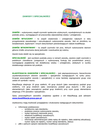 ZAWODY I SPECJALNOŚCI ZAWÓD – wykonywany zespół czynności społecznie użytecznych, wyodrębnionych na skutek podziału pracy, wymagających od pracownika odpowiedniej wiedzy i umiejętności. ZAWÓD WYUCZONY – to zespół wiadomości i umiejętności nabytych w toku przygotowania zawodowego i warunkujących wykonywanie zawodu. Jest on określony na świadectwach, dyplomach i innych dokumentach potwierdzających nabyte kwalifikacje. ZAWÓD WYKONYWANY – to zespół czynności lub prac, których wykonywanie stanowi główne źródło utrzymania danej jednostki i ewentualnie jej rodziny. Zawód może dzielić się na specjalności. SPECJALNOŚĆ- jest wynikiem podziału pracy w ramach zawodu, zawiera część czynności o podobnym charakterze (związanych z wykonywaną funkcją lub przedmiotem pracy), wymagającej pogłębionej lub dodatkowej wiedzy i umiejętności, zdobytych w wyniku dodatkowego szkolenia lub praktyki. KLASYFIKACJA ZAWODÓW I SPECJALNOŚCI – jest pięciopoziomowym, hierarchicznie usystematyzowanym zbiorem zawodów i specjalności występujących na rynku pracy. Grupuje poszczególne zawody ( specjalności) w coraz bardziej zagregowane grupy oraz ustala ich symbole i nazwy. Klasyfikacja obejmuje 10 grup wielkich, 43 grup dużych (jako wewnętrzny podział grup wielkich), 116 grup średnich (jako wewnętrzny podział grup dużych) i 392 grup elementarnych (jako wewnętrzny podział grup średnich) przy czym grupy elementarne obejmują 1770 zawodów i specjalności. Opisy poszczególnych zawodów znajdziesz zgodnie z ich Klasyfikacją pod adresem www.kwalifikacje.praca.gov.pl Użytkownicy mają możliwość przeglądania i drukowania następujących dokumentów:   Informacje podstawowe: o syntetyczny opis standardu; o podstawy prawne wykonywania zawodu; o wykaz typowych stanowisk pracy; o składowe kwalifikacji zawodowych; o wykaz zadań zawodowych; o informacje administracyjne (data wpisu do rejestru, data ostatniej aktualizacji, numer wpisu do rejestru, numer wersji standardu, status) pliki z pełnymi opisami standardów kwalifikacji zawodowych  słownika pojęć związanych ze standardami kwalifikacji zawodowych Adresy instytucji w których znajdziesz materiały dotyczące zawodów i uzyskasz specjalistyczną pomoc: Wojewódzki Urząd Pracy Centrum Informacji i Planowania Kariery Zawodowej ul. Lisa Kuli 20 35-025 Rzeszów Centrala: (17) 850 92 00 e-mail: [email protected]; [email protected] http://www.wup-rzeszow.pl Ochotnicze Hufce Pracy Al. Piłsudskiego 31 35 - 074 Rzeszów tel: /17/ 852 39 10 http://www.podkarpacka.ohp.pl/ Biuro Karier WSIiZ ul. Sucharskiego 2, 35-225 Rzeszów, tel. (017) 866 11 55 e-mail: [email protected] http://www.bk.wsiz.rzeszow.pl/ Biuro Karier Uniwersytet Rzeszowski Al. Rejtana 16c, 35-959 Rzeszów tel/fax. 017 872 10 92 tel. 017 872 10 27 e-mail: [email protected] http://kariera.univ.rzeszow.pl/