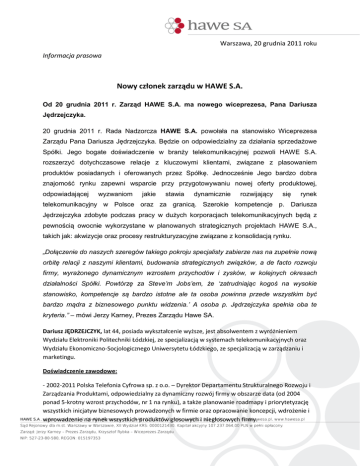 Warszawa, 20 grudnia 2011 roku Informacja prasowa Nowy członek zarządu w HAWE S.A. Od 20 grudnia 2011 r. Zarząd HAWE S.A. ma nowego wiceprezesa, Pana Dariusza Jędrzejczyka. 20 grudnia 2011 r. Rada Nadzorcza HAWE S.A. powołała na stanowisko Wiceprezesa Zarządu Pana Dariusza Jędrzejczyka. Będzie on odpowiedzialny za działania sprzedażowe Spółki. Jego bogate doświadczenie w branży telekomunikacyjnej pozwoli HAWE S.A. rozszerzyć dotychczasowe relacje z kluczowymi klientami, związane z plasowaniem produktów posiadanych i oferowanych przez Spółkę. Jednocześnie Jego bardzo dobra znajomość rynku zapewni wsparcie przy przygotowywaniu nowej oferty produktowej, odpowiadającej wyzwaniom jakie stawia dynamicznie rozwijający się rynek telekomunikacyjny w Polsce oraz za granicą. Szerokie kompetencje p. Dariusza Jędrzejczyka zdobyte podczas pracy w dużych korporacjach telekomunikacyjnych będą z pewnością owocnie wykorzystane w planowanych strategicznych projektach HAWE S.A., takich jak: akwizycje oraz procesy restrukturyzacyjne związane z konsolidacją rynku. „Dołączenie do naszych szeregów takiego pokroju specjalisty zabierze nas na zupełnie nową orbitę relacji z naszymi klientami, budowania strategicznych związków, a de facto rozwoju firmy, wyrażonego dynamicznym wzrostem przychodów i zysków, w kolejnych okresach działalności Spółki. Powtórzę za Steve’m Jobs’em, że ‘zatrudniając kogoś na wysokie stanowisko, kompetencje są bardzo istotne ale ta osoba powinna przede wszystkim być bardzo mądra z biznesowego punktu widzenia.’ A osoba p. Jędrzejczyka spełnia oba te kryteria.” – mówi Jerzy Karney, Prezes Zarządu Hawe SA. Dariusz JĘDRZEJCZYK, lat 44, posiada wykształcenie wyższe, jest absolwentem z wyróżnieniem Wydziału Elektroniki Politechniki Łódzkiej, ze specjalizacją w systemach telekomunikacyjnych oraz Wydziału Ekonomiczno-Socjologicznego Uniwersytetu Łódzkiego, ze specjalizacją w zarządzaniu i marketingu. Doświadczenie zawodowe: - 2002-2011 Polska Telefonia Cyfrowa sp. z o.o. – Dyrektor Departamentu Strukturalnego Rozwoju i Zarządzania Produktami, odpowiedzialny za dynamiczny rozwój firmy w obszarze data (od 2004 ponad 5-krotny wzrost przychodów, nr 1 na rynku), a także planowanie roadmapy i priorytetyzację wszystkich inicjatyw biznesowych prowadzonych w firmie oraz opracowanie koncepcji, wdrożenie i wprowadzenie na rynek wszystkich produktów głosowych i niegłosowych firmy. - 2000-2002 ce-market.com S.A – Członek Zarządu, Dyrektor Operacyjny, odpowiedzialny za rozwój oferty i kierowanie bieżącą działalnością firmy, wspólnego przedsięwzięcia grup kapitałowych Impexmetal i Prokom, pierwszej internetowej platformy handlu metalami w Europie Centralnej. - 1994-2000 Andersen Consulting sp. z o.o. – Menedżer w Dziale Doradztwa Strategicznego, kierował licznymi projektami związanymi z przygotowaniem strategii dla firm oraz reinżynierią procesów biznesowych dla wiodących operatorów telekomunikacyjnych w Europie oraz USA. - 1992-1994 SPIN sp. z o.o. – Menedżer Projektów, odpowiedzialny za sprzedaż i zarządzanie sieciami komputerowymi i projektami teleinformatycznymi. HAWE S.A. to spółka publiczna, notowana na Giełdzie Papierów Wartościowych w Warszawie. Jej działalność operacyjna prowadzona jest przez spółki zależne, HAWE Telekom Sp. z o.o. i HAWE Budownictwo Sp. z o.o.. Grupa świadczy usługi operatorskie w oparciu o własną infrastrukturę światłowodową. Dysponuje jedną z wiodących sieci w kraju. Wykonuje usługi projektowe i budowlane dla branży telekomunikacyjnej, elektroenergetycznej oraz samorządów terytorialnych. Spółka zdobyła tytuł Spółki Wysokiej Reputacji 2010 w badaniu reputacji spółek giełdowych PremiumBrand. Do dnia 20 grudnia 2011 r. zarząd HAWE SA składał się z Prezesa Zarządu Jerzego Karney oraz wiceprezesa Krzysztofa Rybki. Więcej informacji: Joanna Latoszek [email protected] tel. kom.: 501 04 05 23
