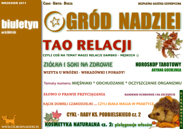 WRZESIEŃ 2011 biuletyn nr 3/2011 (3) CIAŁO - UMYSŁ - DUSZA BEZPŁATNA GAZETKA EZOTERYCZNA OGRÓD NADZIEI TAO RELACJI CZYLI COŚ NA TEMAT MAGII RELACJI DAMSKO - MĘSKICH :) HOROSKOP TAROTOWY ZIÓŁKA I SOKI NA ZDROWIE WIZYTA U WRÓŻKI - WSKAZÓWKI I PORADY! ARYANA GOEHLINGA Tematy numeru: MIĘŚNIAKI * ODCHUDZANIE * OCZYSZCZANIE ORGANIZMU SŁOWO O PRAWIE PRZYCIĄGANIA KAMIENIE OCHRONNE i NA SZCZĘŚCIE KĄCIK DOBREJ CZARODZIEJKI ... CZYLI BIAŁA MAGIA W PRAKTYCE CYKL - RADY KS. PODBIELSKIEGO cz. 2 WWW.OGRODNADZIEI.PL KOSMETYKA NATURALNA cz. 2: pielęgnacja włosów C I E K A W O S T K I od redakcji: Złota myśl: “ Zdrowie jest wszystkim, ale wszystko bez zdrowia jest niczym...” Witam serdecznie... Tym razem spotykamy się w jakże pięknej, jesiennej oprawie... Wszystko wokół nas nabiera pięknych barw, złoci się wszelkimi kolorami... Dlatego uwielbiam jesień, ponieważ jest kolorowa i zarazem magiczna... Z jednej strony wszystko oczyszcza się i “zasypia”... z drugiej strony, nasze oczy mogą pieścić się widokiem ferii barw i ostatnimi promykami przebłyskującego słońca... :) Lato jest za nami, nastał czas o wiele spokojniejszy niż letnie miesiące... niektórzy z Państwa zapewne odczują to na swoim ciele jak i na samopoczuciu psychicznym... Pamiętajcie jednak, że nasze nastawienie, jest bardzo ważne... Tak naprawdę to MY sami jesteśmy kreatorami naszego życia... i większość sytuacji, które spotykają nas w życiu - są odzwierciedleniem naszych myśli... Odsyłam Państwa do artykułu - “Słowo o prawie przyciągania”, na pewno każdy z Państwa znajdzie tam inspirującą wskazówkę, jak przetrwać trudniejsze momenty... Nasz jesienny - wrześniowy numer nieznacznie się opóźnił, jednak mamy nadzieję, że lektura i ciekawostki zamieszczone w nim pozwolą umilić Państwu jesienne wieczory... Tym razem przedstawiamy ciekawe felietony... skończyło się lat... zapewne wiele związków się scaliło, ale na pewno wiele przestało istnieć... dlatego polecam felieton Joasi Nowak pt.:“Tao relacji”. Poza tym prezentujemy szereg jesiennych kuracji, ziołowych specyfików i soków wspomagających zdrowie jak również odchudzanie... Jak co miesiąc zachęcamy do dzielenia się z nami opinią o naszym BIULETYNIE... Chcemy prezentować tematy i ciekawostki, które będą dla Państwa inspiracją, wsparciem jak i pomocą... Dlatego Państwa sugestie są mile widziane... Mamy przyjemność towarzyszyć Państwu już po raz trzeci - jest to moja ulubiona liczba - mam nadzieję, że okaże się dla nas szczęśliwa... :) Wanda Leonarda Prager redaktor naczelna Nasz biuletyn redagują: Wanda Leonarda Prager - redaktor Joanna Sylwia Nowak wróżka - wizjonerka, parapsycholog trener magii relacji, bioenergoterapeutka, doradca duchowy Jej pragnieniem jest nieść pomoc, wsparcie i ukojenie... dlatego powołała do życia gdyński “Ogród Nadziei”, gdzie z pomocą innych terapeutów, wróżek i doradców z dziedzin ezoteryki od ponad 15 lat niosą radę, pomoc i ukojenie potrzebującym. Sama rzadko zajmuje się wróżeniem, organizacja ośrodka pochłania ją bez reszty, a jak wiadomo, aby pomagać ludziom trzeba być skupionym, wyciszonym i nie żyć w biegu... Biuletyn jest jej nowym “dzieckiem”, które ma na celu propagowanie zdrowego jak i duchowego spojrzenia na życie... Z różnych dziedzin parapsychologii i ezoteryki wybrała magię i magię relacji. Trenerka i specjalistka magii relacji i magii kobiecej. Propagatorka aktywnej zmiany stylu życia w drodze do szczęścia. Jest bioenergoterapeutką, po inicjacjach Reiki Usui, ale łączy wiele innych technik magii i kreacji w swojej pracy zawodowej. Na łamach naszego biuletynu będzie pisała o jakże czasami skomplikowanych relacjach damsko - męskich. Aryan Goehling - redaktor, koordynator Małgorzata Gołębiowska - Sobota doradca: wróżbita, jasnowidz , ezoteryk... bioenergoterapeutka, masażystka, zielarz Zdolności jasnowidzenia ma od urodzenia, pomaga ludziom odnaleźć swoją drogę życiową już od ponad 15 lat za pomocą swoich zdolności kart. Oprócz pomagania innym uczy innych jak zrozumieć siebie, swoje problemy i jak wykorzystać swoje zdolności do pomagania drugiemu człowiekowi. Posiada szeroką wiedzę z zakresu magii, ezoteryki, parapsychologii i uzdrawiania, którą będzie się dzielić na łamach naszego pisma... Ezoteryką, uzdrawianiem, ziołami i magią interesuje się odkąd pamięta i tak samo długo zgłębia swoją wiedzę na te tematy... Dużym przełomem w jej życiu było zatknięcie się z terapiami ciała m.in terapią czaszkowo - krzyżową, masażem, następnie ziołolecznictwem i bioenergoterapią... łączy te dziedziny w swojej praktyce terapeutycznej, bo wzajemnie się uzupełniają i wzmacniają efekt terapii. Pragnie pomagać innym jak również dzielić się swoją wiedzą... dlatego dołączyła do naszego grona. Andrzej Gasis Mistrz Bioenergoterapii i Reiki, naturoterapeuta Posiada holistyczne podejście do zdrowia człowieka. W swojej pracy kieruje się zasadą - “Powinniśmy pomagać, nie szkodzić...”. Jest naturoterapeutą i zajmuje się m.in. Reiki Usui, bioenergoterapią, chromoterapią (leczeniem kolorami) i pulsingiem. Wykładowca terapii metodą Reiki, uczy na kursach zawodowej bioenergoterapii jak rozwinąć i pokierować swoją energię i wykorzystywać do pomocy innym. Jest członkiem wielu Stowarzyszeń Naturoterapeutów. Kontakt z redakcją: REDAKCJA: [email protected] DZIAŁ REKLAMY: [email protected] WSPÓŁPRACA: [email protected] SUGESTIE: [email protected] WWW: www.ogrodnadziei.pl Redakcja zastrzega sobie prawo do odmówienia publikacji (bez podania przyczyny) nadsyłanych materiałów, reklam, ogłoszeń... Rozpowszechnianie w formie (drukowanej, kopiowanej, elektronicznej, i innych nośnikach) niniejszego czasopisma, bez zgody redakcji - zabronione. Redakcja nie odpowiada za treść zamieszczanych ogłoszeń i reklam