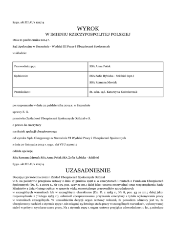 Sygn. akt III AUa 121/14 WYROK W IMIENIU RZECZYPOSPOLITEJ POLSKIEJ Dnia 21 października 2014 r. Sąd Apelacyjny w Szczecinie - Wydział III Pracy i Ubezpieczeń Społecznych w składzie: Przewodniczący: SSA Anna Polak Sędziowie: SSA Zofia Rybicka - Szkibiel (spr.) SSA Romana Mrotek Protokolant: St. sekr. sąd. Katarzyna Kaźmierczak po rozpoznaniu w dniu 21 października 2014 r. w Szczecinie sprawy Z. G. przeciwko Zakładowi Ubezpieczeń Społecznych Oddział w S. o prawo do emerytury na skutek apelacji ubezpieczonego od wyroku Sądu Okręgowego w Szczecinie VI Wydział Pracy i Ubezpieczeń Społecznych z dnia 27 listopada 2013 r. sygn. akt VI U 2370/12 oddala apelację. SSA Romana Mrotek SSA Anna Polak SSA Zofia Rybicka - Szkibiel Sygn. akt III AUa 121/14 UZASADNIENIE Decyzją z 30 kwietnia 2012 r. Zakład Ubezpieczeń Społecznych Oddział w S. na podstawie przepisów ustawy z dnia 17 grudnia 1998 r. o emeryturach i rentach z Funduszu Ubezpieczeń Społecznych (Dz. U. z 2009 r., Nr 153, poz. 1227 ze zm.; dalej jako: ustawa emerytalna) oraz rozporządzenia Rady Ministrów z dnia 7 lutego 1983 r. w sprawie wieku emerytalnego pracowników zatrudnionych w szczególnych warunkach lub w szczególnym charakterze (Dz. U. z 1983 r., Nr 8, poz. 43 ze zm.; dalej jako: rozporządzenie z 7 lutego 1983 r.), odmówił ubezpieczonemu przyznania emerytury z tytułu wykonywania pracy w warunkach szczególnych. W uzasadnieniu decyzji organ rentowy wskazał, że powodem odmowy jest to, że ubezpieczony na dzień 1 stycznia 1999 r. nie osiągnął 15-letniego stażu pracy w szczególnych warunkach, wykonywanej stale i w pełnym wymiarze czasu pracy. Na 1 stycznia 1999 r. organ rentowy przyjął za udowodnione 10 lat, 3 miesiące i 22 dni okresów pracy w szczególnych warunkach. Organ rentowy wskazał, że nie uwzględnił okresu pracy od 18 lipca 1977 r. do 30 września 1982 r. w Państwowym Ośrodku (...) w W., z uwagi na fakt, że ubezpieczony nie przedłożył świadectwa wykonywania pracy w szczególnych warunkach. Ubezpieczony w odwołaniu od powyższej decyzji wniósł o jej zmianę, przyznanie emerytury z tytułu pracy w warunkach szczególnych i zaliczenie do stażu pracy w szczególnych warunkach: - okresu od 10 lutego 1993 r. do 31 grudnia 1995 r. w A. P.; - od 16 marca 1980 r. do 30 września 1982 r. w (...) W.. W ocenie skarżącego, za tym, że ostatni wymieniony okres jest okresem pracy w szczególnych warunkach przemawiają dokumenty, które złożył w ZUS (wskazują na to zakres czynności, opis pracy wydziału oraz produkcji i charakterystyka pracy na tym wydziale). Podniósł, że charakter pracy wskazywał na codzienną obecność przy produkcji na hali produkcyjnej ze spawaczami, tokarzami i malarzami, a także że złożył pismo przedstawiające powody, dlaczego nie wystawiono mu świadectwa wykonywania pracy w szczególnych warunkach za ten okres. Co do pracy w A. P. wskazał, że organ rentowy zaliczył mu okres od 1996 r. do 1999 r., w którym pracował w podobnym charakterze (przy produkcji). Organ rentowy w odpowiedzi na odwołanie wniósł o oddalenie odwołania. Wskazał, że obydwa sporne okresy nie zostały zaliczone z uwagi na brak świadectw wykonywania pracy w szczególnych warunkach. Podtrzymał nadto dotychczasową argumentację. W kolejnym piśmie procesowym ubezpieczony podtrzymał swoje stanowisko i wskazał, że nie jest w stanie zdobyć świadectw pracy w szczególnych warunkach za wymienione okresy, z uwagi na to, że powyższe zakłady pracy już nie istnieją. Wyrokiem z 27 listopada 2013 r. Sąd Okręgowy w Szczecinie VI Wydział Pracy i Ubezpieczeń Społecznych oddalił odwołanie. Sąd I instancji ustalił, że ubezpieczony urodził się (...) Jego łączny staż ubezpieczeniowy (udowodnione okresy składkowe i nieskładkowe) na dzień 1 stycznia 1999 r. wynosił 25 lat, 2 miesiące i 5 dni. Organ rentowy zaliczył ubezpieczonemu do stażu pracy w warunkach szczególnych łączny okres 10 lat, 3 miesiące i 22 dni, obejmujący okresy: od 1 października 1982 r. do 2 maja 1985 r., od 1 lipca 1986 r. do 8 listopada 1991 r. oraz od 20 sierpnia 1996 r. do 31 grudnia 1998 r. Ubezpieczony nie przystąpił do Otwartego Funduszu Emerytalnego. W dniu 31 października 2011 r. uległ rozwiązaniu jego stosunek pracy z (...) spółką z ograniczoną odpowiedzialnością w P.. Od tego czasu nie jest nigdzie zatrudniony na podstawie umowy o pracę. Od 2 listopada 2011 r. jest natomiast zarejestrowany w Powiatowym Urzędzie Pracy w P. jako bezrobotny. Wniosek o emeryturę złożył w organie rentowym 29 marca 2012 r. We wrześniu 1973 r. ubezpieczony ukończył naukę w Technikum (...) w P. o specjalności mechanizacji rolnictwa, uzyskując prawo do używania tytułu technika mechanizacji rolnictwa. Począwszy od 18 lipca 1977 r., był zatrudniony na podstawie umowy o pracę w pełnym wymiarze czasu pracy w Państwowym Ośrodku (...) w W., początkowo do 31 lipca 1977 r. na okres próbny, a od 1 sierpnia 1977 r. na czas nieokreślony. W umowach o pracę z 18 lipca 1977 r. oraz z 1 sierpnia 1977 r. jako stanowisko pracy ubezpieczonego wskazano stanowisko starszego referenta do spraw zbytu w dziale gospodarki materiałowej i zbytu. W toku dalszego zatrudnienia ubezpieczonemu powierzano także stanowiska starszego referenta do spraw zespołów wymiany i regeneracji. W dniu 15 maja 1978 r. został on przeniesiony do działu głównego mechanika oraz powierzono mu stanowisko starszego referenta do spraw technicznych, a od 1 sierpnia 1979 r. stanowisko samodzielnego referenta do spraw technicznych. W okresie od 2 marca 1978 r. do 26 kwietnia 1978 r. ubezpieczony uczestniczył w kursie kierowców wózków akumulatorowych i sztaplarek. Z dniem 16 marca 1980 r. został przeniesiony ze stanowiska samodzielnego referenta do spraw technicznych na stanowisko mistrza w wydziale usług krajalniczych i produkcji. Zgodnie z zakresem czynności przyjętym przez ubezpieczonego do wykonan