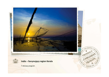 Indie – fascynujący region Kerala 7‐dniowy program Indie Region Kerala Od jednego końca kraju do drugiego, każdy zakątek Indii jest pełen atrakcji, które zostawiają nas w zachwycie na długi czas. To miejsce zaskakuje pięknem i zdumieniem. Kerala, niewielki skrawek lądu w południowo‐zachodnich Indiach, to fascynujący stan ze względu na swoją historię, przyrodę i wspaniałych ludzi, którzy wierzą, że nawet w tak biednym kraju jak Indie można żyć godnie. Nie ważne, czy jesteś miłośnikiem przyrody, znawcą historii, pielgrzymem, entuzjastą kultury, miłośnikiem sztuki czy poszukiwaczem przygód…. Indie mają do zaoferowania wiele dla każdego. Indie są znane od dawna z egzotycznej kultury i tradycji. Dlatego każda podróż do tego kraju staje się niezapomnianym doświadczeniem. Każde z miast i miasteczek ma własny styl i historię, którą nie sposób jest opowiedzieć. Trzeba jej samodzielnie doświadczyć. W całych Indiach nie ma chyba tak fascynującego, a zarazem tak odmiennego stanu, jakim jest Kerala. Ten mały, zaledwie dwudziestomilionowy region, znajduje się na samum południowo – zachodnim krańcu subkontynentu i jest jakby na uboczu turystycznych szlaków tych, którzy decydują się odwiedzić Indie. A szkoda, bo warto go odwiedzić! Kerala znajduje się pod wpływem kultury drawidyjskiej dominującej na południu Indii, jednak jej położenie geograficzne sprawiło, że już w II wieku n. e. dotarło do jej brzegów chrześcijaństwo, a jeszcze wcześniej zaczęli pojawiać się Żydzi. Niedługo po śmierci Proroka Muhammada, przybyli tutaj także muzułmanie. Śladem tych wydarzeń jest etniczny i religijny skład społeczeństw. Indie – fascynujący region Kerala 7‐dniowy program Dzień 1 – lot Spotkanie uczestników wyjazdu na lotnisku w Warszawie Połączenie lotnicze na linii: Warszawa – Frankfurt – Doha ‐ Kochi Dzień 2 – Kochi, (dzień 1 na miejscu) Po wylądowaniu zostaniecie Państwo powitani na lotnisku przez naszego miejscowego opiekuna. Następnie przejedziemy do hotelu w Fort Koichi, gdzie spędzimy dwie najbliższe noce. W trakcie wieczornych rejsów zachęcamy Państwa do podziwiania niezwykłych zachodów słońca, a także widoków chińskich rybackich sieci w blasku tafli tutejszych wód. W pobliżu znajduje się targ rybny, na którym można kupić świeże połowy lub zażyczyć sobie przyrządzenia na miejscu dowolnej ryby lub innych owoców morza w dowolny sposób. Indie – fascynujący region Kerala 7‐dniowy program Dzień 3 – Kochi (dzień 2 na miejscu) Po śniadaniu w hotelu wyruszamy na city tour po Kochi. Najstarsze części Kochi jak i Mattancherry, zachodniej części miasta, to miejsca w których zachowały się portugalskie, holenderskie, a także angielskie wpływy. W planie dnia mamy również odwiedziny m.in. w kościele St. Francis, zbudowanego przez Portugalczyków i uznawanego za najstarszy europejski kościół w Indiach. Kolejnym krokiem będą odwiedziny w Pałacu Mattancherry, gdzie będziemy mogli wspólnie podziwiać zadziwiające malowidła przedstawiające historie z Ramajany, Mahabharatha a także legendy Puranic. Kolejnym przystankiem będzie żydowska synagoga Paradesi, powstała w roku 1586. W godzinach wieczornych będziemy mogli podziwiać występy Kathakali (dramat teatralny w klasycznych tańcach hinduskich) na odrestaurowanej scenie Kerali. Wieczorem powrót do hotelu i nocleg. Dzień 4 – Alappuzha (dzień 3 na miejscu) Dzień 5 – Kochi ‐ Alappuzha – Ourland, (dzień 4 na miejscu) Wczesnym rankiem po śniadaniu przejedziemy do Alappuzha – zwanej wenecją wschodu. W pobliżu miasta znajduje się wiele kanałów (stąd skojarzenie nazw), plaż i lagun. Dziś zapraszamy Państwa na całodzienny rejs. Bezpośrednio z pomostów przy Ourland Resort wejdziemy na pokład łodzi/hotelu – Housboat. Mając przed sobą niezliczone kilometry malowniczych kanałów Alappuzha będziemy mogli obserwować życie tutejszej ludności, zachwycać się przyrodą i jej naturalnym pięknem. Po dotarciu na miejsce zapraszamy do pięknego resortu w stylu Kerala, położonego na wysepce otoczonej przez spokojne wody – Ourland Resort. Jedną z charakterystycznych cech tego miejsca jest to, że zlokalizowane jest w regionie nazywanym Misą Ryżu Kerala(dosłowne tłumaczenie). To także jedno z niewielu miejsc na świecie, gdzie uprawia się rolę poniżej poziomu morza. Strona www resortu. Indie – fascynujący region Kerala 7‐dniowy program Noc zapowiada się równie wyjątkowo co dzień, ponieważ spędzimy ją na pokładzie pływającego hotelu. Dzień 6 – Vagamon i Vanilla Country (dzień 5 na miejscu) Dzień 7 – Vagamon (dzień 6 na miejscu) Po śniadaniu opuszczamy pokład statku i udajemy się drogą lądową do Vagamon. To miejsce odwiedzane przez wielu turystów, otoczone przez wiele tajemniczych dolin. Vagamon usytuowane jest na wysokości 1100 m. To miejsce jest rajem dla amatorów trekkingu. Cały dzisiejszy dzień możecie Państwo przeznaczyć na wybrane atrakcje na miejscu. Możecie udać się w trasę trekkingową, która pozwoli Wam „dotknąć” przyrody obserwując przepiękną faunę i florę. Zapraszamy także na plantację lub obserwację słoni w trakcie pracy. Możemy również odpocząć w trakcie kąpieli przy lokalnych wodospadach. Dzisiejszą noc spędzimy w resorcie Home Stay, znajdującym się na malowniczej plantacji wanilii, pieprzu i kawy. Strona www. Indie – fascynujący region Kerala 7‐dniowy program Dzień 8 – Vagamon (dzień 7 na miejscu) Po śniadaniu check‐out z resortu i w zależności od godziny wylotu wyjazd do Kochi International Airport. Pakiet zawiera: ‐ program zgodny z opisem ‐ noclegi zgodne z opisem ‐ transfery na miejscu jak w opisie programu ‐ przewodnik/opiekun anglojęzyczny ‐ pełne wyżywienie (śniadanie, obiad, kolacja) – jak w opisie programu ‐opłaty wejściowe za atrakcje wymienione w 