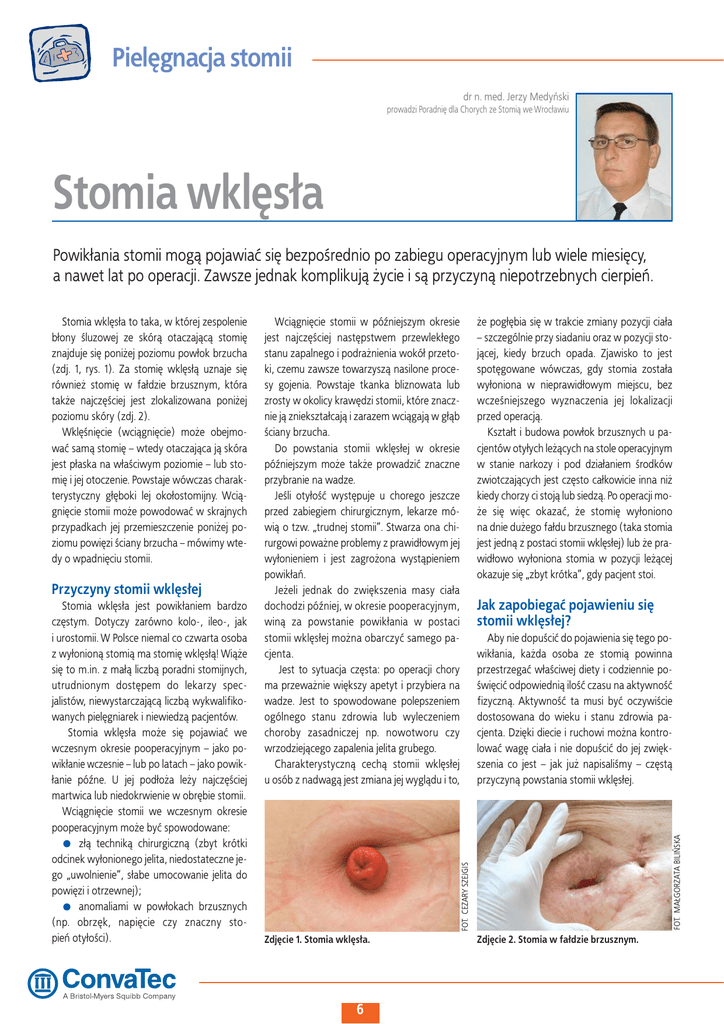 Pielęgnacja stomii dr n. med. Jerzy Medyński prowadzi Poradnię dla Chorych ze Stomią we Wrocławiu Stomia wklęsła Powikłania stomii mogą pojawiać się bezpośrednio po zabiegu operacyjnym lub wiele miesięcy, a nawet lat po operacji. Zawsze jednak komplikują życie i są przyczyną niepotrzebnych cierpień. Stomia wklęsła jest powikłaniem bardzo częstym. Dotyczy zarówno kolo-, ileo-, jak i urostomii. W Polsce niemal co czwarta osoba z wyłonioną stomią ma stomię wklęsłą! Wiąże się to m.in. z małą liczbą poradni stomijnych, utrudnionym dostępem do lekarzy specjalistów, niewystarczającą liczbą wykwalifikowanych pielęgniarek i niewiedzą pacjentów. Stomia wklęsła może się pojawiać we wczesnym okresie pooperacyjnym – jako powikłanie wczesnie – lub po latach – jako powikłanie późne. U jej podłoża leży najczęściej martwica lub niedokrwienie w obrębie stomii. Wciągnięcie stomii we wczesnym okresie pooperacyjnym może być spowodowane: złą techniką chirurgiczną (zbyt krótki odcinek wyłonionego jelita, niedostateczne jego „uwolnienie”, słabe umocowanie jelita do powięzi i otrzewnej); anomaliami w powłokach brzusznych (np. obrzęk, napięcie czy znaczny stopień otyłości). Jak zapobiegać pojawieniu się stomii wklęsłej? Aby nie dopuścić do pojawienia się tego powikłania, każda osoba ze stomią powinna przestrzegać właściwej diety i codziennie poświęcić odpowiednią ilość czasu na aktywność fizyczną. Aktywność ta musi być oczywiście dostosowana do wieku i stanu zdrowia pacjenta. Dzięki diecie i ruchowi można kontrolować wagę ciała i nie dopuścić do jej zwiększenia co jest – jak już napisaliśmy – częstą przyczyną powstania stomii wklęsłej. FOT. MAŁGORZATA BILIŃSKA Przyczyny stomii wklęsłej że pogłębia się w trakcie zmiany pozycji ciała – szczególnie przy siadaniu oraz w pozycji stojącej, kiedy brzuch opada. Zjawisko to jest spotęgowane wówczas, gdy stomia została wyłoniona w nieprawidłowym miejscu, bez wcześniejszego wyznaczenia jej lokalizacji przed operacją. Kształt i budowa powłok brzusznych u pacjentów otyłych leżących na stole operacyjnym w stanie narkozy i pod działaniem środków zwiotczających jest często całkowicie inna niż kiedy chorzy ci stoją lub siedzą. Po operacji może się więc okazać, że stomię wyłoniono na dnie dużego fałdu brzusznego (taka stomia jest jedną z postaci stomii wklęsłej) lub że prawidłowo wyłoniona stomia w pozycji leżącej okazuje się „zbyt krótka”, gdy pacjent stoi. Wciągnięcie stomii w późniejszym okresie jest najczęściej następstwem przewlekłego stanu zapalnego i podrażnienia wokół przetoki, czemu zawsze towarzyszą nasilone procesy gojenia. Powstaje tkanka bliznowata lub zrosty w okolicy krawędzi stomii, które znacznie ją zniekształcają i zarazem wciągają w głąb ściany brzucha. Do powstania stomii wklęsłej w okresie późniejszym może także prowadzić znaczne przybranie na wadze. Jeśli otyłość występuje u chorego jeszcze przed zabiegiem chirurgicznym, lekarze mówią o tzw. „trudnej stomii”. Stwarza ona chirurgowi poważne problemy z prawidłowym jej wyłonieniem i jest zagrożona wystąpieniem powikłań. Jeżeli jednak do zwiększenia masy ciała dochodzi później, w okresie pooperacyjnym, winą za powstanie powikłania w postaci stomii wklęsłej można obarczyć samego pacjenta. Jest to sytuacja częsta: po operacji chory ma przeważnie większy apetyt i przybiera na wadze. Jest to spowodowane polepszeniem ogólnego stanu zdrowia lub wyleczeniem choroby zasadniczej np. nowotworu czy wrzodziejącego zapalenia jelita grubego. Charakterystyczną cechą stomii wklęsłej u osób z nadwagą jest zmiana jej wyglądu i to, FOT. CEZARY SZEJGIS Stomia wklęsła to taka, w której zespolenie błony śluzowej ze skórą otaczającą stomię znajduje się poniżej poziomu powłok brzucha (zdj. 1, rys. 1). Za stomię wklęsłą uznaje się również stomię w fałdzie brzusznym, która także najczęściej jest zlokalizowana poniżej poziomu skóry (zdj. 2). Wklęśnięcie (wciągnięcie) może obejmować samą stomię – wtedy otaczająca ją skóra jest płaska na właściwym poziomie – lub stomię i jej otoczenie. Powstaje wówczas charakterystyczny głęboki lej okołostomijny. Wciągnięcie stomii może powodować w skrajnych przypadkach jej przemieszczenie poniżej poziomu powięzi ściany brzucha – mówimy wtedy o wpadnięciu stomii. Zdjęcie 1. Stomia wklęsła. 6 Zdjęcie 2. Stomia w fałdzie brzusznym. otwór stomii skóra jelito Rys. 1. Schemat stomii wklęsłej. Bardzo istotna jest też stała obserwacja stomii, stosowanie dobrej jakości sprzętu stomijnego oraz bardzo staranna pielęgnacja przy użyciu odpowiednich akcesoriów. Nie wolno też bagatelizować żadnych niepokojących objawów, które mogłyby świadczyć o tym, że ze stomią dzieje się coś złego. Chodzi tu przede wszystkim o objawy przewlekłego zapalenia – ból i zaczerwienienie wokół stomii. W przypadkach wątpliwych zawsze należy szukać porady u lekarza specjalisty bądź pielęgniarki stomijnej. Właściwa pielęgnacja stomii wklęsłej Podstawową sprawą w pielęgnacji stomii wklęsłej jest jej odpowiednie zaopatrzenie. Wszystkie osoby ze stomią wklęsłą powinny używać specjalnych wypukłych płytek typu Convex. Stosowanie płytek płaskich lub sprzętu jednoczęściowego jest niewskazane. Może powodować kłopoty związane z krótkim czasem utrzymywania się sprzętu na skórze i jego nieszczelnością. Konsekwencją tego jest podciekanie treści jelitowej pod płytkę, co bardzo szybko doprowadza do uporczywych niekorzystnych zmian skórnych. Istotą pielęgnacji stomii wklęsłej jest możliwie najdokładniejsze wypełnienie przestrzeni pomiędzy płytką i skórą w najbliższym otoczeniu stomii. W tym celu powstały nowoczesne modyfikacje sprzętu stomijnego, czyl