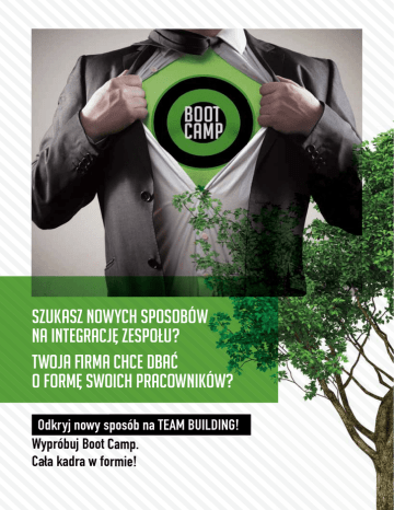 Szukasz nowych sposobów na integracje zespołu? Twoja firma chce dbac o forme swoich pracowników? Odkryj nowy sposób na TEAM BUILDING! Wypróbuj Boot Camp. Cała kadra w formie! Co to jest Boot Camp? Boot Camp to popularna w Europie i USA forma ruchu na świeżym powietrzu. Boot Camp to rekreacja, zazwyczaj na łonie natury, z ćwiczeniami wzmacniającymi wszystkie partie mięśni oraz poprawiającymi wydolność, szybkość i koordynację ćwiczących. idea Boot Camp Polska to przede wszystkim zespół Interakcja Rywalizacja Relacja Na naszych zajęciach interakcja między uczestnikami jest kluczowa – budujemy więzi w oparciu o wspólne spędzanie czasu, w ruchu, na powietrzu. Służą temu zajęcia w dwójkach, trójkach, ćwiczenia rywalizacyjne, gry i zabawy. Cały program jest tak zbudowany, aby realizować zadania team buildingu czy integracji pomiędzy wszystkimi uczestnikami. Na zajęciach Boot Camp Polska szczególne ważne są: indywidualny kontakt trenera z uczestnikiem relacje między uczestnikami pozytywna i energiczna atmosfera konstruktywna rywalizacja Nasze regularne zajęcia odbywają się na świeżym powietrzu – w parkach, lasach, w przestrzeni miejskiej. Jeśli prowadzimy zajęcia w pomieszczeniach to zawsze zawierają one część, która odbywa się na powietrzu. Indywidualne cele – Indywidualna oferta Przygotowujemy treningi Boot Camp wg indywidualnych wytycznych Klienta. Treningi mogą zawierać elementy wybranej dyscypliny sportu, spełniać rolę integracyjną, team building’u z elementami rywalizacji. Każdą ofertę przygotowujemy indywidualnie w zależności od celu jaki przed nami postawisz na przykład - zajęcia cykliczne lub jednodniowa integracja w postaci: BOOT CAMP TEAM BUILDING / BOOT CAMP LIGHT / BOOT CAMP HARD / BOOT CAMP ADVENTURE BOOT CAMP for RUNNERS / BOOT CAMP ABS / BOOT CAMP for SKIERS / BOOT CAMP FUN&GAMES BOOT CAMP with CHUCK NORRIS / MILITARY BOOT CAMP / SURVIVAL BOOT CAMP Kadra oraz rola trenera W naszym zespole mamy doświadczonych trenerów rozwoju osobistego, pasjonatów sportu, którzy pracują nad indywidualnymi programami szkoleniowymi. Trener jest liderem – motywuje, przypomina, pilnuje, zawsze podnosi poprzeczkę stopień wyżej niż kondycja i możliwości grupy, stwarza klimat „możesz więcej i dasz radę“. Dba o to, by uczestnicy mieli poczucie, że wymagania trenera są w zasięgu ich możliwości. Trener przekazuje energię uczestnikom, poprzez dynamikę zajęć tworzy atmosferę - energetyczną i pozytywną. Nasze standardowe zajecia Boot Camp: Boot Camp Light – zajęcia dla osób, które miały długą przerwę w uprawianiu sportu lub właśnie wyleczyły kontuzję. Pod czujnym okiem Trenera rozpoczniesz na nowo ćwiczenia, które nie przeciążą Twojego organizmu. Powoli przygotujesz się do większego wysiłku. Boot Camp – zajęcia ogólnorozwojowe w terenie z umiarkowaną intensywnością dla osób o podstawowej sprawności fizycznej. Pojedyncze zajęcia będą trwały około 1 godziny. Boot Camp Hard – zajęcia ogólnorozwojowe w terenie z wysoką intensywnością dla osób o średniej i wysokiej sprawności fizycznej. Boot Camp Special – zajęcia ogólnorozwojowe z elementami specjalistycznymi (narciarstwo, snowboard, samoobrona, biegi etc.) Rusz się z nami! Boot Camp dla firm Kontakt: Tomasz Horecki Email: [email protected] Tel.: 606 22 44 48 www.bootcamppolska.pl/pl/dla-firm Boot Camp Polska sp. z o.o. ul. Maszynowa 5/10, 02-392 Warszawa / REGON 147318076 / NIP 7010431604