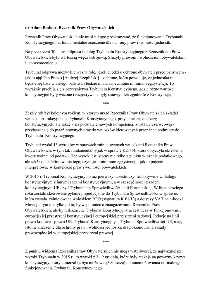 dr Adam Bodnar, Rzecznik Praw Obywatelskich Rzecznik Praw Obywatelskich nie musi nikogo przekonywać, że funkcjonowanie Trybunału Konstytucyjnego ma fundamentalne znaczenie dla ochrony praw i wolności jednostki. Na przestrzeni 30 lat współpraca i dialog Trybunału Konstytucyjnego z Rzecznikiem Praw Obywatelskich były wartością wręcz ustrojową. Służyły prawom i wolnościom obywatelskim i ich wzmocnieniu. Trybunał odgrywa niezwykle ważną rolę, jeżeli chodzi o ochronę obywateli przed państwem jak to ujął Pan Prezes [Andrzej Rzepliński] – ochronę, która powoduje, że jednostka nie będzie się bała własnego państwa i będzie miała zapewnione minimum egzystencji. To wyraźnie przebija się z orzecznictwa Trybunału Konstytucyjnego, gdzie różne wartości konstytucyjne były ważone i rozpatrywane były ustawy i ich zgodność z Konstytucją. *** Zeszły rok był kolejnym rokiem, w którym urząd Rzecznika Praw Obywatelskich składał wnioski abstrakcyjne do Trybunału Konstytucyjnego, przyłączał się do skarg konstytucyjnych, ale także - na podstawie nowych kompetencji z ustawy czerwcowej przyłączał się do pytań prawnych oraz do wniosków kierowanych przez inne podmioty do Trybunału Konstytucyjnego. Trybunał wydał 13 wyroków w sprawach zainicjowanych wnioskami Rzecznika Praw Obywatelskich, w tym tak fundamentalny jak w sprawie K21/14, która dotyczyła określenia kwoty wolnej od podatku. Ten wyrok jest istotny nie tylko z punktu widzenia podatkowego, ale także dla zdefiniowania tego, czym jest minimum egzystencji - jak to pojęcie interpretować w kontekście praw i wolności obywatelskich. W 2015 r. Trybunał Konstytucyjny po raz pierwszy uczestniczył też aktywnie w dialogu konstytucyjnym z innymi sądami konstytucyjnymi, a w szczególności z sądem konstytucyjnym UE czyli Trybunałem Sprawiedliwości Unii Europejskiej. W lipcu zeszłego roku zostało skierowane pytanie prejudycjalne do Trybunału Sprawiedliwości w sprawie, która została zainicjowana wnioskiem RPO (sygnatura K 61/13) a dotyczy VAT na e-booki. Mówię o tym nie tylko po to, by wspomnieć o zaangażowaniu Rzecznika Praw Obywatelskich, ale by wskazać, że Trybunał Konstytucyjny uczestniczy w funkcjonowaniu europejskiej przestrzeni konstytucyjnej i europejskiej przestrzeni sądowej. Relacje na linii prawo krajowe - prawo UE, Trybunał Konstytucyjny – Trybunał Sprawiedliwości UE, mają istotne znaczenie dla ochrony praw i wolności jednostki, dla poszanowania zasady praworządności w europejskiej przestrzeni prawnej. *** Z punktu widzenia Rzecznika Praw Obywatelskich nie ulega wątpliwości, że najważniejsze wyroki Trybunału w 2015 r. to wyroki z 3 i 9 grudnia, które były reakcją na poważny kryzys konstytucyjny, który zmierzał (a być może wciąż zmierza) do uniemożliwienia normalnego funkcjonowania Trybunału Konstytucyjnego. Wyroki te są ważne nie tylko z punktu widzenia samych rozstrzygnięć, ale także z powodu podkreślenia, na czym polega niezależność Trybunału, niezawisłość sędziów, i na czym polegają podstawowe wartości konstytucyjne, którym Trybunał ma służyć. Mają także znaczenie dla zdefiniowania i dookreślenia, że rolą Trybunału Konstytucyjnego jest przeciwstawianie się dyktaturze większości. Dla mnie bardzo istotne były słowa w jednym z uzasadnień tych wyroków, że „Trybunał Konstytucyjny budowały pokolenia prawników” - to 30 lat budowania naszej praworządności i systemu sądownictwa konstytucyjnego - i że „nie można pozwolić, by ten dorobek tak łatwo można było zburzyć”. *** Nie możemy pomijać milczeniem faktu, że został wydany wyrok z 9 marca 2016 r. Kolejny wyrok, który dotyczy funkcjonowania Trybunału, i który - co jest ważne - podkreśla znaczenie podstawowych zasad konstytucyjnych także w zakresie procesu legislacyjnego. Warto dodać jedną rzecz. Wyrok Trybunału Konstytucyjnego, jak również rozprawa z 8-9 marca, były szczególnym świadectwem solidarności środowisk prawniczych i ich wspólnego występowania w obronie sądownictwa konstytucyjnego. Mam tu na myśli uczestników postępowania, czyli te podmioty, które zdecydowały się na złożenie wniosku do Trybunału, ale także podmioty, które przedstawiły opinię przyjaciela sądu: Naczelną Radę Adwokacką, Krajową Radę Radców Prawnych, Helsińską Fundację Praw Człowieka oraz Fundację Batorego. Była to szczególna okoliczność. Za tym występowało w zasadzie całe środowisko prawnicze. Ten wyrok nie został opublikowany, co powoduje zagrożenie praw i wolności jednostki. Niepublikowanie wyroku z 9 marca będzie prowadziło bowiem do sytuacji pogłębiającego się chaosu prawnego. Cieszyć mogą oczywiście słowa jednego z sędziów Naczelnego Sądu Administracyjnego, że wyrok Trybunału Konstytucyjnego należy respektować. Cieszyć mogą uchwały sędziów kolejnych sądów apelacyjnych, czy Pierwszego Prezesa Sądu Najwyższego. Ale czym innym jest stosowanie i uznawanie wyroków, nawet nieogłoszonych, przez sądy, a czym innym - przez organy administracji, które nie mają aż tak wielkiej swobody decyzyjnej. Z punktu widzenia praw i wolności obywatelskich będzie to miało konkretne negatywne konsekwencje - polegające właśnie na pogłębiającym się chaosie prawnym. *** Chciałbym podkreślić, że paraliż konstytucyjny i sytuacja w Trybunale Konstytucyjnego ma znaczenie dla dziesiątek jeśli nie setek spraw wniesionych przez Rzecznika Praw Obywatelskich czy inne podmioty, ale także w wyniku złożonych skarg konstytucyjnych bądź pytań prawnych. Są to sprawy, które częstokroć czekają wiele miesięcy, lat, na rozpoznanie, a dotyczą konkretnych tematów, konkretnych problemów, konkretnych krzywd, które się w Polsce dzieją. Chciałbym wspomnieć o kilku takich sprawach, które zostały zainicjowane wnioskiem Rzecznika. Czasami bowiem w krajowej debacie brakuje wskazania, że nie