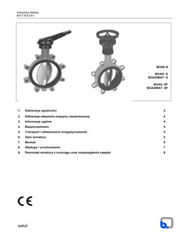 Instrukcja obsługi 8417.8/12-61 BOAX- N BOAX- S BOAXMAT- S BOAX- SF BOAXMAT- SF 1. Deklaracja zgodności 2 2. Deklaracja włączenia maszyny nieukończonej 4 3. Informacje ogólne 4 4. Bezpieczeństwo 4 5. Transport i składowanie (magazynowanie) 5 6. Opis armatury 5 7. Montaż 6 8. Obsługa / uruchomienie 7 9. Demontaż armatury z rurociągu oraz rozsprzęglenie napędu 8 1. Deklaracja zgodności Niniejszym, działając jako firma KSB S.A.S. Zone industrielle Gagnaire Fonsèche 24490 LA ROCHE CHALAIS z siedzibą pod adresem: 92635 - Gennevilliers Francja oświadczamy, że wymienione poniżej zawory są zgodne: • z wymogami Dyrektywy dotyczącej urządzeń ciśnieniowych 97/23/WE. Opis armatury – typoszeregu: Zawory motylkowe - BOAX-N - BOAX-S - BOAX-SF PS 10/16 bar PS 10/16 bar PS 10/16 bar DN 20-600 DN 20-600 DN 20-600 Zgodnie z ujednoliconymi normami europejskimi: EN 12516-2:2004; EN 12516-4:2008 oraz innymi normami / dyrektywami: EN 1563; ASME B16.42; EN 593; EN 10213-4 Urządzenia są przeznaczone do użycia z: Cieczami grupy 1 (z wykładziną K) i cieczami grupy 2 (z wykładziną XU) Procedura oceny zgodności: Moduł H Zakłady produkcyjne: LA ROCHE CHALAIS / BOURGOS Nazwa i adres jednostki notyfikowanej w odniesieniu do zamówień realizowanych do dnia 30/09/11 Lloyd’s Register Verification Limited 71 Fenchurch Street, Londyn EC3M 4BS Anglia Numer identyfikacyjny: 0038 Numer certyfikatu: RPS 0160325/01 Nazwa i adres jednostki notyfikowanej w odniesieniu do zamówień realizowanych począwszy od dnia 01/10/11: Bureau Veritas 67/71 boulevard du Château 92200 Neuilly-sur-Seine Francja Numer identyfikacyjny: 0062 Numer certyfikatu: CE-PED-H-KSB 001-11-FRA 2 Zakład produkcyjny: DALIAN Nazwa i adres jednostki notyfikowanej: Lloyd’s Register Verification Limited 71 Fenchurch Street, Londyn EC3M 4BS Anglia Numer identyfikacyjny: 0038 Numer certyfikatu: RPS 0160325/01 Zawory motylkowe o średnicy DN ≤ 50 są zgodne w wymogami Dyrektywy dotyczącej urządzeń ciśnieniowych 97/23/WE Art. 3 §3. Nie muszą one być oznakowywane symbolem WE wraz z numerem identyfikacyjnym jednostki notyfikowanej. • z wymogami przepisów REACH WE 1907/2006. Rozporządzenie WE 1907/2006 Parlamentu europejskiego dotyczące rejestracji, oceny i autoryzacji substancji chemicznych oraz ograniczeń obowiązujących w odniesieniu do tych substancji Opis armatury – typoszeregu: Artykuł 33/REACH Michel Delobel Dział zapewnienia jakości Zawory motylkowe - BOAX-N - BOAX-S - BOAX-SF PS 10/16 bar PS 10/16 bar PS 10/16 bar DN 20-600 DN 20-600 DN 20-600 Żadna z substancji wymienionych na liście kandydatów oraz w załączniku XIV rozporządzenia nie jest obecna w stężeniu przekraczającym 0,1% (w ujęciu masa/masa). wer. 7 - 07/11 Niniejszy dokument został sporządzony w postaci elektronicznej, w związku z powyższym złożenie podpisu nie jest wymagane. Jego udostępnienie publiczne oznacza zatwierdzenie. 3 2. Deklaracja włączenia maszyny nieukończonej Niniejszym, działając jako firma, KSB S.A.S. Zone industrielle Gagnaire Fonsèche 24490 LA ROCHE CHALAIS z siedzibą pod adresem: 92635 - Gennevilliers Francja będąca producentem maszyn nieukończonych przeznaczonych do następujących zespołów roboczych: zawór motylkowy + automatyczny układ napędowy + układ sygnalizacji lub ustawnik pozycyjny zawory motylkowe typu - BOAX-B, BOAX-N, BOAX-S, BOAX-SF - BOAXMAT-N, BOAXMAT-S, BOAXMAT-SF, BOAX-B Mat P, BOAX-B Mat E - ISORIA 10, ISORIA 16, ISORIA 20, ISORIA 25 - KE - MAMMOUTH 6, 10, 16, 20, 25 - DANAÏS 150, DANAIS MTII, DANAIS TBT z układami napędowymi typu: - Elektryczne: ACTELEC - Pneumatyczne: ACTAIR i DYNACTAIR - Hydrauliczne: ACTO, DYNACTO, ENNACTO - Z przeciwwagą: serii R380 i R480 oraz opcjonalnie wyposażonych w skrzynki sygnalizacyjne lub ustawnikami pozycyjnymi typu: - AMTROBOX – Wszystkie rodzaje ¬ - AMTROBOX R - Wszystkie rodzaje ¬ - AMTROBOX C R1290 - AMTROBOX S R1195 - R1077 / R1078 / R1079 / R1158 - AMTRONIC / SMARTRONIC - Wszystkie rodzaje - R1011 / R886 / R1007 / R834 oświadczamy, że istotne wymogi określone poniżej w punktach: 1.1.3, 1.1.5, 1.2.1, 1.3.2, 1.3.4, 1.3.7, 1.3.8, 1.3.8.1, 1.4.1, 1.4.2.1, 1.5.1, 1.5.2, 1.5.3, 1.5.4, 1.5.7, 1.5.8, 1.6.1, 1.7.2, 2.1.1 a, b, e oraz w załączniku I Dyrektywy 2006/42/WE zostały uwzględnione i są przestrzegane. Dokumentacja techniczna została opracowana zgodnie z postanowieniami Załącznika VII, część B. Na każde życzenie uprawnionych władz nasza firma może przesłać im odpowiednią szczegółową dokumentację techniczną drogą pocztową lub elektroniczną. Dokumentacja może zostać zamówiona pod adresem: Nicolas Lefrancq - KSB Parc d’activité Rémora 33170 Gradignan, Francja Inne wykorzystywane Dyrektywy: Dyrektywa dotycząca urządzeń ciśnieniowych 97/23/WE Dyrektywa ATEX 94/9/WE Maszyna nieukończona, której dotyczy niniejsza deklaracja włączenia nie może zostać oddana do eksploatacji, zanim maszyna, w której jest ona instalowana nie zostanie uznana za zgodną z postanowieniami Dyrektywy 2006/42/WE. Michel Delobel Dział zapewnienia jakości wer. 7 - 07/11 Niniejszy dokument został sporządzony w postaci elektronicznej, w związku z powyższym złożenie podpisu nie jest wymagane. Jego udostępnienie publiczne oznacza zatwierdzenie. 4 3. Informacje ogólne Niniejsza instrukcja obsługi dotyczy miękkouszczelnianych, elastomerowych zaworów motylkowych firmy KSB (patrz paragraf 6). Prace dotyczące projektowania i wytwarzania oraz czynności kontrolne dotyczące armatury KSB są objęte Systemem Zapewnienia Jakości zgodnie z postanowieniami normy EN ISO 9001 oraz Dyrektywy dotyczącej urządzeń ciśnieniowych 97/23/WE (DESP). W konfiguracji armatury z układem napędowym innym, niż ręczny, utworzony w ten sposób podzespół może spełniać wymogi dyrektywy maszynowej 2006/42/WE jako maszyna nieukończona w rozumieniu przedmiotowej dyrektywy. Aby zapewnić prawidłowe funkcjonowania zawor