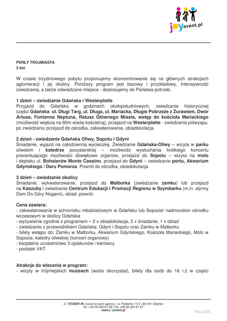 PERŁY TRÓJMIASTA 3 dni W czasie trzydniowego pobytu proponujemy skoncentrowanie się na głównych atrakcjach aglomeracji i jej okolicy. Poniższy program jest bazowy i przykładowy. Intensywność zwiedzania, a także odwiedzane miejsca - dostosujemy do Państwa potrzeb. 1 dzień – zwiedzanie Gdańska i Westerplatte Przyjazd do Gdańska w godzinach okołopołudniowych, zwiedzanie historycznej części Gdańska: ul. Długi Targ, ul. Długa, ul. Mariacka, Długie Pobrzeże z Żurawiem, Dwór Artusa, Fontanna Neptuna, Ratusz Głównego Miasta, wstęp do kościoła Mariackiego (możliwość wejścia na 80m wieżę kościelną), przejazd na Westerplatte - zwiedzanie półwyspu, po zwiedzaniu przejazd do ośrodka, zakwaterowanie, obiadokolacja. 2 dzień - zwiedzanie Gdańska Oliwy, Sopotu i Gdyni Śniadanie, wyjazd na całodzienną wycieczkę. Zwiedzanie Gdańska-Oliwy – wizyta w parku oliwskim i katedrze pocysterskiej – możliwość wysłuchania krótkiego koncertu prezentującego możliwości dźwiękowe organów, przejazd do Sopotu – wizyta na molo i deptaku ul. Bohaterów Monte Cassino, przejazd do Gdyni – zwiedzanie portu, Akwarium Gdyńskiego i Daru Pomorza. Powrót do ośrodka, obiadokolacja 3 dzień – zwiedzanie okolicy Śniadanie, wykwaterowanie, przejazd do Malborka (zwiedzanie zamku) lub przejazd na Kaszuby i zwiedzanie Centrum Edukacji i Promocji Regionu w Szymbarku (m.in. słynny Dom Do Góry Nogami), obiad, powrót. Cena zawiera: - zakwaterowanie w schronisku młodzieżowym w Gdańsku lub Sopocie/ nadmorskim ośrodku wczasowym w okolicy Gdańska - wyżywienie zgodnie z programem – 2 x obiadokolacja, 2 x śniadanie, 1 x obiad - zwiedzanie z przewodnikiem Gdańska, Gdyni i Sopotu oraz Zamku w Malborku - bilety wstępu do: Zamku w Malborku, Akwarium Gdyńskiego, Kościoła Mariackiego, Molo w Sopocie, katedry oliwskiej (koncert organowy) - bezpłatne uczestnictwo 3 opiekunów i kierowcy - podatek VAT Atrakcje do wlecenia w program: - wizyty w trójmiejskich muzeach (warto skorzystać, bilety dla osób do 16 r.ż w części JOYEVENT.PL travel & event agency | ul. Fieldorfa 11/3 | 80-041 Gdańsk tel. +48 58 320 61 69 | fax +48 58 320 61 67 www.joyevent.pl Phoca PDF obiektów kosztują tylko złotówkę!) – np. Dwór Artusa, Ratusz Głównego Miasta, Dom Uphagena, Muzeum Bursztynu, Narodowe Muzeum Morskie (a w nim: Żuraw i statek Sołdek), Muzeum Archeologiczne (szczególnie polecane najmłodszym!), żaglowiec Dar Pomorza, niszczyciel ORP Błyskawica - multimedialna wystawa w Europejskim Centrum Solidarności – polecamy szczególnie grupom młodzieżowym! parki edukacyjne: w Gdańsku – Centrum Hewelianum na Górze Gradowej oraz multimedialna wystawa Ludzie-Statki-Porty w Narodowym Muzeum Morskim, w Gdyni – Centrum Nauki Experyment - wizyta na bursztynowym stadionie – obecnie Stadion Energa - plażowanie ;) - Gdański Ogród Zoologiczny - rejs statkiem po porcie gdańskim lub gdyńskim - wizyta w manufakturze cukierków CiuCiu - od 2017 roku zapraszamy do multimedialnego Muzeum II Wojny Światowej (aktualnie w budowie) - aktywne zwiedzanie - rowerem / kajakiem Planujesz zorganizować klasową wycieczkę „z klasą”? Szukasz transportu, przewodnika, pilota, programu wycieczki? Nasze biuro podróży z przyjemnością Ci w tym pomoże. Joytrip.pl to organizator wycieczek szkolnych nastawiony przede wszystkim na satysfakcję klientów. W ramach turystyki szkolnej oferujemy autorskie programy wyjazdów szkolnych, zielonych szkół, biwaków i wycieczek krajoznawczych. Najchętniej wybierane przez naszych klientów programy i regiony to: Kraków, Warszawa, Lwów, Praga, Łeba, Zakopane, Poznań, Mazury, Pomorze, Bieszczady, Tatry, Szlak Piastowski, Pomorze. Podróżujemy zawsze bezpiecznie autokarem, busem lub pociągiem. Każda z naszych wycieczek daje możliwość aktywnego wypoczynku, naturalnego poszerzenia wiedzy uczniów i ich integracji przez zabawę, której tak często brakuje w dobie intensywnej komputeryzacji. JOYEVENT.PL travel & event agency | ul. Fieldorfa 11/3 | 80-041 Gdańsk tel. +48 58 320 61 69 | fax +48 58 320 61 67 www.joyevent.pl Phoca PDF