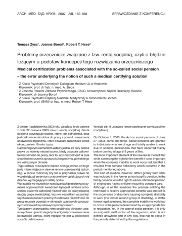 ARCH. MED. SĄD. KRYM., 2007, LVII, 153-158 Sprawozdanie z konferencji Tomasz Zyss1, Joanna Boroń2, Robert T. Hese3 Problemy orzecznicze związane z tzw. rentą socjalną, czyli o błędzie leżącym u podstaw koncepcji tego rozwiązania orzeczniczego Medical certification problems associated with the so-called social pension – the error underlying the notion of such a medical certifying solution Z Kliniki Psychiatrii Dorosłych Collegium Medium UJ w Krakowie Kierownik: prof. dr hab. n. med. A. Zięba 2 Z Zespołu Poradni Zdrowia Psychicznego, CALD, Uniwersytecki Szpital Dziecięcy, Kraków Kierownik: dr Joanna Boroń 3 Z Kliniki Psychiatrii Śląskiej Akademii Medycznej w Tarnowskich Górach Kierownik: prof. (ŚAM) dr hab. n. med. Robert T. Hese 1 Z dniem 1 października 2003 roku weszła w życie ustawa z dnia 27 czerwca 2003 roku o rencie socjalnej. Renta socjalna przysługuje osobie, która: jest pełnoletnia, oraz jest całkowicie niezdolna do pracy z powodu naruszenia sprawności organizmu, które powstało zasadniczo przed ukończeniem 18 roku życia. Najważniejszym elementem ustawy jest to, że przy ocenie prawa do tej renty nie jest istotne, kiedy powstała całkowita niezdolność do pracy, lecz to, aby niezdolność ta była skutkiem naruszenia sprawności organizmu, powstałego we wskazanym okresie. Tego rodzaju rozwiązane dalece obiega jednak od tego jakie miało miejsce w dawnej rencie uczniowskiej (szkolnej), w rencie rodzinnej czy też w przypadku prawa do wcześniejszej emerytury pracowników opiekujących się dziećmi wymagającymi stałej opieki. Wprawdzie we wszystkich rozwiązaniach przesłanką otrzymania odpowiednich świadczeń było/jest istnienie schorzeń na poziomie całkowitej niezdolności do pracy (dawnej drugiej grupy inwalidzkiej), lecz we wszystkich wcześniejszych rozwiązaniach prawnych całkowita niezdolność do pracy musiała powstać w okresach czasowych oznaczonych odpowiednią ustawą/rozporządzeniem. Tymczasem w przypadku renty socjalnej w okresach ustawowych ma ujawnić się jedynie enigmatyczne naruszenie sprawności ustroju, które nigdzie nie jest w jakikolwiek sposób definiowane. Wydaje się, iż ustawa o rencie społecznej wymaga pilnej modyfikacji. On October 1, 2003, the Act on social pension of June 27, 2003, came into force. Social pensions are granted to individuals who are of age and totally unable to work due to somatic deficiencies that have occurred mainly before coming of age (18 years of life). The most important element of the new law is the fact that while assessing the right for the benefit it is not important when the complete inability to work occurred, but that it resulted from somatic deficiency which occurred in the period mentioned above. This kind of solution, however, differs greatly from what was included in the former school-pupil’s pension, in the family pension, or in the right to earlier retirement pension of employees having children requiring constant care. Although in all the solutions the premise entitling the individual to receive appropriate benefits was and still is the occurrence of disorders causing complete disability to work (the former second group of disability), in all the former legal solutions, the complete inability to work had to occur in the periods determined by an appropriate law or regulation. Yet, in the case of social pension, it is only an enigmatic malfunction of the organism, which is not defined anywhere and in any way, that has to occur in the periods determined by the regulations. 154 Tomasz Zyss It seems that the law on social pension requires urgent modification. Słowa kluczowe: renta socjalna, psychiatria, błąd koncepcyjny Key words: social pension, psychiatry, conceptual error Wprowadzenie Dzieci, młodzież i młode osoby dorosłe są tymi grupami wiekowymi, które w przypadku zachorowania na poważną chorobę somatyczną czy też zaburzenia psychiczne – nie ma możliwości wypracowania odpowiedniego okresu składkowego. Ustawodawca przewidział dla młodych osób odpowiednio krótsze okresy stażu ubezpieczeniowego (okresy składkowe i nieskładkowe), które są konieczne w celu otrzymania świadczeń renty inwalidzkiej [2, 4]. Wymagany staż ubezpieczeniowy: – 1 rok, gdy niezdolność do pracy powstała przed 20. rokiem życia; – 2 lata u osób w wieku od 20 do 22 lat; – 3 lata u osób w przedziale wiekowym od 22 do 25 lat; – 4 lata u osób od 25 do 30 lat; – 5 lat, gdy osoba ma powyżej 30 lat. Jeżeli ubezpieczony nie osiągnął wyżej podanego okresu, warunek posiadania wymaganego okresu uważa się za spełniony, gdy [1, 2]: – ubezpieczony został zgłoszony do ubezpieczenia przed ukończeniem 18 lat albo w ciągu 6 miesięcy po ukończeniu nauki w szkole ponadpodstawowej, ponadgimnazjalnej lub w szkole wyższej; – do dnia powstania niezdolności do pracy miał, bez przerwy lub z przerwami nie przekraczającymi 6 miesięcy, okresy składkowe i nieskładkowe. Dawna renta uczniowska (szkolna) Przed kilkoma laty funkcjonowała tzw. renta „uczniowska”, zwanej również „szkolną”. Była to renta inwalidzka, która przysługiwała na podstawie poprzedniej ustawy z dnia 14 grudnia 1982 roku o zaopatrzeniu emerytalnym pracowników i ich rodzin (Dz.U. nr 40, poz. 267 z późniejszymi zmianami). Zgodnie z art. 63 ust. 1 tej ustawy prawo do renty inwalidzkiej przysługiwało uczniom szkół ponadpodstawowych, studentom szkół wyższych i uczestnikom studiów doktoranckich lub aspirantury naukowej, którzy stali się inwalidami I lub II grupy Nr 1 w czasie uczęszczania do szkoły lub odbywania studiów [3]. Od 01 września 1997 r. pojęcie inwalidztwa II i I grupy zastąpiono pojęciem odpowiednio całkowitej niezdolności do pracy lub całkowitej niezdolności do pracy z niezdolnością do samodzielnej egzystencji. Nowa ustawa z 17 grudnia 1998 r. o emeryturach i rentach z Funduszu Ubezpieczeń Społecznych (Dz. U. Nr 162 poz. 1119 z późn. 