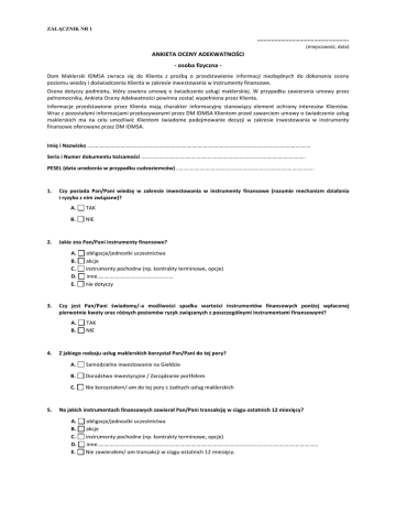 ZAŁĄCZNIK NR 1 …………………………………………………. (miejscowość, data) ANKIETA OCENY ADEKWATNOŚCI - osoba fizyczna Dom Maklerski IDMSA zwraca się do Klienta z prośbą o przedstawienie informacji niezbędnych do dokonania oceny poziomu wiedzy i doświadczenia Klienta w zakresie inwestowania w instrumenty finansowe. Ocena dotyczy podmiotu, który zawiera umowę o świadczenie usługi maklerskiej. W przypadku zawierania umowy przez pełnomocnika, Ankieta Oceny Adekwatności powinna zostać wypełniona przez Klienta. Informacje przedstawione przez Klienta mają charakter informacyjny stanowiący element ochrony interesów Klientów. Wraz z pozostałymi informacjami przekazywanymi przez DM IDMSA Klientom przed zawarciem umowy o świadczenie usług maklerskich ma na celu umożliwić Klientom świadome podejmowanie decyzji w zakresie inwestowania w instrumenty finansowe oferowane przez DM IDMSA. Imię i Nazwisko ……………………………………………………………………………………………………………………………………………… Seria i Numer dokumentu tożsamości …………………………………………………………….…………………………………………. PESEL (data urodzenia w przypadku cudzoziemców) ………………………………………………………………………………………. 1. 2. Czy posiada Pan/Pani wiedzę w zakresie inwestowania w instrumenty finansowe (rozumie mechanizm działania i ryzyko z nim związane)? A. TAK B. NIE Jakie zna Pan/Pani instrumenty finansowe? A. B. C. D. E. 3. Czy jest Pan/Pani świadomy/-a możliwości spadku wartości instrumentów finansowych poniżej wpłaconej pierwotnie kwoty oraz różnych poziomów ryzyk związanych z poszczególnymi instrumentami finansowymi? A. B. 4. 5. obligacje/jednostki uczestnictwa akcje instrumenty pochodne (np. kontrakty terminowe, opcje) inne……………………………………….……… nie dotyczy TAK NIE Z jakiego rodzaju usług maklerskich korzystał Pan/Pani do tej pory? A. Samodzielne inwestowanie na Giełdzie B. Doradztwo inwestycyjne / Zarządzanie portfelem C. Nie korzystałem/-am do tej pory z żadnych usług maklerskich Na jakich instrumentach finansowych zawierał Pan/Pani transakcję w ciągu ostatnich 12 miesięcy? A. B. C. D. E. obligacje/jednostki uczestnictwa akcje instrumenty pochodne (np. kontrakty terminowe, opcje) inne………………………………………………………………………………………………………………………………….………… Nie zawierałem/-am transakcji w ciągu ostatnich 12 miesięcy. 6. Jaka była średnia wielkość dokonywanych przez Pana/Panią transakcji w instrumenty wskazane w pkt.3? 7. A. poniżej 5 000 zł B. 5 000 – 10 000 zł C. powyżej 10 000 zł D. nie dotyczy Jak często dokonywał Pan/Pani transakcji na wskazanych w pkt. 3 instrumentach? 8. 9. A. sporadycznie B. częściej niż raz w miesiącu C. częściej niż raz w tygodniu D. nie dotyczy Jaki charakter miały podejmowane przez Pana/Panią decyzje inwestycyjne? A. Długookresowy inwestycyjny (inwestowanie bieżących nadwyżek w bezpieczne instrumenty finansowe) B. Zabezpieczający (zabezpieczanie transakcji handlowych lub innych przepływów pieniężnych) C. Spekulacyjny (wykorzystanie przyszłych ruchów cen instrumentów finansowych w celu osiągnięcia korzyści) D. Nie dotyczy Jakie posiada Pan/Pani wykształcenie? A. Podstawowe B. Średnie C. Wyższe D. Wyższe ekonomiczne 10. Czy wykonywany przez Pana/Panią obecnie lub w przeszłości zawód lub prowadzona działalność były związane z podejmowaniem decyzji w zakresie inwestowania w instrumenty finansowe? A. B. TAK NIE Odmawiam udzielenia odpowiedzi na powyższe pytania OŚWIADCZENIE KLIENTA Potwierdzam rzetelność powyższych informacji. Oświadczam, że otrzymałem/-łam informacje dotyczące usług, które mają być świadczone na podstawie zawieranej umowy. Zapoznano mnie z ryzykiem inwestycyjnym związanym z ww. usługami. Zostałem/-łam poinformowany/-a, że na skutek nieudzielenia przeze mnie odpowiedzi na powyższe pytania DM IDMSA nie jest w stanie dokonać stosownej oceny. ______________________ (data) _______________________________________________ (data i podpis pracownika DM IDMSA przyjmującego formularz) (podpis Klienta) Ilość punktów uzyskana przez Pana/Panią na podstawie testu: ……………………………………………. Wynik testu jest pozytywny Wynik testu jest negatywny Na podstawie informacji przekazanych przez Pana/Panią w „Ankiecie Oceny Adekwatności” Dom Maklerski stwierdza, że w ocenie Domu Maklerskiego usługi i produkty oferowane przez Dom Maklerski są adekwatne: Na podstawie informacji przekazanych przez Pana/Panią w „Ankiecie Oceny Adekwatności” Dom Maklerski stwierdza, że w ocenie Domu Maklerskiego usługi i produkty oferowane przez Dom Maklerski są nieadekwatne w zakresie wszystkich instrumentów finansowych ze względu na zbyt duże ryzyko inwestycyjne w stosunku do zadeklarowanej wiedzy i doświadczenia inwestycyjnego w zakresie instrumentów rynku kasowego w zakresie instrumentów rynku terminowego Oświadczam, że zostałem/-am poinformowana, iż usługa świadczona na podstawie umowy świadczenia usług maklerskich jest dla mnie odpowiednia ……………………………………………………….. (podpis Klienta) Oświadczam, że zostałem/-am ostrzeżony, iż w świetle przekazanych informacji dotyczących wiedzy i doświadczenia Klienta w dziedzinie inwestycji, w ocenie Domu Maklerskiego IDM S.A., usługa świadczona na podstawie zawartej umowy świadczenia usług maklerskich niesie ze sobą zbyt duże ryzyko inwestycyjne i jest nieodpowiednią dla mnie inwestycją Klient nie udzielił wymaganych informacji Dom Maklerski IDMSA S.A. pragnie poinformować, że w związku z faktem, iż nie udzielił Pan/Pani wyczerpuj