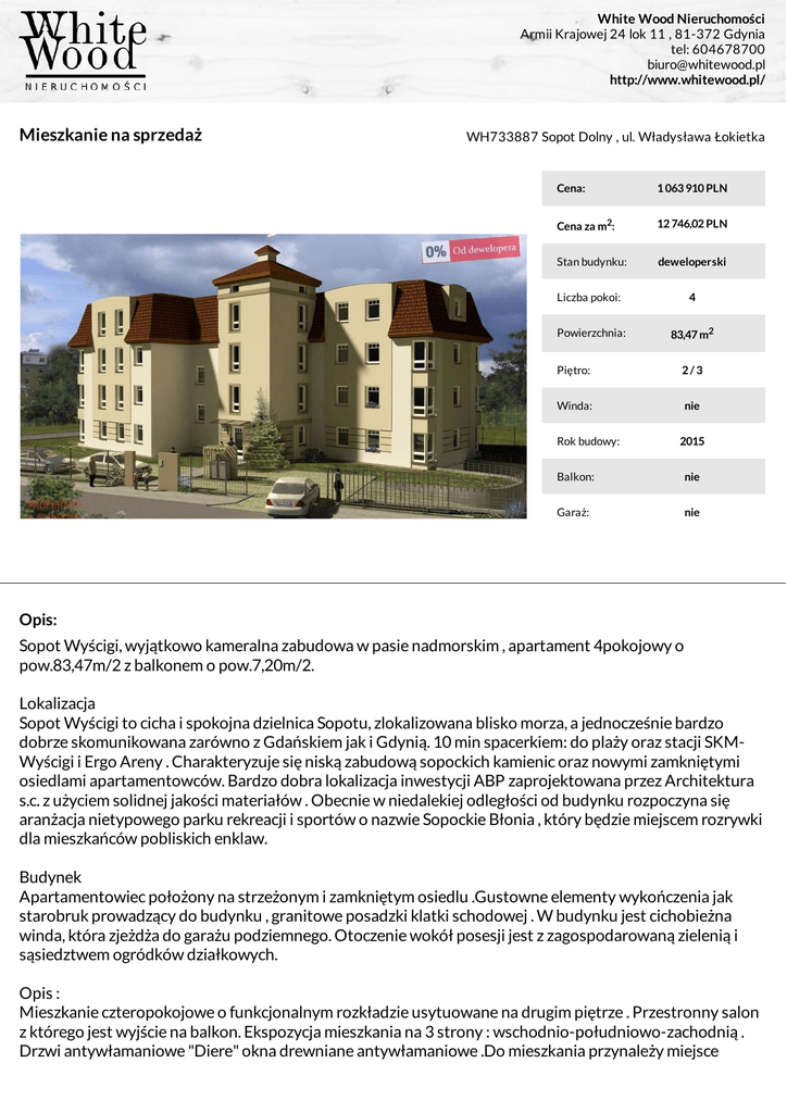 White Wood Nieruchomości Armii Krajowej 24 lok 11 , 81-372 Gdynia tel: 604678700 [email protected] http://www.whitewood.pl/ Mieszkanie na sprzedaż WH733887 Sopot Dolny , ul. Władysława Łokietka Cena: 1 063 910 PLN Cena za m2: 12 746,02 PLN Stan budynku: deweloperski Liczba pokoi: 4 Powierzchnia: 83,47 m2 Piętro: 2/3 Winda: nie Rok budowy: 2015 Balkon: nie Garaż: nie Opis: Sopot Wyścigi, wyjątkowo kameralna zabudowa w pasie nadmorskim , apartament 4pokojowy o pow.83,47m/2 z balkonem o pow.7,20m/2. Lokalizacja Sopot Wyścigi to cicha i spokojna dzielnica Sopotu, zlokalizowana blisko morza, a jednocześnie bardzo dobrze skomunikowana zarówno z Gdańskiem jak i Gdynią. 10 min spacerkiem: do plaży oraz stacji SKMWyścigi i Ergo Areny . Charakteryzuje się niską zabudową sopockich kamienic oraz nowymi zamkniętymi osiedlami apartamentowców. Bardzo dobra lokalizacja inwestycji ABP zaprojektowana przez Architektura s.c. z użyciem solidnej jakości materiałów . Obecnie w niedalekiej odległości od budynku rozpoczyna się aranżacja nietypowego parku rekreacji i sportów o nazwie Sopockie Błonia , który będzie miejscem rozrywki dla mieszkańców pobliskich enklaw. Budynek Apartamentowiec położony na strzeżonym i zamkniętym osiedlu .Gustowne elementy wykończenia jak starobruk prowadzący do budynku , granitowe posadzki klatki schodowej . W budynku jest cichobieżna winda, która zjeżdża do garażu podziemnego. Otoczenie wokół posesji jest z zagospodarowaną zielenią i sąsiedztwem ogródków działkowych. Opis : Mieszkanie czteropokojowe o funkcjonalnym rozkładzie usytuowane na drugim piętrze . Przestronny salon z którego jest wyjście na balkon. Ekspozycja mieszkania na 3 strony : wschodnio-południowo-zachodnią . Drzwi antywłamaniowe "Diere" okna drewniane antywłamaniowe .Do mieszkania przynależy miejsce White Wood Nieruchomości Armii Krajowej 24 lok 11 , 81-372 Gdynia tel: 604678700 [email protected] http://www.whitewood.pl/ parkingowe( 25000PLN) w garażu oraz komórka. Rozkład : - Salon - 25,65m/2 - Sypialnia1- 13,28m/2 -Sypialnia2-8,44m/2 -Sypialnia3- 6,90m/2 -Kuchnia- 6,70m/2 -Hol - 11,82m/2 -Łazienka- 6,70m/2 -WC-1,66m/2 -Garderoba- 1,57m/2 -Balkon-7,20m/2 Dorota Król +48-790-366-966 Dorota Król +48-790-366-966 White Wood Nieruchomości Dorota Król Armii Krajowej 24 lok 11 , 81-372 Gdynia +48-790-366-966 [email protected] http://www.whitewood.pl/