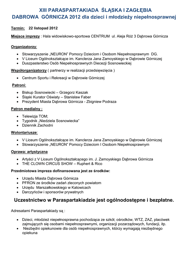 XIII PARASPARTAKIADA ŚLĄSKA I ZAGŁĘBIA DABROWA GÓRNICZA 2012 dla dzieci i młodzieŜy niepełnosprawnej Termin: 22 listopad 2012 Miejsce imprezy : Hala widowiskowo-sportowa CENTRUM ul. Aleja RóŜ 3 Dąbrowa Górnicza Organizatorzy: • Stowarzyszenie „NEURON” Pomocy Dzieciom i Osobom Niepełnosprawnym DG. • V Liceum Ogólnokształcące im. Kanclerza Jana Zamoyskiego w Dąbrowie Górniczej • Duszpasterstwo Osób Niepełnosprawnych Diecezji Sosnowieckiej Współorganizatorzy ( partnerzy w realizacji przedsięwzięcia ) • Centrum Sportu i Rekreacji w Dąbrowie Górniczej Patroni: • Biskup Sosnowiecki – Grzegorz Kaszak • Śląski Kurator Oświaty – Stanisław Faber • Prezydent Miasta Dąbrowa Górnicza - Zbigniew Podraza Patron medialny : • Telewizja TOM; • Tygodnik „Niedziela Sosnowiecka” • Dziennik Zachodni Wolontariusze: • V Liceum Ogólnokształcące im. Kanclerza Jana Zamoyskiego w Dąbrowie Górniczej • Stowarzyszenie „NEURON” Pomocy Dzieciom I Osobom Niepełnosprawnym Oprawa: artystyczna • Artyści z V Liceum Ogólnokształcącego im. J. Zamoyskiego Dąbrowa Górnicza • THE CLOWN CIRCUS SHOW – Ruphert & Rico Przedmiotowa impreza dofinansowana jest ze środków: • • • • Urzędu Miasta Dąbrowa Górnicza PFRON ze środków zadań zleconych powiatom Urzędu Marszałkowskiego w Katowicach Darczyńców i sponsorów prywatnych Uczestnictwo w Paraspartakiadzie jest ogólnodostępne i bezpłatne. Adresatami Paraspartakiady są : • Dzieci, młodzieŜ niepełnosprawna pochodząca ze szkół, ośrodków, WTZ, ZAZ, placówek zajmujących się osobami niepełnosprawnymi, organizacji pozarządowych, fundacji, itp. • Niezbędni opiekunowie dla osób niepełnosprawnych, którzy wymagają niezbędnego opiekuna PROGRAM XIII PARASPARTAKIADY Śląska i Zagłębia Dąbrowa Górnicza 2012 dla dzieci i młodzieŜy niepełnosprawnej CZWARTEK 22 listopad 2012. Miejsce imprezy : Hala Widowiskowo-Sportowa „CENTRUM” ul. Aleja RóŜ 3 Dąbrowa Górnicza ( Park Hallera) 00 930 Przyjazd grup sportowych do Hali Widowiskowo – Sportowej „CENTRUM” 1. 8 ul. Aleja RóŜ 3 w Dąbrowie Górniczej ( obok Aqua Parku ) a) zbiórka , rejestracja uczestników, b) wydawanie numerów startowych, c) zajmowanie miejsc na trybunach 30 2. 9 – oficjalne otwarcie XIII Paraspartakiady a) Występ artystyczny, b) Powitanie gości i druŜyn uczestniczących w Paraspartakiadzie c) Przemówienia oraz wręczenie pamiątkowych medali dla uczestników zawodów d) Zapalenie znicza e) Przemarsz ekip sportowych 00 3. 10 – rozpoczęcie konkurencji sportowych. Wręczanie pucharów i dyplomów na bieŜąco. a) konkurencje • tor przeszkód • rzuty do kosza b) Dodatkowe konkurencje indywidualne tylko dla osób poruszających się na wózkach inwalidzkich : • wyścig po torze przeszkód na czas • rzuty do celu W przerwach miedzy poszczególnymi konkurencjami sportowymi zabawiać będą Ruphert i Rico ( clown Circus show) 00 4. 11 – 1230 : • wydawanie ciepłego posiłku, napoi, słodyczy, itp. • Loteria fantowa (losowanie drobnych nagród rzeczowych ) • wydawanie pamiątkowych paczek dla uczestników zawodów wręczanie nagród indywidualnych za zajęcie I – III miejsca oraz nagród I-III miejsce w konkurencjach druŜynowych 30 5. 13 – zakończenie konkurencji sportowych. Zabawa dla wszystkich uczestników z RUPHERT & RICO połączona z wręczaniem nagród indywidualnych i druŜynowych. 6. 1400 Zakończenie Paraspartakiady i wygaszenie znicza.