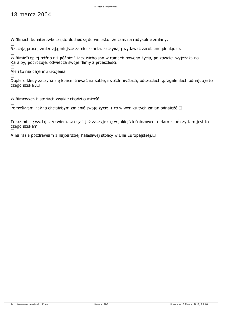 Marzena Chełminiak 18 marca 2004 W filmach bohaterowie często dochodzą do wniosku, że czas na radykalne zmiany. Rzucają prace, zmieniają miejsce zamieszkania, zaczynają wydawać zarobione pieniądze. W filmie"Lepiej późno niż później" Jack Nicholson w ramach nowego życia, po zawale, wyjeżdża na Karaiby, podróżuje, odwiedza swoje flamy z przeszłości. Ale i to nie daje mu ukojenia. Dopiero kiedy zaczyna się koncentrować na sobie, swoich myślach, odczuciach ,pragnieniach odnajduje to czego szukał. W filmowych historiach zwykle chodzi o miłość. Pomyślałam, jak ja chciałabym zmienić swoje życie. I co w wyniku tych zmian odnaleźć. Teraz mi się wydaje, że wiem...ale jak już zaszyje się w jakiejś leśniczówce to dam znać czy tam jest to czego szukam. A na razie pozdrawiam z najbardziej hałaśliwej stolicy w Unii Europejskiej. http://www.mchelminiak.pl/new Kreator PDF Utworzono 3 March, 2017, 23:40
