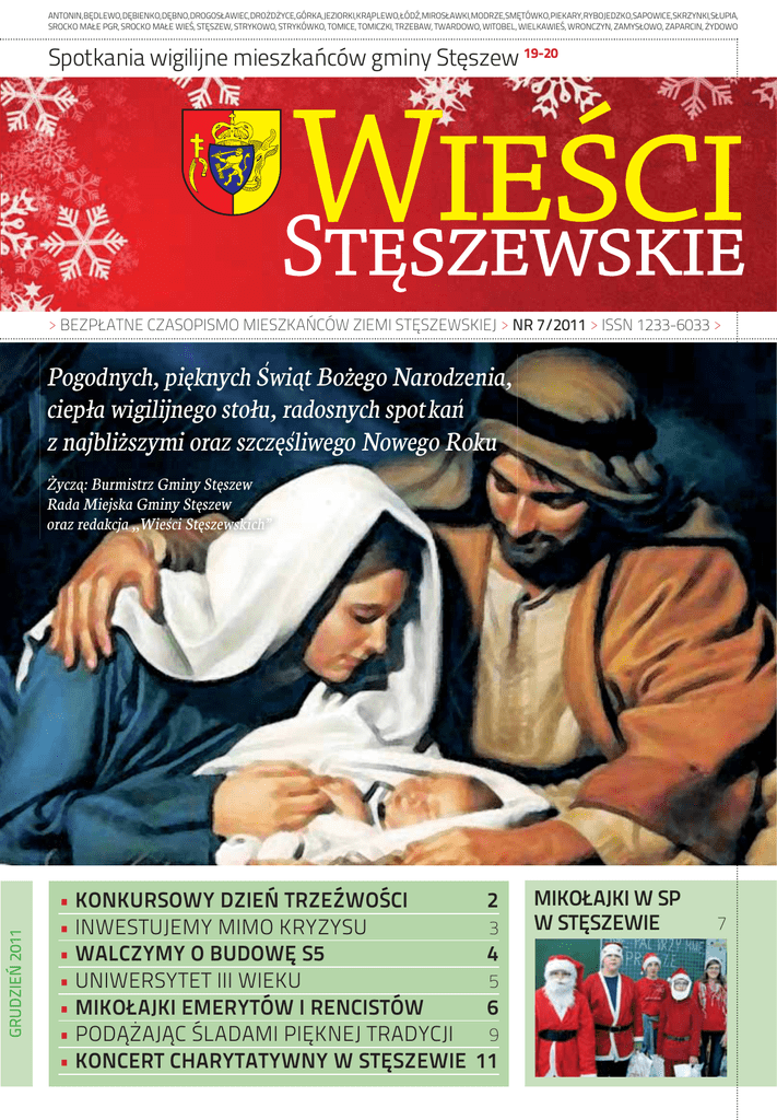 ANTONIN, BĘDLEWO, DĘBIENKO, DĘBNO, DROGOSŁAWIEC, DROŻDŻYCE, GÓRKA, JEZIORKI, KRĄPLEWO, ŁÓDŹ, MIROSŁAWKI, MODRZE, SMĘTÓWKO, PIEKARY, RYBOJEDZKO, SAPOWICE, SKRZYNKI, SŁUPIA, SROCKO MAŁE PGR, SROCKO MAŁE WIEŚ, STĘSZEW, STRYKOWO, STRYKÓWKO, TOMICE, TOMICZKI, TRZEBAW, TWARDOWO, WITOBEL, WIELKAWIEŚ, WRONCZYN, ZAMYSŁOWO, ZAPARCIN, ŻYDOWO Spotkania wigilijne mieszkańców gminy Stęszew 19-20 > BEZPŁATNE CZASOPISMO MIESZKAŃCÓW ZIEMI STĘSZEWSKIEJ > NR 7/2011 > ISSN 1233-6033 > Pogodnych, pięknych Świąt Bożego Narodzenia, ciepła wigilijnego stołu, radosnych spotkań z najbliższymi oraz szczęśliwego Nowego Roku GRUDZIEŃ 2011 Życzą: Burmistrz Gminy Stęszew Rada Miejska Gminy Stęszew oraz redakcja ,,Wieści Stęszewskich” • KONKURSOWY DZIEŃ TRZEŹWOŚCI • INWESTUJEMY MIMO KRYZYSU • WALCZYMY O BUDOWĘ S5 • UNIWERSYTET III WIEKU • MIKOŁAJKI EMERYTÓW I RENCISTÓW • PODĄŻAJĄC ŚLADAMI PIĘKNEJ TRADYCJI • KONCERT CHARYTATYWNY W STĘSZEWIE 2 3 4 5 6 9 11 MIKOŁAJKI W SP W STĘSZEWIE 7 2 KO N K U R S Uczniowie o alkoholu i narkotykach Dzień trzeźwości w gminie Stęszew, czyli konkursy dla szkół ramach Dnia Trzeźwości Gminna Komisja Rozwiązywania Problemów Alkoholowych w Stęszewie ogłosiła konkurs dla szkół. Zadaniem uczniów podstawówek było przygotowanie prac plastycznych pt.: „Sport to zdrowie”. Klasy I-III przygotowywały prace w formacie A3 dowolną techniką. Starsi uczniowie z klas IV-VI tworzyli zaś komiks składający się z 4-6 obrazków w formacie A5. Natomiast gimnazjaliści mieli do napisania pracę pisemną (literacką) na temat: „Alkohol, narkotyki – tak czy nie. Jak chcesz wkroczyć w dorosłe życie? Moje przemyślenia”. 5 grudnia w Domu Kultury w Stęszewie odbyło się rozstrzygnięcie konkursu i nagrodzenie najlepszych prac przez burmistrza gminy Stęszew. Oto wyniki: • W kategorii klas I–III zwyciężyli: I miejsce: Kacper Przedwojski – SP Modrze, Julia Osses – SP Stęszew; II miejsce: Karol Przedwojski – SP Modrze, Martyna Konieczna – SP Modrze, Mateusz Przybylski – SP Modrze, Sandra Pawlak – SP Modrze, Patrycja Ratajczak – SP Stęszew; III miejsce: Zuzanna Nowicka – SP Modrze, Maciej Roszkiewicz – SP Jeziorki, Adrianna Kośmider – SP Jeziorki; Wyróżnienia: Kacper Bałuszek – SP Strykowo, Anna Krom – Trzebaw, Antonia Cojak – SP Jeziorki, Marianna Kmiecik – SP Modrze, Katarzyna Józefiak – SP Modrze, Agnieszka Kolenda – SP Modrze, Gabriela Nowak – SP Modrze, Dominika Kmiecik – SP Modrze, Maciej Starkiewicz – SP Modrze, Kacper Górny – SP Modrze, Łukasz Kaczmarek – SP Modrze. • W kategorii klas IV–VI zwyciężyli: I miejsce: Anna Tomczak – SP Modrze; II miejsce: Patrycja Napierkowska – SP Modrze, Paulina Rył – SP Modrze, Klaudia Jankowska – SP Modrze; III miejsce: Filip Budziński – SP Modrze, Weronika Hejman – SP Modrze, Maciej Maciejewski – SP Jeziorki, Klaudia Kostrom – SP Stęszew • W kategorii gimnazjaliści: I miejsce: Kinga Kaniewska – Gimnazjum w Stęszewie; wyróżnienia: Paweł Pietrzak, Wojciech Woziwodzki. Warto wspomnieć, że nagrodzone prace gimnazjalistów zostały opublikowane w „Kurierze Lokalnym”. WS NR 7 / 2011 GRUDZIEŃ 2011 W Wyróżnione osoby w kategorii klas I–III. Pamiątkowe zdjęcie zwycięzców w kategorii klas IV–VI. Gimnazjaliści nagrodzeni w konkursie. ROZMOWA 3 Kryzys nas nie ominął, ale inwestujemy Rozmowa z Włodzimierzem Pinczakiem, burmistrzem gminy Stęszew Koniec roku to doskonała okazja do podsumowań. Jaki on był, pańskim zdaniem, dla gminy Stęszew? • To był bardzo trudny rok! I to z wielu względów. Z jednej strony mamy do czynienia z kryzysem finansowym, który odczuwamy także w naszej gminie, a z drugiej pracy nie ułatwiała nam grupa niektórych radnych. Generalnie od początku roku mieliśmy trudne sytuacje, jeśli chodzi o dostępność gotówki. To powodowało, że zmuszeni byliśmy podejmować decyzje o odsuwaniu w czasie niektórych zadań. Dodatkowo przez to, że ustawodawca nakazuje nam wybierać w przetargach najtańszych wykonawców, to doszły problemy na etapie realizacji inwestycji, ale mimo to udało się je dopiąć do końca. Kolejną trudnością okazał się nowy obowiązek, który został nałożony na samorzą- dy. Chodzi o bezpłatne godziny w przedszkolach. Wielu rodziców wykorzystuje tą możliwość, posyłając dzieci jedynie na 5 godzin bezpłatnych. Udało nam się zwiększyć liczbę miejsc w przedszkolach tak, że prawie 100 procent dzieci korzysta z opieki przedszkolnej. To cieszy, ale w sytuacji, kiedy rodzice w niewielkim stopniu partycypują w kosztach pobytu i wyżywienia swoich pociech, to obciążenie dla budżetu gminy jest bardzo znaczące. Podobnie jest w szkołach – koszty ich utrzymania rosną, a z budżetu państwa na realizację nowych zadań nie otrzymujemy adekwatnych do potrzeb pieniędzy. W tym roku gmina realizuje bardzo kosztowną inwestycję, czyli kanalizację sanitarną we Wronczynie, Stęszewie, Trzebawiu i Sapowicach. Koszty są ogromne, a efekty dla oka mieszkańców… mało widoczne. • Powtórzę, że kryzys panujący w kraju nie ominął gminy Stęszew, ale na tle wielu innych gmin w Wielkopolsce wyróżniamy się tym, że wciąż inwestujemy. Dodam tylko, że już w pięciu gminach wprowadzony został zarząd komisaryczny ze względu na brak płynności finansowej. My tymczasem, mimo bardzo trudnej sytuacji myślimy o kolejnych inwestycjach. Przygotowywany jest projekt budżetu na 2012 rok. Jak on się przedstawia w najważniejszych pozycjach, czyli po stronie dochodów i wydatków? Na jakie więc inwestycje mogą liczyć mieszkańcy? • Kontynuować będziemy budowę kanalizacji sanitarnej w Sapowicach. Chcemy działać w kierunku poprawy zarówno jakości jak i ilości wody z wodociągu. Zamierzamy realizować infrastrukturę rekreacyjną i sportową, a jeśli zima nie zabierze zbyt wielu pieniędz