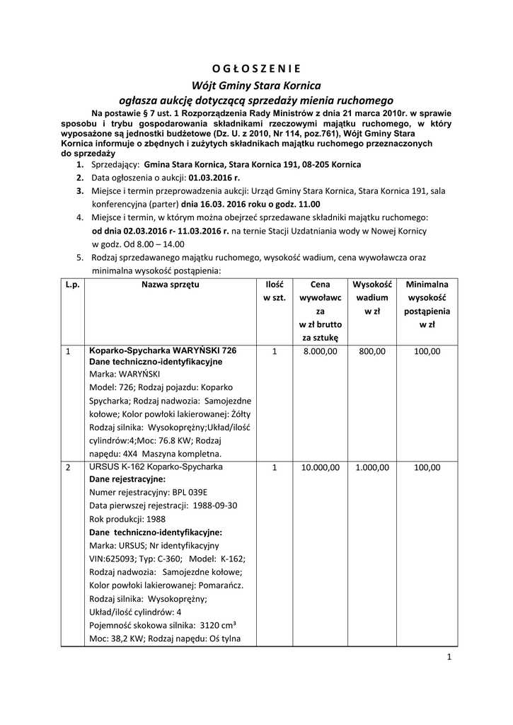 OGŁOSZENIE Wójt Gminy Stara Kornica ogłasza aukcję dotyczącą sprzedaży mienia ruchomego Na postawie § 7 ust. 1 Rozporządzenia Rady Ministrów z dnia 21 marca 2010r. w sprawie sposobu i trybu gospodarowania składnikami rzeczowymi majątku ruchomego, w który wyposażone są jednostki budżetowe (Dz. U. z 2010, Nr 114, poz.761), Wójt Gminy Stara Kornica informuje o zbędnych i zużytych składnikach majątku ruchomego przeznaczonych do sprzedaży 1. Sprzedający: Gmina Stara Kornica, Stara Kornica 191, 08-205 Kornica 2. Data ogłoszenia o aukcji: 01.03.2016 r. 3. Miejsce i termin przeprowadzenia aukcji: Urząd Gminy Stara Kornica, Stara Kornica 191, sala konferencyjna (parter) dnia 16.03. 2016 roku o godz. 11.00 4. Miejsce i termin, w którym można obejrzeć sprzedawane składniki majątku ruchomego: od dnia 02.03.2016 r- 11.03.2016 r. na ternie Stacji Uzdatniania wody w Nowej Kornicy w godz. Od 8.00 – 14.00 5. Rodzaj sprzedawanego majątku ruchomego, wysokość wadium, cena wywoławcza oraz minimalna wysokość postąpienia: L.p. Nazwa sprzętu Ilość Cena Wysokość Minimalna w szt. wywoławc wadium wysokość za w zł postąpienia w zł brutto w zł za sztukę Koparko-Spycharka WARYŃSKI 726 1 1 8.000,00 800,00 100,00 Dane techniczno-identyfikacyjne Marka: WARYŃSKI Model: 726; Rodzaj pojazdu: Koparko Spycharka; Rodzaj nadwozia: Samojezdne kołowe; Kolor powłoki lakierowanej: Żółty Rodzaj silnika: Wysokoprężny;Układ/ilość cylindrów:4;Moc: 76.8 KW; Rodzaj napędu: 4X4 Maszyna kompletna. 2 URSUS K-162 Koparko-Spycharka 1 10.000,00 1.000,00 100,00 Dane rejestracyjne: Numer rejestracyjny: BPL 039E Data pierwszej rejestracji: 1988-09-30 Rok produkcji: 1988 Dane techniczno-identyfikacyjne: Marka: URSUS; Nr identyfikacyjny VIN:625093; Typ: C-360; Model: K-162; Rodzaj nadwozia: Samojezdne kołowe; Kolor powłoki lakierowanej: Pomarańcz. Rodzaj silnika: Wysokoprężny; Układ/ilość cylindrów: 4 Pojemność skokowa silnika: 3120 cm³ Moc: 38,2 KW; Rodzaj napędu: Oś tylna 1 3 Agregat prądotwórczy 1 19.500,00 1.950,00 200,00 2 1.500,00 150,00 2 1.500,00 150,00 20,00 2 1.000,00 100,00 10,00 Dane techniczne: Model: E-D74; Numer seryjny zespołu: 519/07; Rok produkcji: 2007;Silnik Deutz TD226B4D;Numer seryjny silnika: 4B070300956; Prądnica Leory Somer: LSA432L65; Numer seryjny prądnicy: C3L6574005; Moc prądnicy: 70KVA;Napięcie: 400V; Waga: 1020 kg;Silnik nowoczesny czterosuwowy wysokoprężny , silnik przemysłowy o wysokiej trwałości, chłodzony cieczą firmy DEUTZ. Wad ani niesprawności nie stwierdzono; Prądnica: jednołożyskowa, bez szczotkowa, samowzbudna, samoregulująca, synchroniczna z wewnętrznymi obwodami tłumiącymi. W pełni sprawny technicznie, stan agregatu bardzo dobry. 4 Zbiorniki Metalowe o poj. 4500 l. HYDROFORY Zbiorniki Metalowe o poj. 5300 l. ODŻELAZIACZE Zbiorniki Metalowe o poj.3000 l. ODŻELAZIACZE 5 6 20,00 6. Zgodnie z § 15 ust. 2 ww. Rozporządzenia wadium wnosi się wyłącznie w pieniądzu nie później niż na dzień przed rozpoczęciem aukcji tj. do dnia 15.03.2016 r. do godz. 12.00. Kwota powinna być ujawniona na rachunku Sprzedającego przed terminem sprzedaży. Na konto BS. Kornica Nr 59 8035 0000 0000 1658 2000 0170 z dopiskiem „Kwota wadium na 7. 8. 9. 10. 11. 12. zakup (podać nazwę sprzętu)”. Wadium złożone w gotówce przez nabywcę ulega zaliczenie na poczet ceny nabycia. Komisja Przetargowa niezwłocznie przed wywołaniem aukcji sprawdzi, czy oferenci wnieśli wadium w należytej wysokości. Wniesione wadium przepada na rzecz Sprzedającego, jeżeli żaden z uczestników licytacji nie zaoferuje ceny nabycia wyższej o kwotę postąpienia. Wadium złożone przez oferentów, którzy nie wygrali przetargu, zostanie zwrócone w terminie 7 dni od dnia licytacji. Wadium nie podlega zwrotowi w przypadku gdy uczestnik przetargu, który wygrał przetarg , uchyli się od zawarcia umowy. Z chwilą przybicia następuje sprzedaż na rzecz nabywcy. 13. Nabywca jest zobowiązany zapłacić cenę nabycia w terminie wyznaczonym przez prowadzącego przetarg, nie dłuższym niż 7 dni. 14. Wydanie przedmioty sprzedaży nabywcy następuje niezwłocznie po zapłaceniu ceny nabycia. 15. Nabywca, który nie uiści ceny nabycia w wyznaczonym terminie, traci prawa wynikające z przybicia oraz złożone wadium. 16. Sprzedający zastrzega sobie prawo unieważnienia aukcji bez podania przyczyn. 2 Miejsce wywieszenia ogłoszenia: 1. Tablica ogłoszeń w Siedzibie Urzędu Gminy w Starej Kornicy; Publikacja ogłoszenia: 1. Tygodnik „Słowo Podlasia w dniu 01.03.2016r.; 2. Strona internetowa www.kornica.org Biuletyn Informacji Publicznej. Wójt Gminy Stara Kornica /-/ mgr Kazimierz Hawryluk 3
