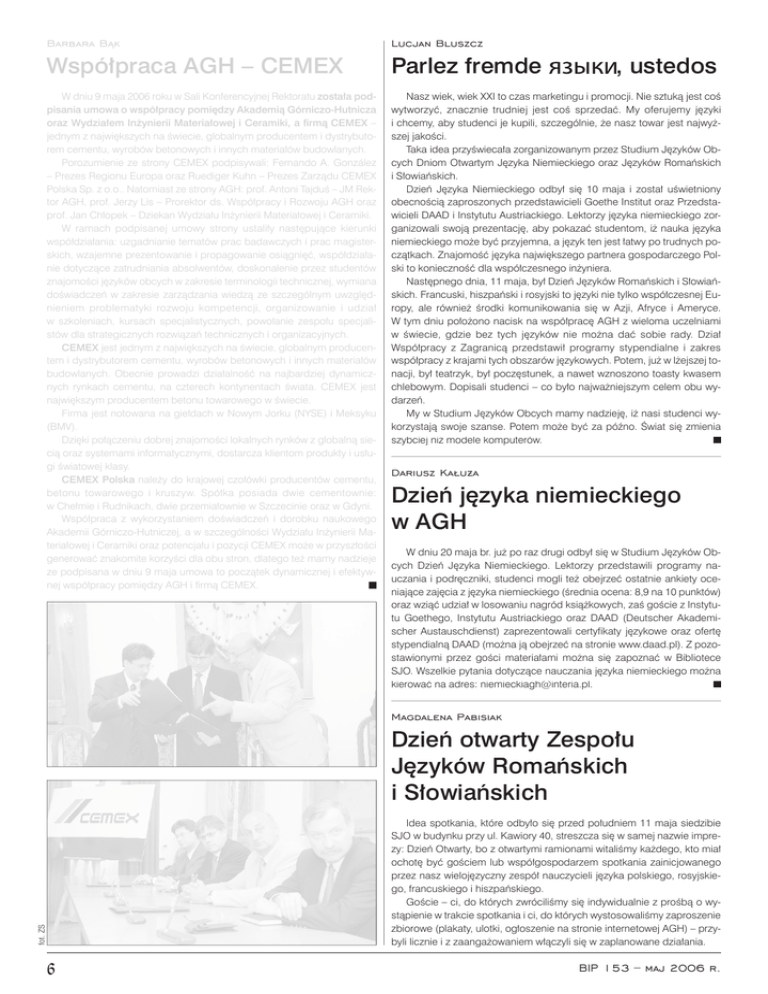 Barbara Bąk Lucjan Bluszcz Współpraca AGH – CEMEX Parlez fremde W dniu 9 maja 2006 roku w Sali Konferencyjnej Rektoratu została podpisania umowa o współpracy pomiędzy Akademią Górniczo-Hutnicza oraz Wydziałem Inżynierii Materiałowej i Ceramiki, a firmą CEMEX – jednym z największych na świecie, globalnym producentem i dystrybutorem cementu, wyrobów betonowych i innych materiałów budowlanych. Porozumienie ze strony CEMEX podpisywali: Fernando A. González – Prezes Regionu Europa oraz Ruediger Kuhn – Prezes Zarządu CEMEX Polska Sp. z o.o.. Natomiast ze strony AGH: prof. Antoni Tajduś – JM Rektor AGH, prof. Jerzy Lis – Prorektor ds. Współpracy i Rozwoju AGH oraz prof. Jan Chłopek – Dziekan Wydziału Inżynierii Materiałowej i Ceramiki. W ramach podpisanej umowy strony ustaliły następujące kierunki współdziałania: uzgadnianie tematów prac badawczych i prac magisterskich, wzajemne prezentowanie i propagowanie osiągnięć, współdziałanie dotyczące zatrudniania absolwentów, doskonalenie przez studentów znajomości języków obcych w zakresie terminologii technicznej, wymiana doświadczeń w zakresie zarządzania wiedzą ze szczególnym uwzględnieniem problematyki rozwoju kompetencji, organizowanie i udział w szkoleniach, kursach specjalistycznych, powołanie zespołu specjalistów dla strategicznych rozwiązań technicznych i organizacyjnych. CEMEX jest jednym z największych na świecie, globalnym producentem i dystrybutorem cementu, wyrobów betonowych i innych materiałów budowlanych. Obecnie prowadzi działalność na najbardziej dynamicznych rynkach cementu, na czterech kontynentach świata. CEMEX jest największym producentem betonu towarowego w świecie. Firma jest notowana na giełdach w Nowym Jorku (NYSE) i Meksyku (BMV). Dzięki połączeniu dobrej znajomości lokalnych rynków z globalną siecią oraz systemami informatycznymi, dostarcza klientom produkty i usługi światowej klasy. CEMEX Polska należy do krajowej czołówki producentów cementu, betonu towarowego i kruszyw. Spółka posiada dwie cementownie: w Chełmie i Rudnikach, dwie przemiałownie w Szczecinie oraz w Gdyni. Współpraca z wykorzystaniem doświadczeń i dorobku naukowego Akademii Górniczo-Hutniczej, a w szczególności Wydziału Inżynierii Materiałowej i Ceramiki oraz potencjału i pozycji CEMEX może w przyszłości generować znakomite korzyści dla obu stron, dlatego też mamy nadzieje ze podpisana w dniu 9 maja umowa to początek dynamicznej i efektywnej współpracy pomiędzy AGH i firmą CEMEX. Nasz wiek, wiek XXI to czas marketingu i promocji. Nie sztuką jest coś wytworzyć, znacznie trudniej jest coś sprzedać. My oferujemy języki i chcemy, aby studenci je kupili, szczególnie, że nasz towar jest najwyższej jakości. Taka idea przyświecała zorganizowanym przez Studium Języków Obcych Dniom Otwartym Języka Niemieckiego oraz Języków Romańskich i Słowiańskich. Dzień Języka Niemieckiego odbył się 10 maja i został uświetniony obecnością zaproszonych przedstawicieli Goethe Institut oraz Przedstawicieli DAAD i Instytutu Austriackiego. Lektorzy języka niemieckiego zorganizowali swoją prezentację, aby pokazać studentom, iż nauka języka niemieckiego może być przyjemna, a język ten jest łatwy po trudnych początkach. Znajomość języka największego partnera gospodarczego Polski to konieczność dla współczesnego inżyniera. Następnego dnia, 11 maja, był Dzień Języków Romańskich i Słowiańskich. Francuski, hiszpański i rosyjski to języki nie tylko współczesnej Europy, ale również środki komunikowania się w Azji, Afryce i Ameryce. W tym dniu położono nacisk na współpracę AGH z wieloma uczelniami w świecie, gdzie bez tych języków nie można dać sobie rady. Dział Współpracy z Zagranicą przedstawił programy stypendialne i zakres współpracy z krajami tych obszarów językowych. Potem, już w lżejszej tonacji, był teatrzyk, był poczęstunek, a nawet wznoszono toasty kwasem chlebowym. Dopisali studenci – co było najważniejszym celem obu wydarzeń. My w Studium Języków Obcych mamy nadzieję, iż nasi studenci wykorzystają swoje szanse. Potem może być za późno. Świat się zmienia szybciej niż modele komputerów. , ustedos Dariusz Kałuża Dzień języka niemieckiego w AGH W dniu 20 maja br. już po raz drugi odbył się w Studium Języków Obcych Dzień Języka Niemieckiego. Lektorzy przedstawili programy nauczania i podręczniki, studenci mogli też obejrzeć ostatnie ankiety oceniające zajęcia z języka niemieckiego (średnia ocena: 8,9 na 10 punktów) oraz wziąć udział w losowaniu nagród książkowych, zaś goście z Instytutu Goethego, Instytutu Austriackiego oraz DAAD (Deutscher Akademischer Austauschdienst) zaprezentowali certyfikaty językowe oraz ofertę stypendialną DAAD (można ją obejrzeć na stronie www.daad.pl). Z pozostawionymi przez gości materiałami można się zapoznać w Bibliotece SJO. Wszelkie pytania dotyczące nauczania języka niemieckiego można kierować na adres: [email protected]. Magdalena Pabisiak Dzień otwarty Zespołu Języków Romańskich i Słowiańskich fot. ZS Idea spotkania, które odbyło się przed południem 11 maja siedzibie SJO w budynku przy ul. Kawiory 40, streszcza się w samej nazwie imprezy: Dzień Otwarty, bo z otwartymi ramionami witaliśmy każdego, kto miał ochotę być gościem lub współgospodarzem spotkania zainicjowanego przez nasz wielojęzyczny zespół nauczycieli języka polskiego, rosyjskiego, francuskiego i hiszpańskiego. Goście – ci, do których zwróciliśmy się indywidualnie z prośbą o wystąpienie w trakcie spotkania i ci, do których wystosowaliśmy zaproszenie zbiorowe (plakaty, ulotki, ogłoszenie na stronie internetowej AGH) – przybyli licznie i z zaangażowaniem włączyli się w zaplanowane działania. 6 BIP 153 – maj 2006 r. fot. ZS W programie udało nam się zawrzeć wiele wątków: prezenta