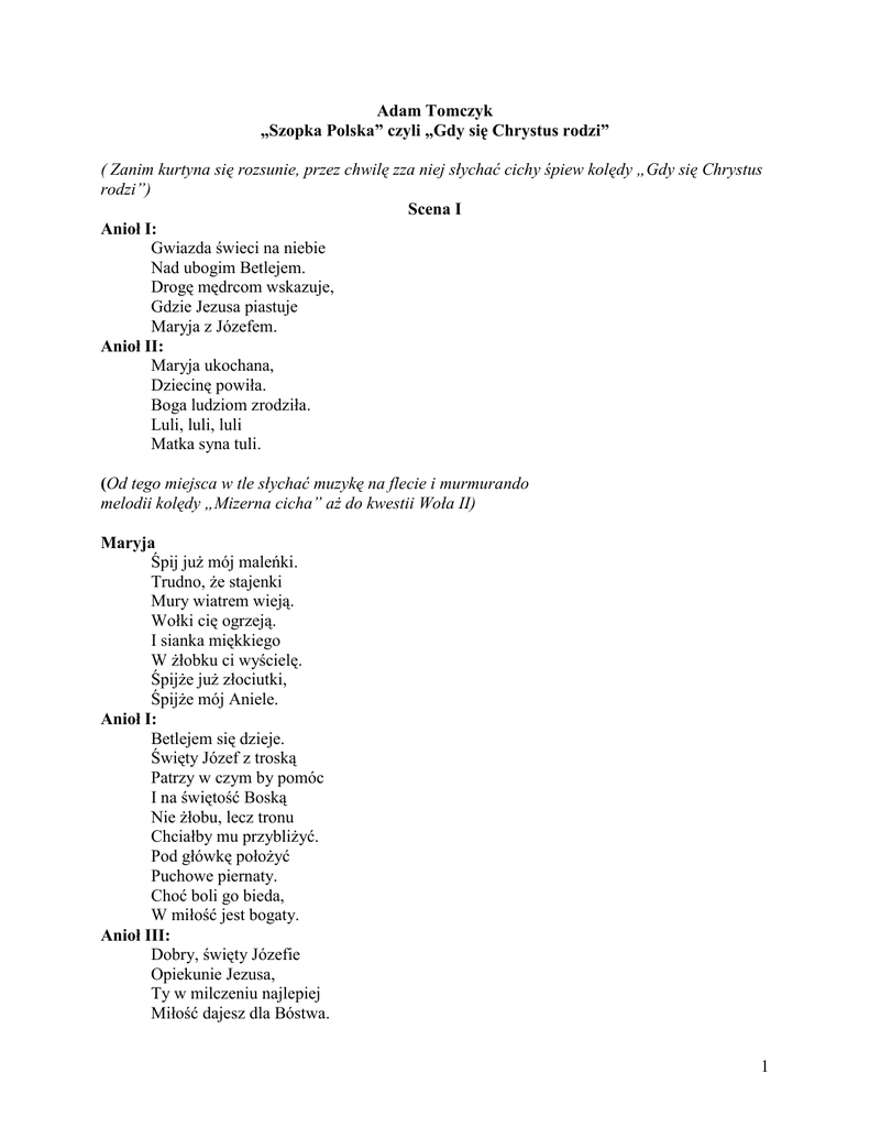 Adam Tomczyk „Szopka Polska” czyli „Gdy się Chrystus rodzi” ( Zanim kurtyna się rozsunie, przez chwilę zza niej słychać cichy śpiew kolędy „Gdy się Chrystus rodzi”) Scena I Anioł I: Gwiazda świeci na niebie Nad ubogim Betlejem. Drogę mędrcom wskazuje, Gdzie Jezusa piastuje Maryja z Józefem. Anioł II: Maryja ukochana, Dziecinę powiła. Boga ludziom zrodziła. Luli, luli, luli Matka syna tuli. (Od tego miejsca w tle słychać muzykę na flecie i murmurando melodii kolędy „Mizerna cicha” aż do kwestii Woła II) Maryja Śpij już mój maleńki. Trudno, że stajenki Mury wiatrem wieją. Wołki cię ogrzeją. I sianka miękkiego W żłobku ci wyścielę. Śpijże już złociutki, Śpijże mój Aniele. Anioł I: Betlejem się dzieje. Święty Józef z troską Patrzy w czym by pomóc I na świętość Boską Nie żłobu, lecz tronu Chciałby mu przybliżyć. Pod główkę położyć Puchowe piernaty. Choć boli go bieda, W miłość jest bogaty. Anioł III: Dobry, święty Józefie Opiekunie Jezusa, Ty w milczeniu najlepiej Miłość dajesz dla Bóstwa. 1 Anioł II: Szuru, szuru, buru Zwierzęta do wtóru; U żłobu osiołki, Spracowane wołki Cicho sianko żują, Ludziom się dziwują. Wół I: Jakże to się godzi, Bóg się w stajni rodzi? W żłobie położony Król, a bez korony? Osioł: Nikt go tu nie wita? Gdzie jest orszak, świta? Gdzie marszałek dworu? Muzyka wesoła? Gdzie ciepłe komnaty I królewskie szaty? Anioł III: Ale tak być miało, Że w stajni ubogo. O tym już wieszczyli Od wieków prorocy, Że z rodu Dawida, W Betlejemskiej nocy Narodzi się Jezus Dla świata Zbawiciel, Grzechów Odkupiciel. Wół II: Ale cicho, ktoś nadchodzi! Chociaż dzisiaj się nam godzi Porozmawiać ludzkim słowem. Jakąś obcą słyszę mowę. Król Bezdomnych: Witaj dziecię narodzone Przez proroków ogłoszone. Przybywamy trzej królowie… Król Bezrobotnych: By okazać Twej osobie Cześć należną, ukłon niski. Skromne dary do kołyski Niesiem Twojej ze stron różnych. Przyjmij Jezu od podróżnych. Król Emigrantów: Gwiazda drogę nam wskazała, 2 Oświetliła jasno grotę. Rzecz to w świecie niebywała Bóg się rodzi w nędznej szopie? Król Bezdomnych: I ja biedy znam niemało, I chłód nocy bez poduszki. Jestem królem rzesz bezdomnych. W darze daję wiarę szczerą I modlitwy te dziękczynne Za przytułki w czas zimowy, I sny moje i marzenia Własny kąt mieć dla schronienia. Król Bezrobotnych: Jam jest królem bezrobotnych Z serca wręczam Ci nadzieję Na odmianę losów naszych, Aby pracy było wiele Godnie płatnej w naszym kraju. By nie było odtrącenia. Ty rozumiesz nas najlepiej, Bo znasz boleść poniżenia. Król Emigrantów: Ja na obcej żyję ziemi, Gdzie na emigracyjnym chlebie Tęsknię, wzdycham do rodziny, Modlę Jezu się do Ciebie. Utul Boże mą nostalgię. Ja król emigranckiej rzeszy W darze miłość Tobie daję, Wierną pamięć po wsze czasy Dni zaczętych znakiem krzyża, Słów ojczystych polskich wierszy, Zapach kwiatów łąk nadrzecznych I przyjaźni tych najpierwszych. Szczerych modlitw, myśli czystych I smak chleba pól pszenicznych. Przyjmij Jezu narodzony I daj łaskę nam powrotu Do Itaki wymarzonej, Ziemi Ojców utęsknionej. (Królowie kłaniają się Jezuskowi w żłóbku i odchodzą. Aniołowie zostają. Józef z Maryją zasypiają. Po chwili Aniołowie podchodzą do Józefa i mówią z perswazją) Anioł II: Zbudź się, zbudź się już Józefie, Niech nie morzy Cię sen błogi. 3 Zabierz dziecko i Maryję, Szykuj szybko się do drogi. Anioł I: Kły już sroży Herod krwawy. By Jezusa zamordować, Wysłał za nim pościg żwawy. Ciężkie zbroje, ostre miecze W oczach złość i srogość błyska. Lament matek i płacz dzieci. Herod pętlę już zaciska. Anioł II: Rzeź się dzieje w całym kraju Krwi niewinnej rzeka płynie, Nie śpij! Obudź się Józefie! Ratuj życie swej rodzinie. Anioł III: Do Egiptu długa droga. Ja bezpieczny szlak Wam wskażę, Gdzie spotkacie dobrych ludzi, Co wędrowcom pomoc dadzą. Musisz tylko się obudzić, Przed Heroda uciec władzą. (Aniołowie odchodzą, przychodzi Duch z przyszłości) Józef: ( Budzi się i mówi do siebie z niedowierzaniem) Aniołowie mi się śnili? Nie wiem; we śnie, czy na jawie byli? Do Egiptu iść kazali. (lekko trąca Maryję) Zbudź się Mario! Duch z przyszłości: Idź zamelduj w Gminie dziecię! W statystykach numer ważny. Sam wiesz o tym już najlepiej, Do rejestru idziesz przecież. Gdy się rodzi nowy człowiek Należy się becikowe. Maria: Co on gada? Co on plecie? Becikowe? Zameldować w Gminie dziecię? Józef: Nie wiem Mario. Mara senna? Duch z przyszłości: A gdy będziesz już w Egipcie Na Facebooka podrzuć zdjęcie. Wszyscy będą ci zazdrościć. Twoja wartość wtedy wzrośnie. 4 Maria: Co on mówi? Co on prawi? Jaki facebook? Jakie zdjęcie? Józef: To Duch pewnie z przyszłych wieków. Bałamuci prostych ludzi. Słabych stron szuka w człowieku. A nam trzeba się obudzić. Bierz Jezusa! Nam uciekać stąd potrzeba! Herod w krwawy pościg rusza, Taki głos słyszałem z nieba. (Zbierają się i odchodzą. Kurtyna) Scena II (Trzech Aniołów stoi w kącie izby. Domownicy krzątają się przy swoich zajęciach przedświątecznych) Anioł I: Zima śnieżna na dworze, Mróz siarczysty skuł ziemię. W ciepłej izbie mój Boże Niech się rodzi zbawienie. Anioł II: Od tej chwili na wieki, Jak nie było, niech będzie, Niech śpiewają w kolędzie, Że czekają go wszędzie. Anioł III: W każdym domu, zajeździe Serca ludzkie z ochotą Oczekują dziś wieczór, Że narodzi się Jezus. Anioł I: W sianku u stóp choinki I w opłatku bieluchnym Pełnym życzeń najszczerszych, By nikt nie był dziś smutny. Anioł II: I w pasterce północnej W rozśpiewanym kościele Jasność taka dokoła, Że moc od niej truchleje. 5 Anioł III: I w dniach zwykłych, codziennych Niech się dzieje Betlejem. *** Kasia: ( przyśpiewuje sobie p