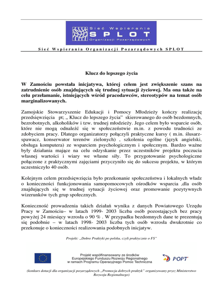 Sie Wspierania Organizacji Pozarz dowych SPLOT Klucz do lepszego ycia W Zamo ciu powstała inicjatywa, której celem jest zwi kszenie szans na zatrudnienie osób znajduj cych si trudnej sytuacji yciowej. Ma ona tak e na celu przełamanie, istniej cych w ród pracodawców, stereotypów na temat osób marginalizowanych. Zamojskie Stowarzyszenie Edukacji i Pomocy Młodzie y ko czy realizacj przedsi wzi cia pt; „ Klucz do lepszego ycia” skierowanego do osób bezdomnych, bezrobotnych, alkoholików i tzw. trudnej młodzie y. Jego celem było wsparcie osób, które nie mog odnale si w społecze stwie m.in. z powodu trudno ci ze zdobyciem pracy. Dlatego organizatorzy poł czyli praktyczne kursy ( m.in. lusarzspawacz, konserwator terenów zielonych) , szkolenia ogólne (j zyk angielski, obsługa komputera) ze wsparciem psychologicznym i społecznym. Bardzo wa ne były działania maj ce na celu odzyskanie przez uczestników projektu poczucia własnej warto ci i wiary we własne siły. To przygotowanie psychologiczne poł czone z praktycznymi zaj ciami przyczyniło si do sukcesu projektu, w którym uczestniczyło 40 osób. Kolejnym celem przedsi wzi cia było przekonanie społecze stwa i lokalnych władz o konieczno ci funkcjonowania samopomocowych o rodków wsparcia ,dla osób znajduj cych si w trudnej sytuacji yciowej oraz promowanie pozytywnych wizerunków tych grup społecznych. Konieczno prowadzenia takich działa wynika z danych Powiatowego Urz du Pracy w Zamo ciu– w latach 1999- 2003 liczba osób pozostaj cych bez pracy powy ej 24 miesi cy wzrosła o 90 % . W przypadku bezdomnych dane te prezentuj si podobnie – w latach 1998- 2003 liczba tych osób wzrosła dwukrotnie co przekonuje o konieczno ci realizowania podobnych inicjatyw. Projekt: „Dobre Praktyki po polsku, czyli praktycznie o FS” (konkurs dotacji dla organizacji pozarz dowych „Promocja dobrych praktyk” organizowany przez Ministerstwo Rozwoju Regionalnego) Przedsi wzi cie pt: „ Klucz do lepszego ycia” jest realizowane od 01.08.2005 ze rodków Europejskiego Funduszu Społecznego. Wi cej informacji na temat projektu mo na uzyska u koordynatora projektu- Pani Magdaleny Kurdzielewskiej- tel. 084 638 46 31. Projekt: „Dobre Praktyki po polsku, czyli praktycznie o FS” (konkurs dotacji dla organizacji pozarz dowych „Promocja dobrych praktyk” organizowany przez Ministerstwo Rozwoju Regionalnego)