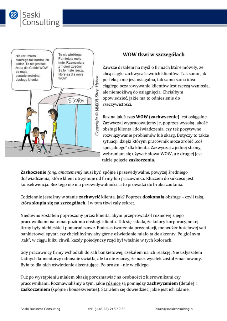 WOW tkwi w szczegółach Zawsze drżałem na myśl o firmach które mówiły, że chcą ciągle zachwycać swoich klientów. Tak samo jak perfekcja nie jest osiągalna, tak samo sama idea ciągłego oczarowywanie klientów jest rzeczą wzniosłą, ale niemożliwą do osiągnięcia. Chciałbym opowiedzieć, jakie ma to odniesienie do rzeczywistości. Raz na jakiś czas WOW (zachwycenie) jest osiągalne. Zazwyczaj wypracowujemy je, poprzez wysoką jakość obsługi klienta i doświadczenia, czy też pozytywne rozwiązywanie problemów lub skarg. Dotyczy to także sytuacji, dzięki którym pracownik może zrobić „coś specjalnego” dla klienta. Zazwyczaj z jednej strony, wzbraniam się używać słowa WOW, a z drugiej jest także pojęcie zaskoczenia. Zaskoczenie (ang. amazement) musi być spójne i przewidywalne, powyżej średniego doświadczenia, które klient otrzymuje od firmy lub pracownika. Kluczem do sukcesu jest konsekwencja. Bez tego nie ma przewidywalności, a to prowadzi do braku zaufania. Codziennie jesteśmy w stanie zachwycić klienta. Jak? Poprzez doskonałą obsługę – czyli taką, która skupia się na szczegółach. I w tym tkwi cały sekret. Niedawno zostałem poproszony przez klienta, abym przeprowadził rozmowę z jego pracownikami na temat poziomu obsługi. klienta. Tak się składa, że kolory korporacyjne tej firmy były niebieskie i pomarańczowe. Podczas tworzenia prezentacji, menedżer hotelowej sali bankietowej spytał, czy chcielibyśmy aby górne oświetlenie miało takie akcenty. Po głośnym „tak”, w ciągu kilku chwil, każdy pojedynczy rząd był właśnie w tych kolorach. Gdy pracownicy firmy wchodzili do sali bankietowej, czekałem na ich reakcję. Nie usłyszałem żadnych komentarzy odnośnie światła, ale to nie znaczy, że nasz wysiłek został zmarnowany. Było to dla nich oświetlenie akcentujące. Po prostu - nic wielkiego. Tuż po wystąpieniu miałem okazję porozmawiać na osobności z kierownikami czy pracownikami. Rozmawialiśmy o tym, jakie różnice są pomiędzy zachwyceniem (detale) i zaskoczeniem (spójne i konsekwentne). Starałem się dowiedzieć, jakie jest ich zdanie. Saski Business Consulting tel: (+48 22) 218 59 30 [email protected] Żaden z nich wcześniej nie zauważył kolorowych świateł, więc poprosiłem ich, aby spojrzeli w górę i zwrócili na nie uwagę. Kilka osób wstrzymało oddech z zachwycenia, a kilka osób użyło słowa "WOW". Niech historia o oświetleniu służy jako metafora tego, co jest możliwe, gdy wymieszamy małe, ale potężne szczegóły, z niesamowitym doświadczeniem obsługi klienta. A Ty, jakie elementy możesz uatrakcyjnić do takiego poziomu, w którym Twoi klienci powiedzą: "WOW !? autor: Shep Hyken - ekspert ds. customer care, mówca oraz autor ze szczytów listy bestsellerów biznesowych „New York Timesa” źródło: http://hyken.com/customer-experience-2/wow-is-in-the-details/ tłumaczenie: Saski Business Consulting