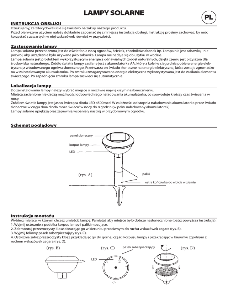 LAMPY SOLARNE PL INSTRUKCJA OBSŁUGI Dziękujemy, że zdecydowaliście się Państwo na zakup naszego produktu. Przed pierwszym użyciem należy dokładnie zapoznać się z niniejszą instrukcją obsługi. Instrukcję prosimy zachować, by móc korzystać z zawartych w niej wskazówek również w przyszłości. Zastosowanie lampy Lampa solarna przeznaczona jest do oświetlania nocą ogrodów, ścieżek, chodników altanek itp. Lampa nie jest zabawką - nie pozwól, aby urządzenie było używane jako zabawka. Lampa nie nadaje się do użytku w wodzie. Lampa solarna jest produktem wykorzystującym energię z odnawialnych źródeł naturalnych, dzięki czemu jest przyjazna dla środowiska naturalnego. Źródło światła lampy zasilane jest z akumulatorka AA, który z kolei w ciągu dnia pobiera energię elektryczną z wbudowanego ogniwa słonecznego. Przetwarza on światło słoneczne na energie elektryczną, która zostaje zgromadzona w zainstalowanym akumulatorku. Po zmroku zmagazynowana energia elektryczna wykorzystywana jest do zasilania elementu świecącego. Po zapadnięciu zmroku lampa zaświeci się automatycznie. Lokalizacja lampy Do zainstalowania lampy należy wybrać miejsce o możliwie największym nasłonecznieniu. Miejsca zacienione nie dadzą możliwości odpowiedniego naładowania akumulatorka, co spowoduje krótszy czas świecenia w nocy. Źródłem światła lampy jest jasno świecąca dioda LED 4500mcd. W zależności od stopnia naładowania akumulatorka przez światło słoneczne w ciągu dnia dioda może świecić w nocy do 8 godzin (w pełni naładowany akumulatorek). Lampy solarne upiększą oraz zapewnią wspaniały nastrój w przydomowym ogródku. Schemat poglądowy panel słoneczny korpus lampy LED paliki (rys. A) ostra końcówka do wbicia w ziemię Instrukcja montażu Wybierz miejsce, w którym chcesz umieścić lampę. Pamiętaj, aby miejsce było dobrze nasłonecznione (patrz powyższa instrukcja). 1. Wyjmij ostrożnie z pudełka korpus lampy i paliki mocujące. 2. Zdemontuj przezroczysty klosz obracając go w kierunku przeciwnym do ruchu wskazówek zegara (rys. B). 3. Wyjmij foliowy pasek zabezpieczający (rys. C). 4. Ostrożnie załóż przezroczysty klosz przykładając go do górnej części korpusu lampy i przekręcając w kierunku zgodnym z ruchem wskazówek zegara (rys. D). (rys. B) (rys. C) LED -1- pasek zabezpieczający (rys. D) 5. Połącz ze sobą paliki mocujące, wbij je w ziemię ostrą końcówką. Następnie umieść korpus lampy na końcu palika. (Patrz rys. E.) (B) (rys. E) (A) ziemia Wskazówki 1. Nie naciskaj na górną część lampy (mogłoby dojść do uszkodzenia ogniwa słonecznego i czułej elektroniki). 2. Pamiętaj, że lampa solarna została zaprojektowana do świecenia po zmroku. Z tego względu lampę należy umieścić z dala od sztucznych źródeł światła, tj. oświetlenia ulicznego, oświetlenia ganku – w przeciwnym razie lampa nie włączy się automatycznie lub będzie świecić bardzo słabo. 3. Pomimo tego, iż akumulator został naładowany w fabryce, po dokonaniu zakupu akumulator będzie już prawdopodobnie rozładowany. Aby uzyskać maksymalne natężenie oświetlenia należy odczekać, aż akumulator ponownie się naładuje. Czyszczenie i przechowywanie Po paru dniach korpus lampy należy delikatnie przetrzeć ściereczką z kurzu i innych zabrudzeń. Dane techniczne Akumulatorek AA 1,2 V / 500 mAh Akumulatorek jest zasilany ogniwem słonecznym. Żywotność ogniwa słonecznego wynosi ponad 100 000 godzin. Z tego względu nie trzeba go wymieniać OCHRONA ŚRODOWISKA NATURALNEGO: Informacje dotyczące utylizacji urządzeń elektrycznych i elektronicznych. Po upływie okresu żywotności urządzenia, bądź z chwilą, kiedy naprawa przestaje być opłacalna, urządzenia nie należy wyrzucać do śmieci. W celu właściwej likwidacji urządzenia należy oddać w odpowiednich punktach zbioru, gdzie zostaną przyjęte bez pobierania opłaty. Przestrzegając zasad prawidłowej utylizacji pomagacie Państwo zachować cenne zasoby przyrody i zapobiegacie potencjalnym negatywnym wpływom na środowisko naturalne i ludzkie zdrowie, jakie mogłaby mieć niewłaściwa likwidacja odpadów. Dalsze szczegóły dotyczące utylizacji prosimy uzyskać w miejscowym urzędzie lub w najbliższym punkcie zbioru. Likwidacja niezgodna z przepisami może zostać ukarana grzywną zgodnie z przepisami obowiązującymi w danym kraju. Zużytych akumulatorków nie należy wyrzucać do kosza na śmieci, ale oddać w punkcie gwarantującym ich recykling. Serwisowanie W przypadku stwierdzenia po zakupieniu urządzenia jakichkolwiek wad lub uszkodzeń należy skontaktować się z autoryzowanym punktem serwisowym. Obsługując urządzenie należy przestrzegać zaleceń zawartych w instrukcji obsługi. Gwarancja traci ważność w przypadku niewłaściwego lub niezgodnego z instrukcją użytkowania urządzenia lub w przypadku samowolnych przeróbek i zmian konstrukcyjnych. Dystrybucja: TV PRODUCTS Sp. z o. o. Import do UE: TV PRODUCTS CZ s. r. o. Kraj pochodzenia: Chiny -2-